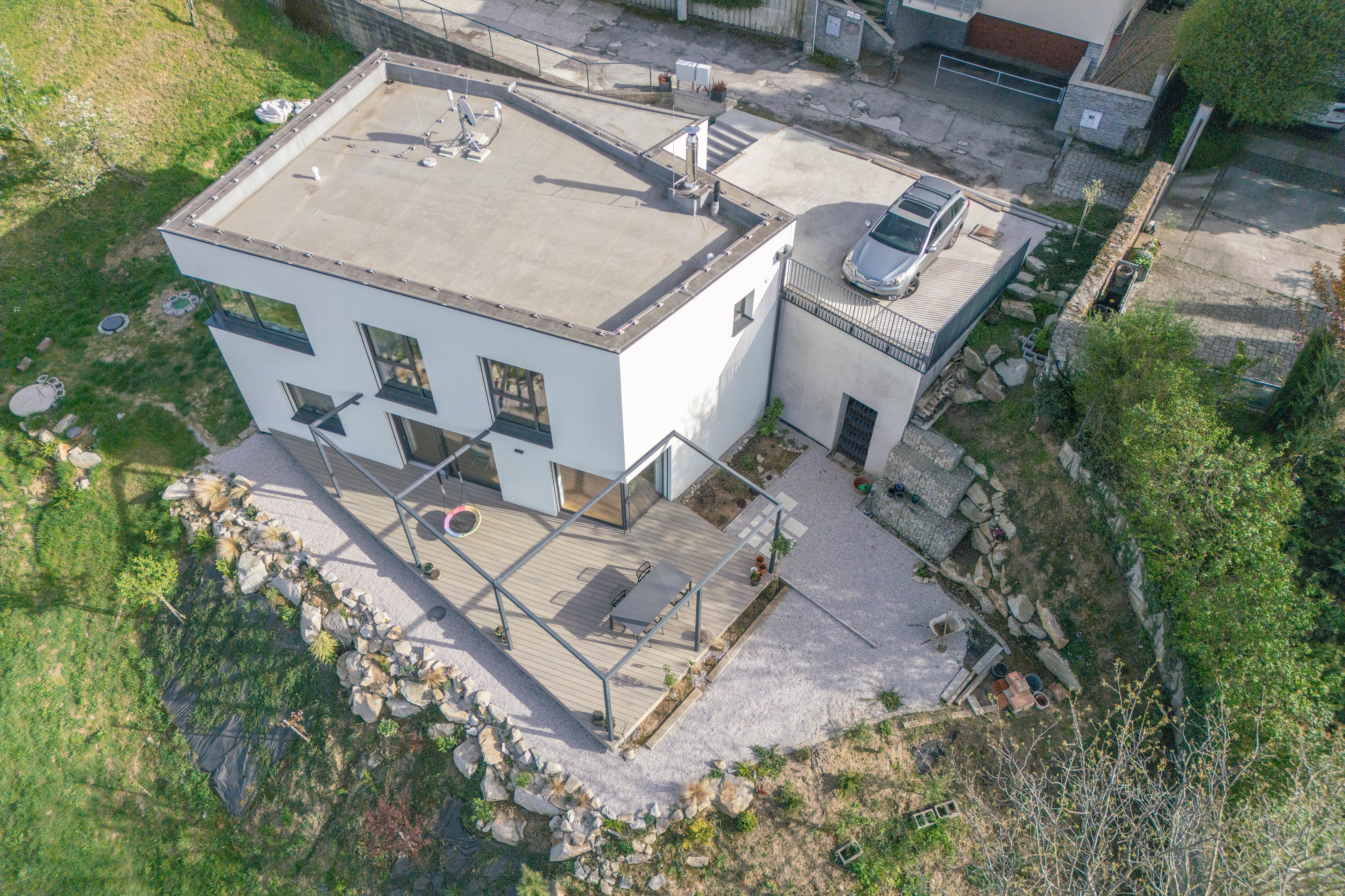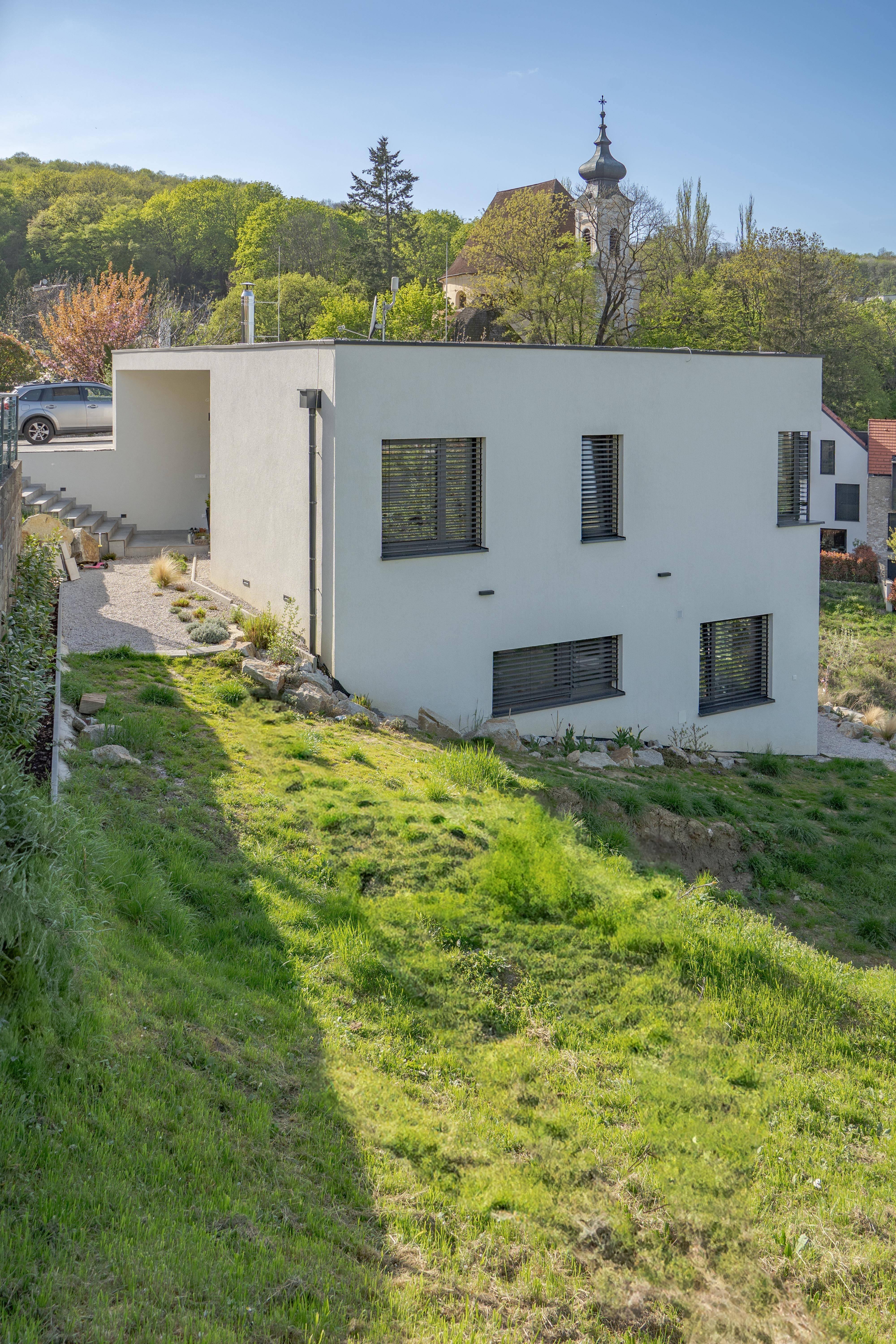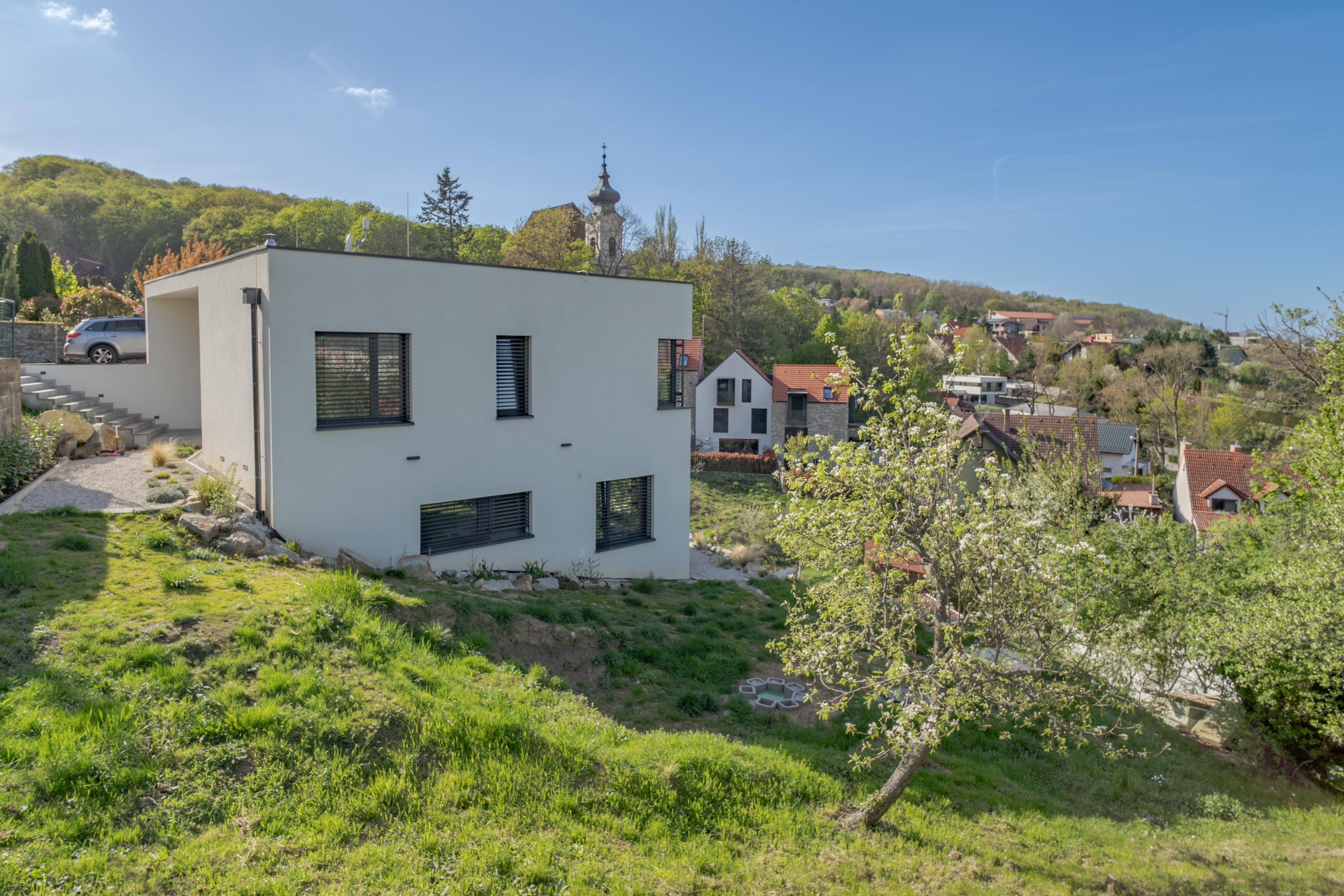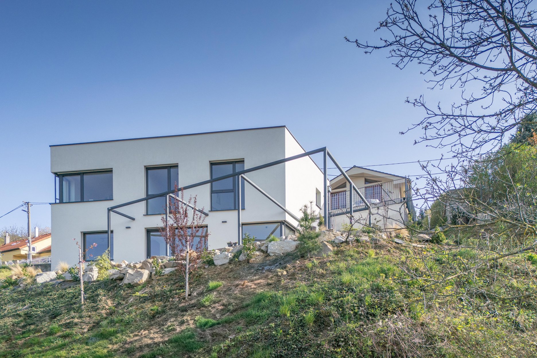 Dom z dielne architektky Edity Vráblovej reaguje na morfológiu terénu, prispôsobuje sa prostrediu a výhľadom, súčasne si však zachováva kompaktný výraz. Presklené nárožie obývačky rámuje pohľad na Kostol sv. Kozmu a Damiána. Dispozícia s diagonálnymi stenami minimalizuje klasické chodby a uprednostňuje otvorené obytné plochy. Do záhrady sa otvára prostredníctvom terasy s ľahkou oceľovou konštrukciou pre tieniace textílie či zavesený mobiliár...