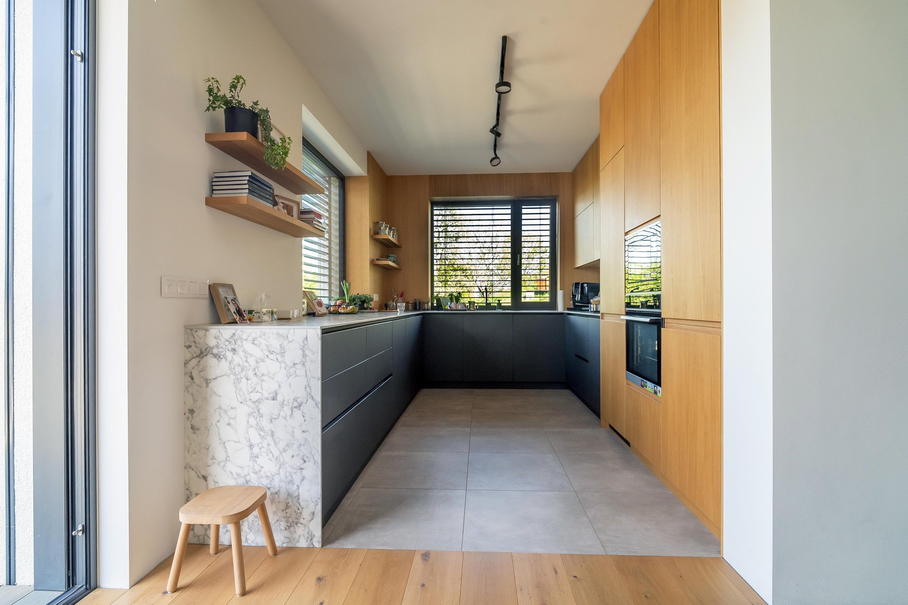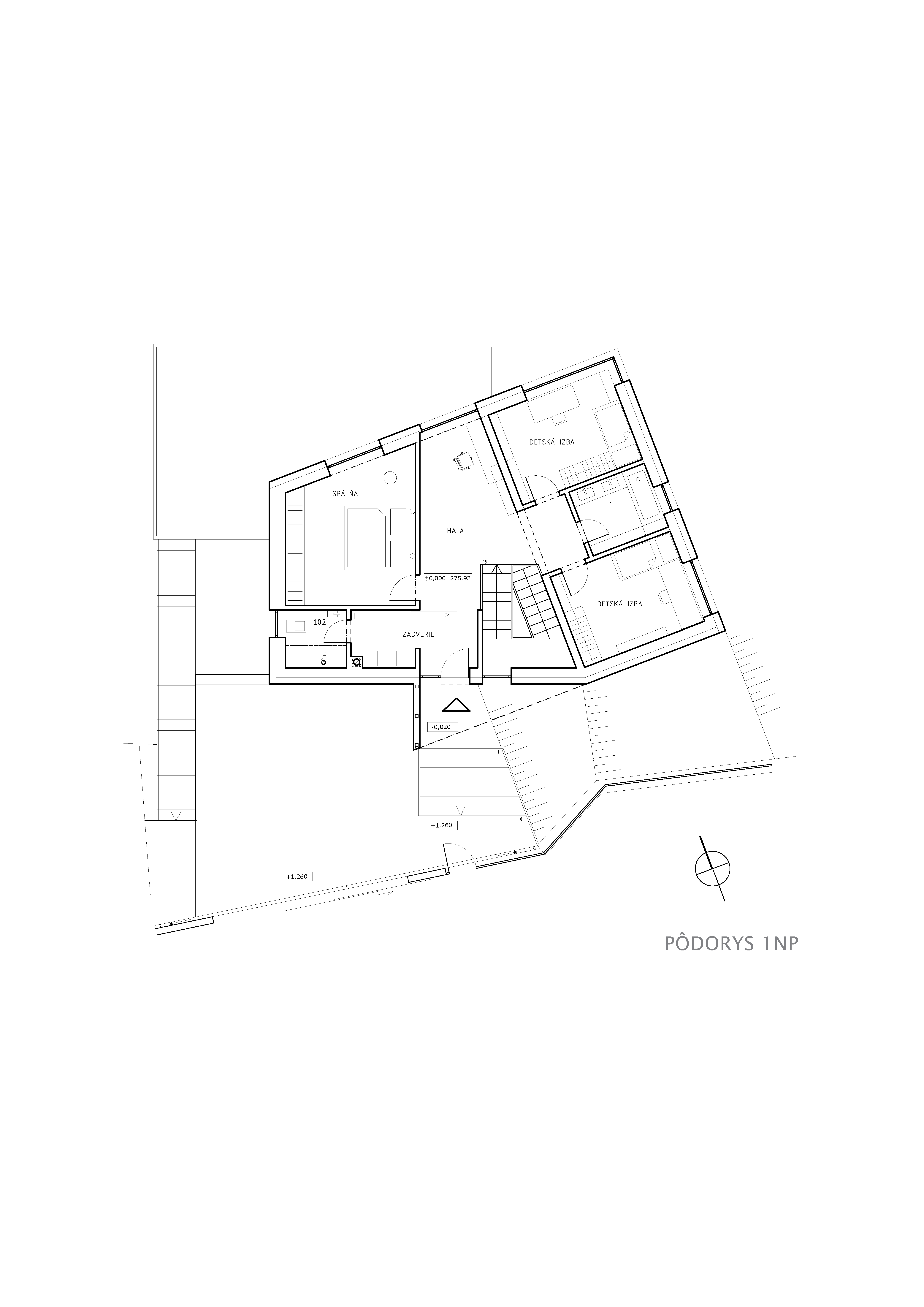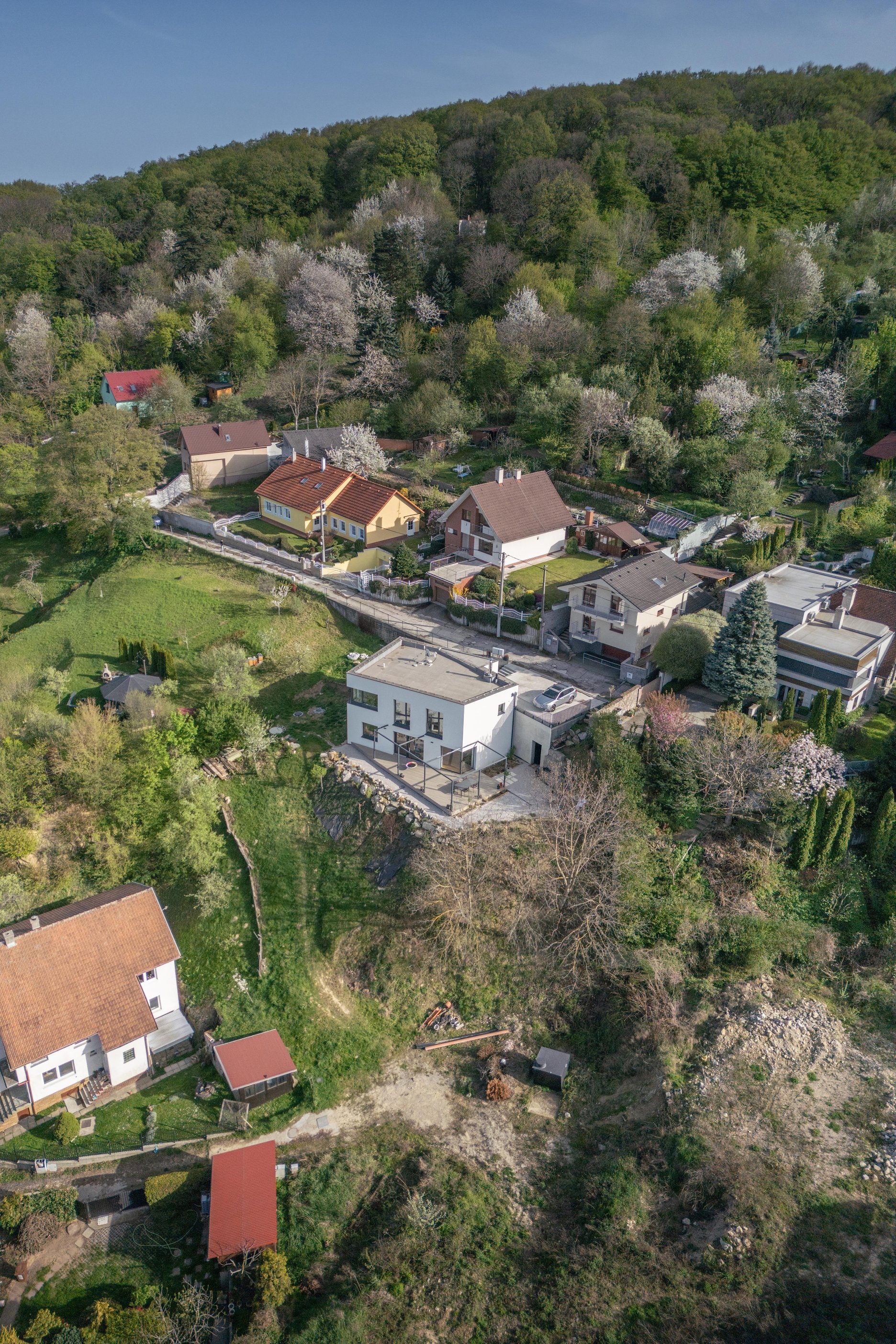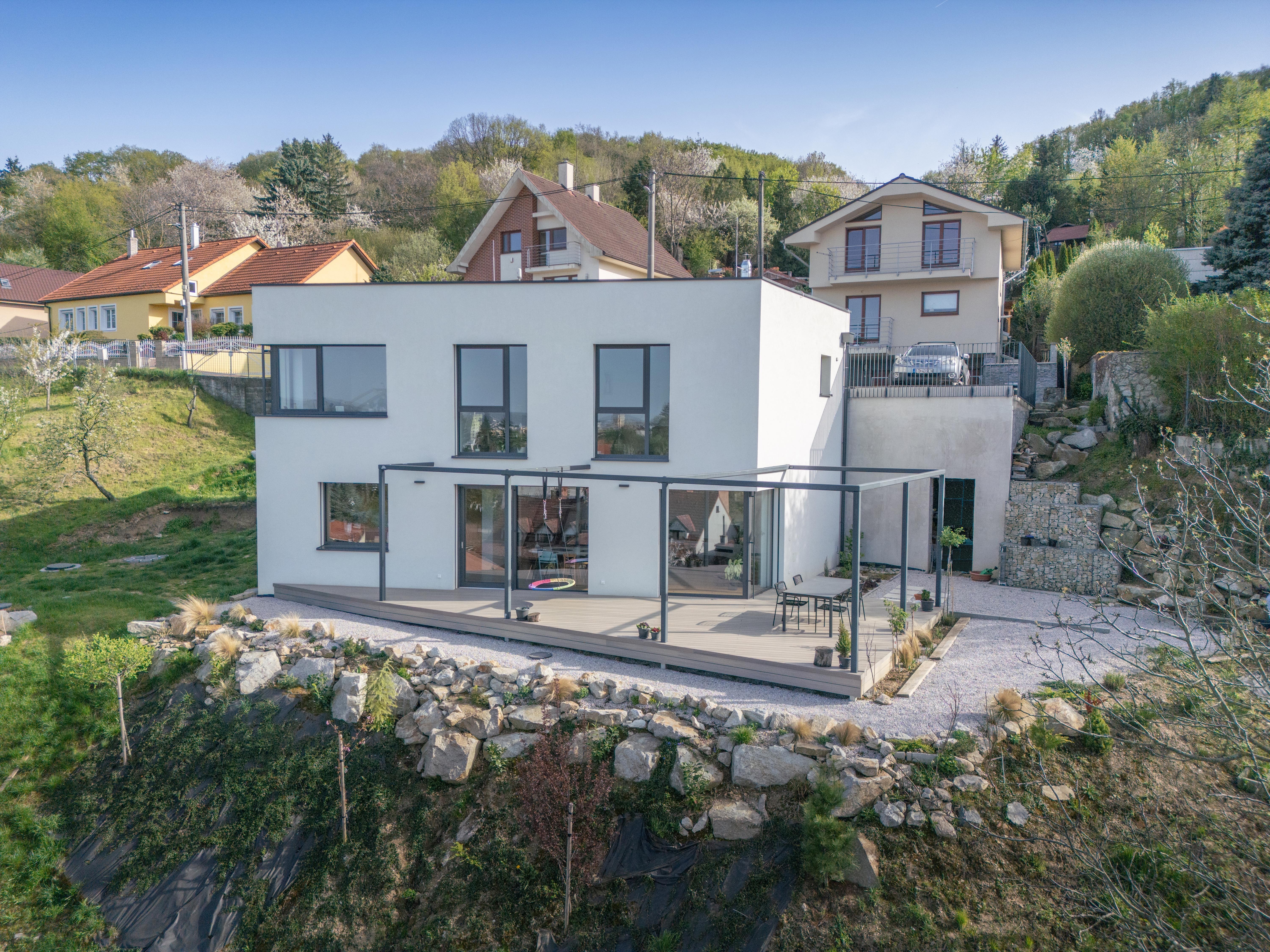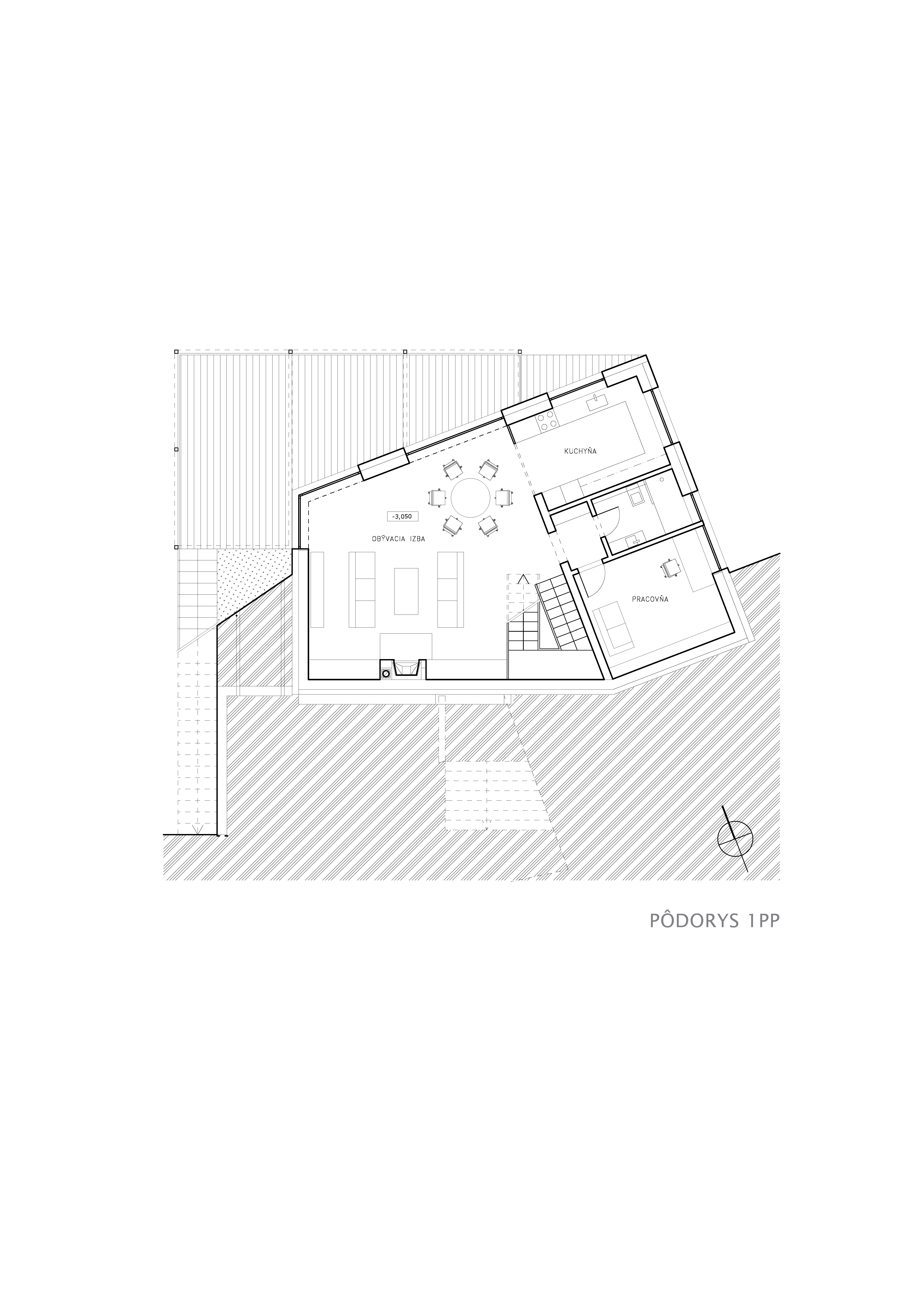 Dom z dielne architektky Edity Vráblovej reaguje na morfológiu terénu, prispôsobuje sa prostrediu a výhľadom, súčasne si však zachováva kompaktný výraz. Presklené nárožie obývačky rámuje pohľad na Kostol sv. Kozmu a Damiána. Dispozícia s diagonálnymi stenami minimalizuje klasické chodby a uprednostňuje otvorené obytné plochy. Do záhrady sa otvára prostredníctvom terasy s ľahkou oceľovou konštrukciou pre tieniace textílie či zavesený mobiliár...