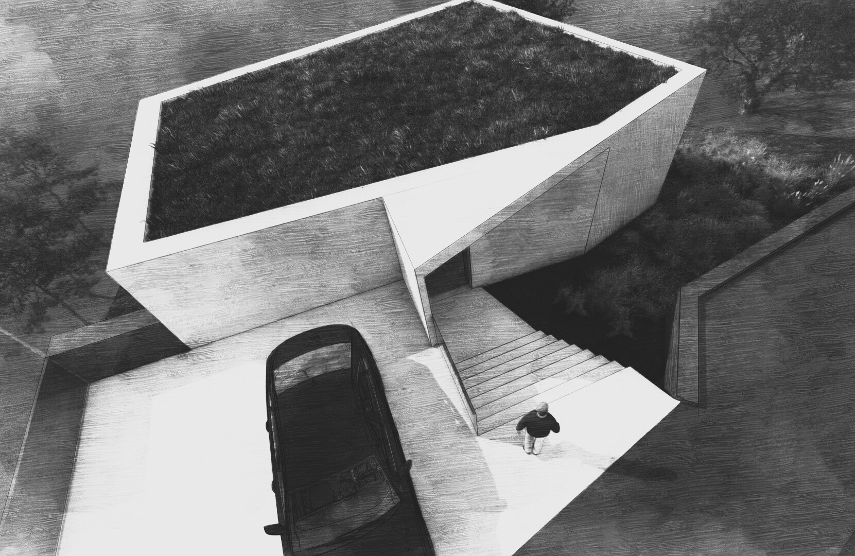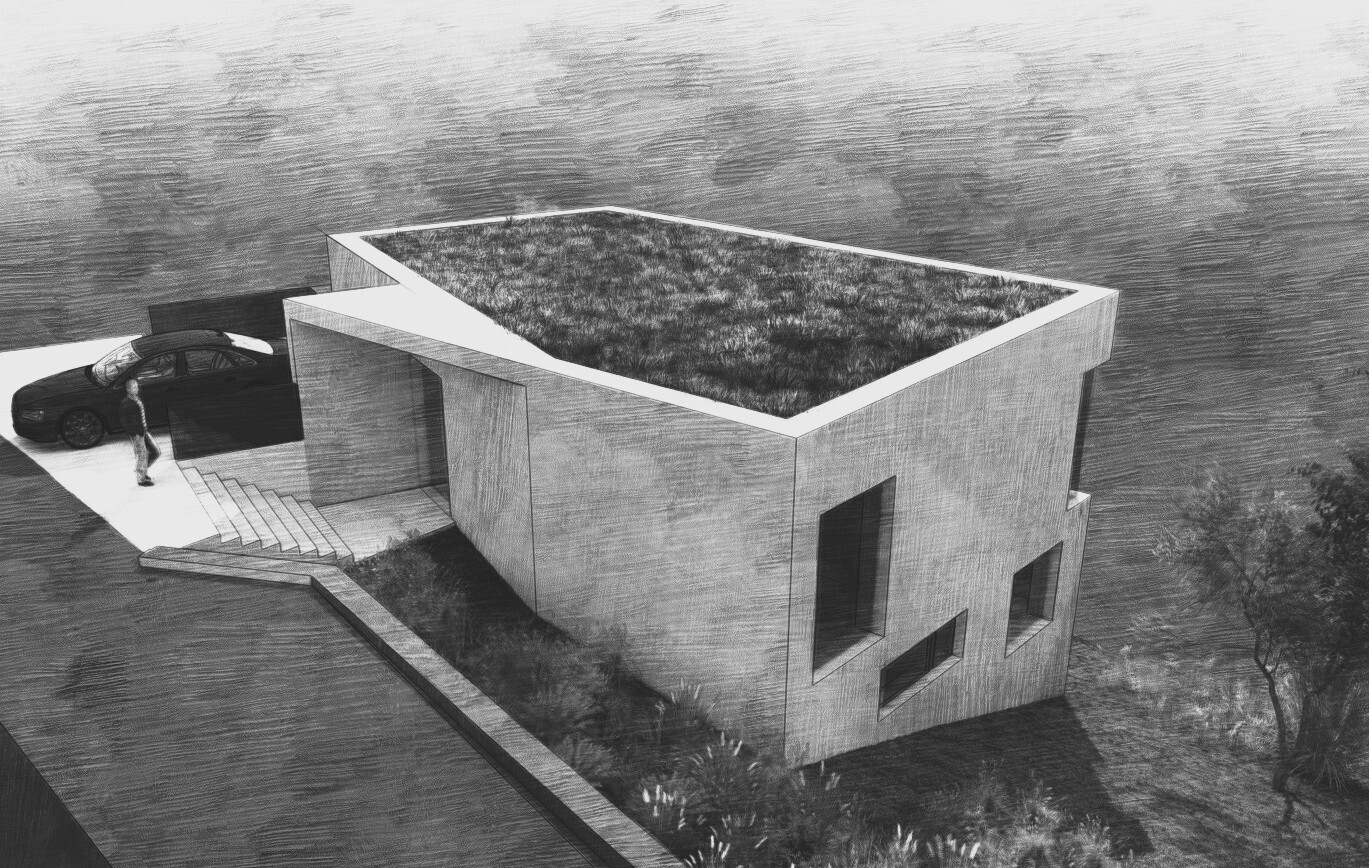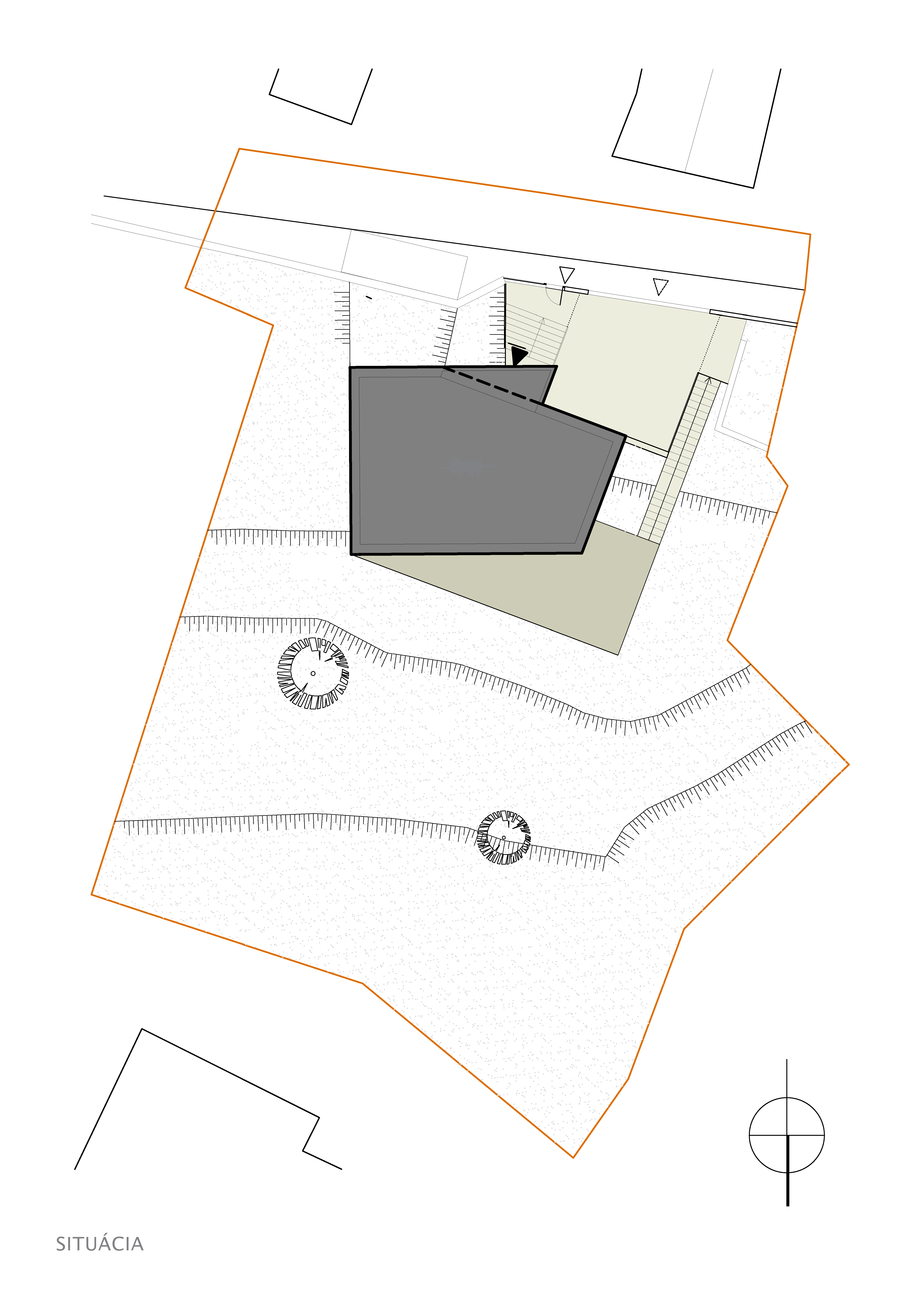 Svahovitý pozemok sa nachádza v obytnej zóne obkolesenej atraktívnym prírodným prostredím, rodinný dom je situovaný v jeho hornej časti. Kompozične ho tvorí jedna prísne kompaktná hmota s nepravidelným pozdĺžnym pôdorysom s plochou strechou. Diagonálne tvarovanie pôdorysu dôsledne reaguje na morfológiu veľmi strmého stavebne náročného terénu a zároveň orientáciu hlavných fasád na príťažlivé dominanty v okolí. Presklené nárožie obývacej izby ponúka priamy pohľad na Kostol sv. Kozmu a Damiána - jednu z najstarších dominánt tejto mestskej časti.