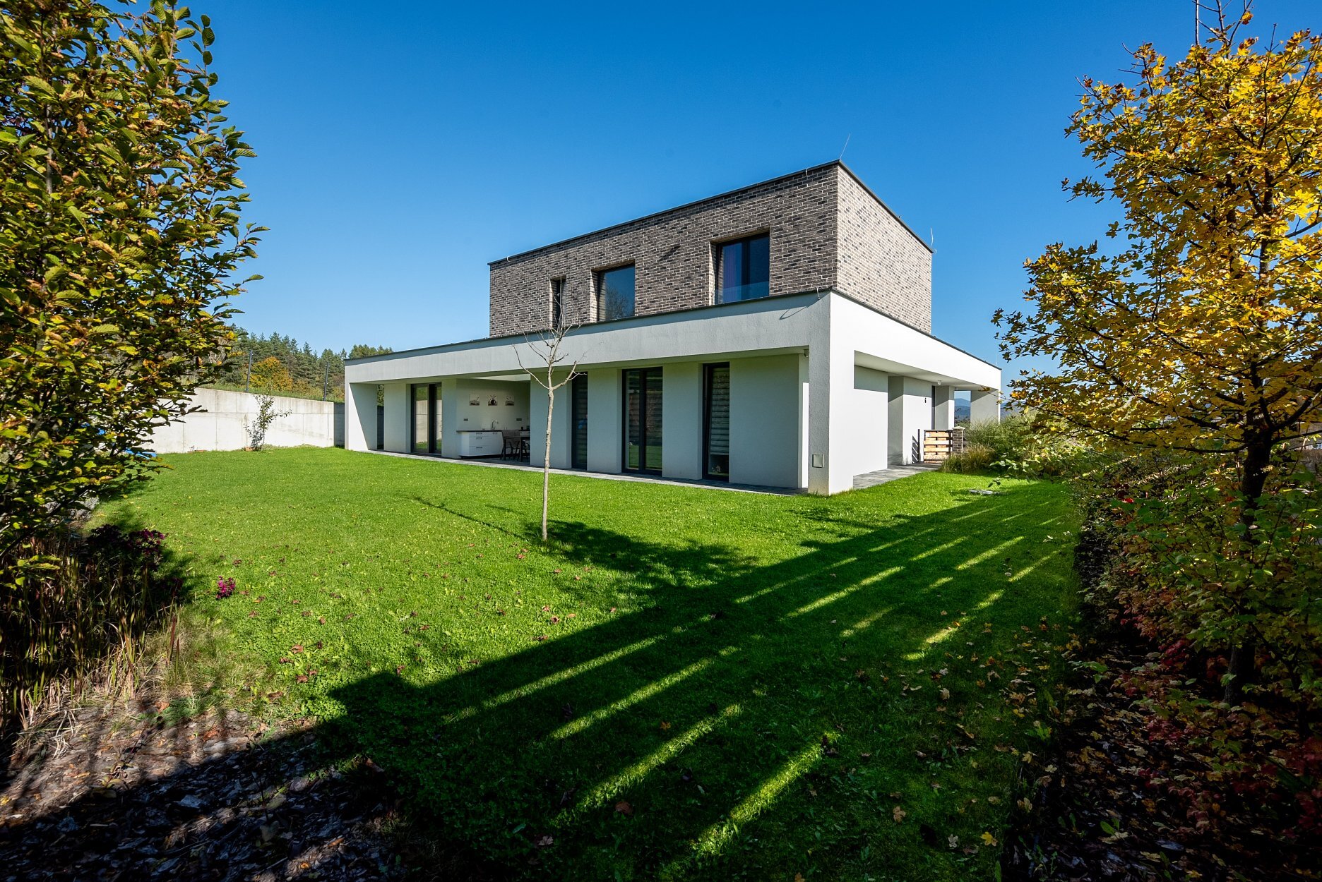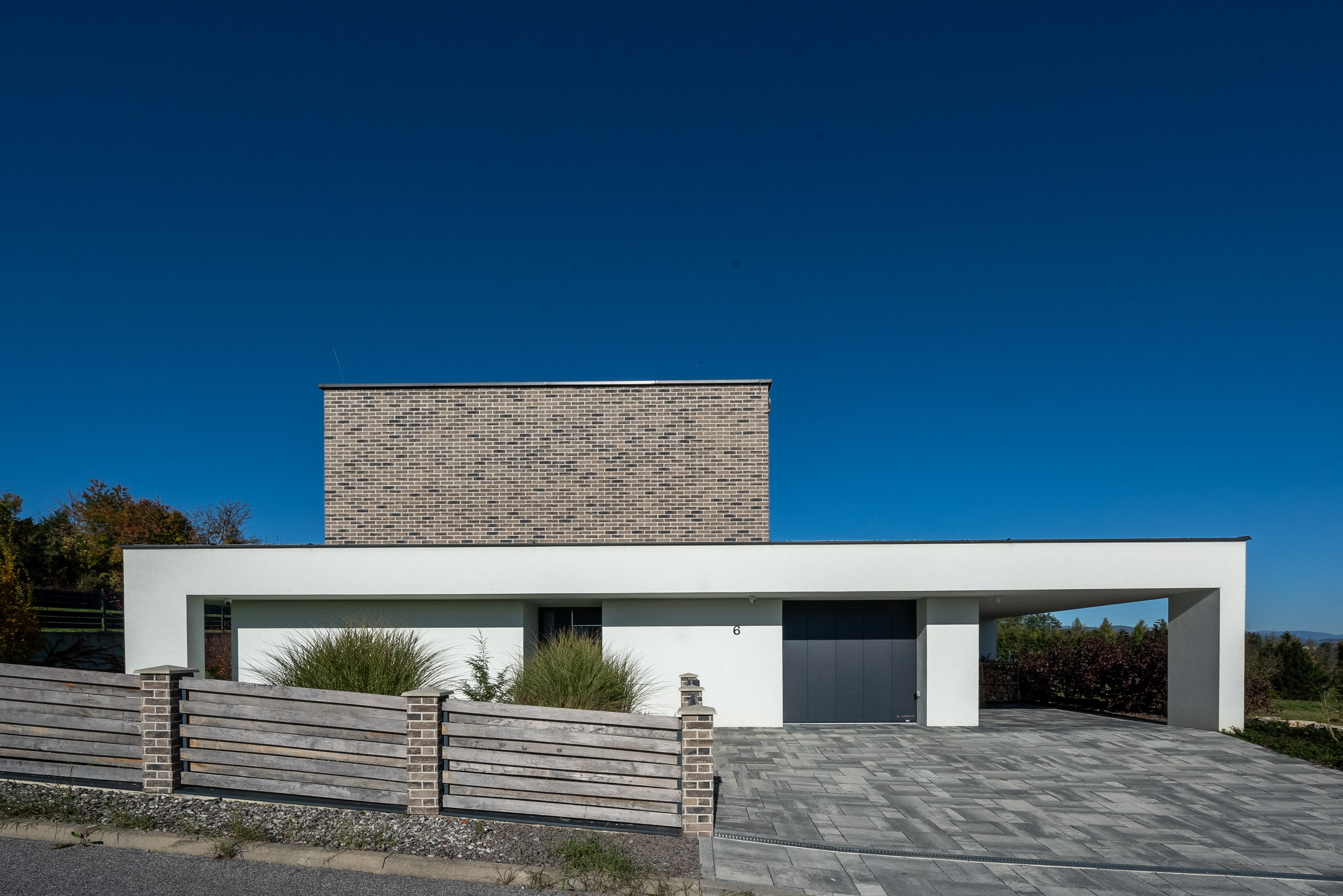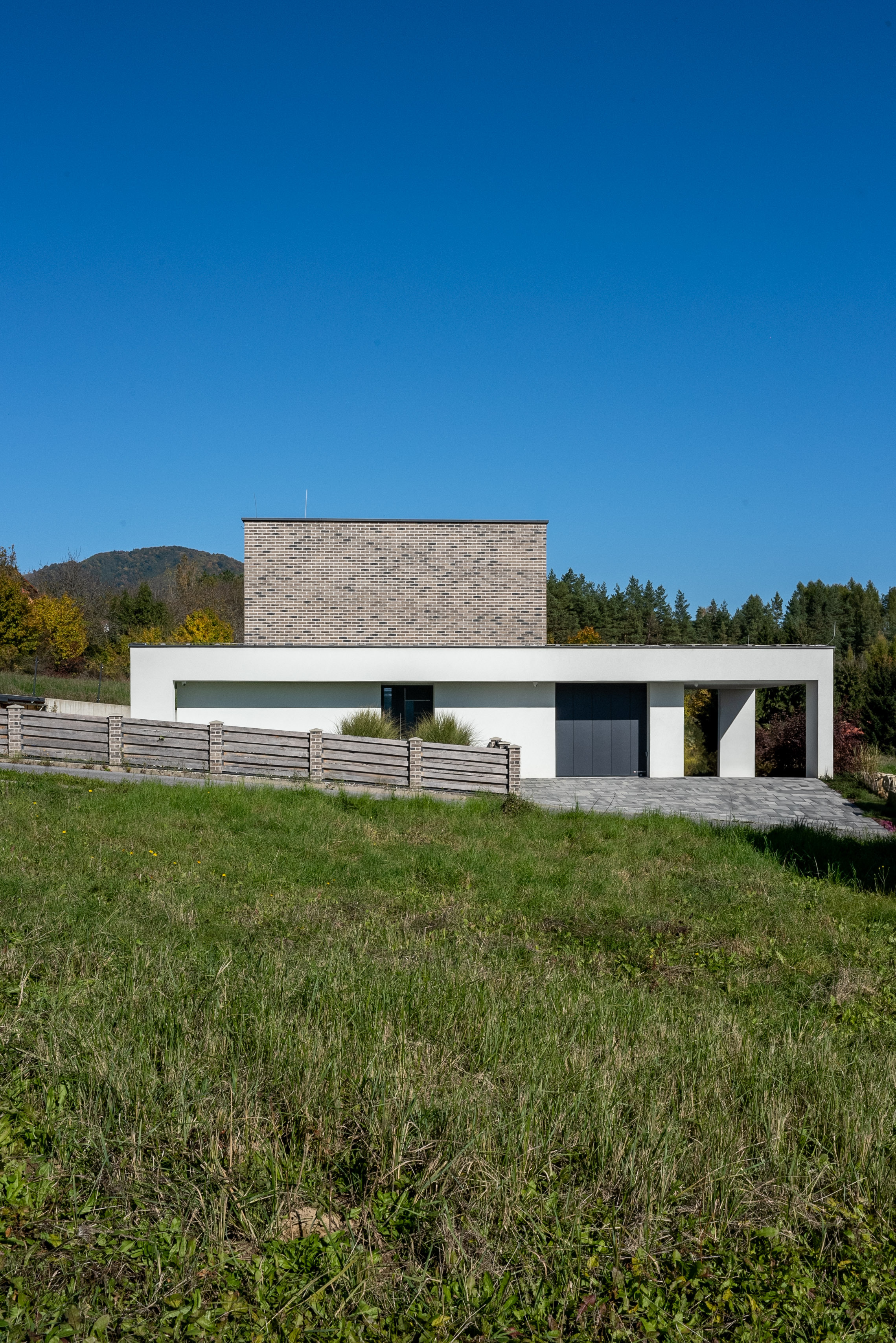Rodinný dom vznikol podľa návrhu ateliéru Eckhardt.studio v rozvojovej zóne na okraji Banskej Bystrice. Strohá fasáda orientovaná do ulice vytvára ochrannú bariéru, zatiaľ čo interiér sa otvára smerom k slnečným terasám a prírodnému prostrediu. Dispozícia podporuje plynulé prepojenie vnútorných a vonkajších priestorov, pričom dominantnú úlohu zohráva centrálna jedálensko-kuchynská zóna.