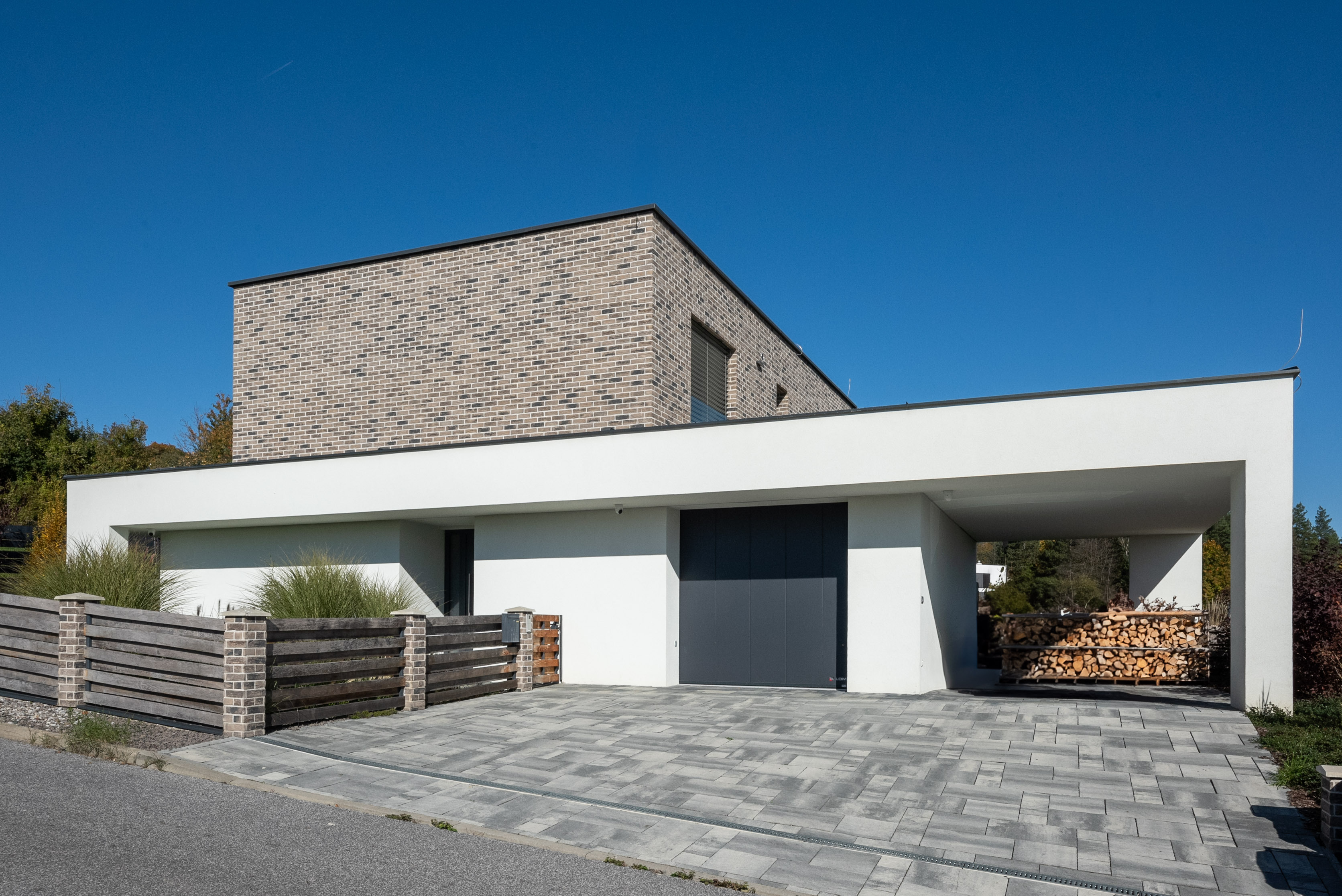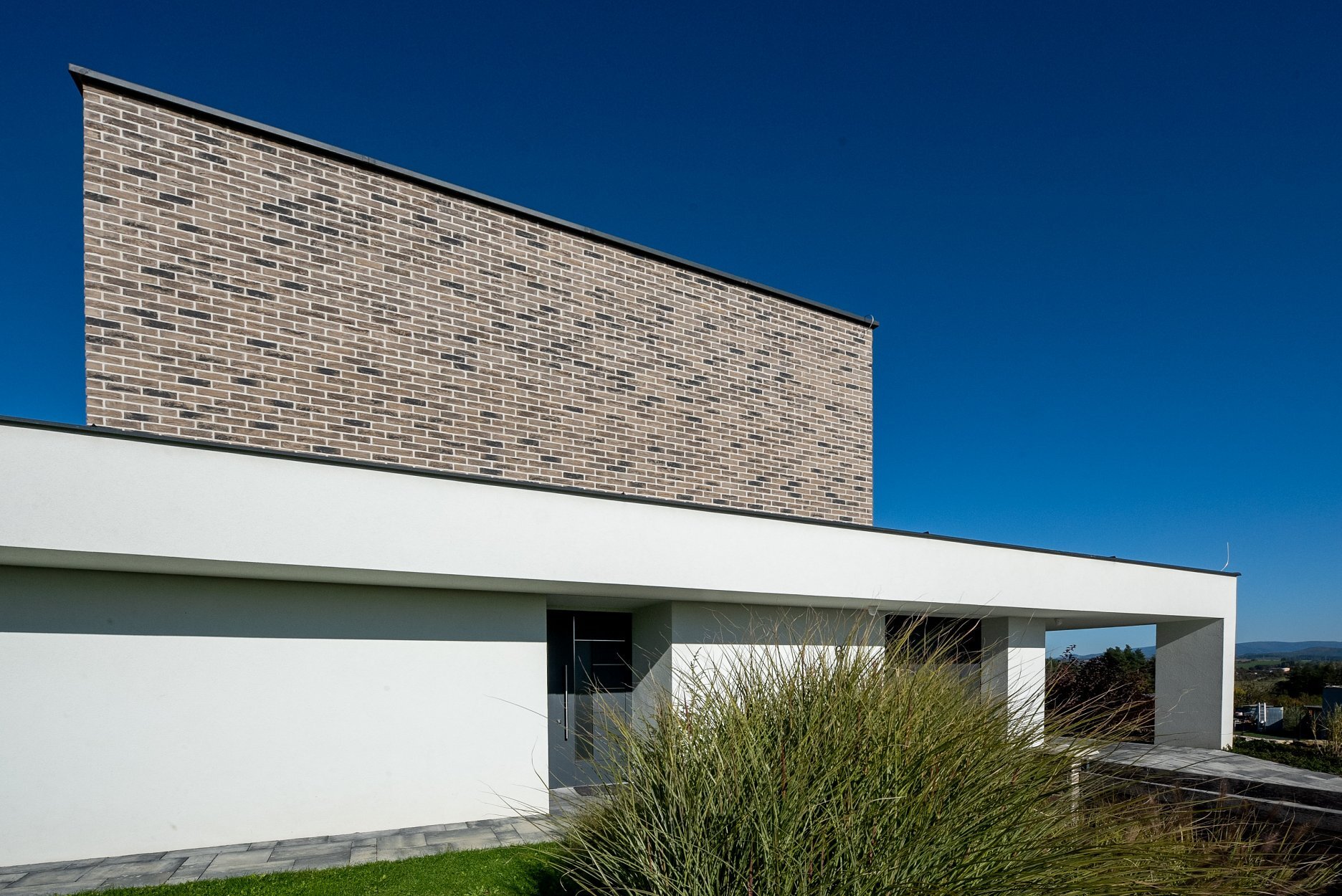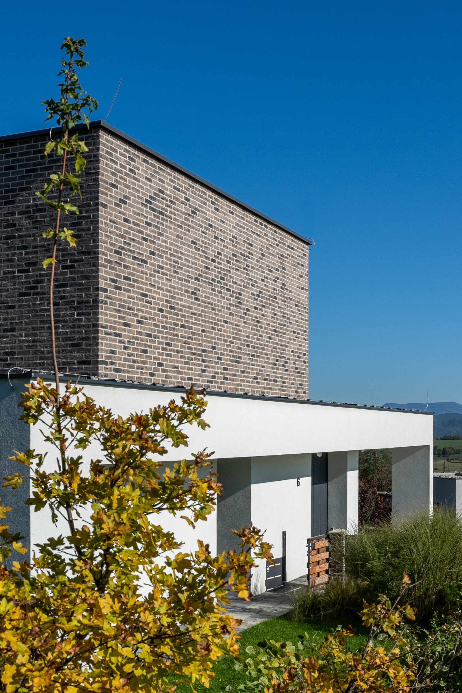Charakter domu podčiarkuje aj jeho materiálové riešenie. Hlavná hmota je strohá, no ustúpené podlažie obložené keramikou vnáša do kompozície akcent a jemnú textúru. Obklad nie je len vizuálnym prvkom – svojou štruktúrou a materiálovou pravdivosťou odkazuje na vidiecky kontext, v ktorom sa dom nachádza. Prírodná patina tehly navyše umožní, aby stavba časom prirodzene zostarla a ešte viac splynula s okolím.