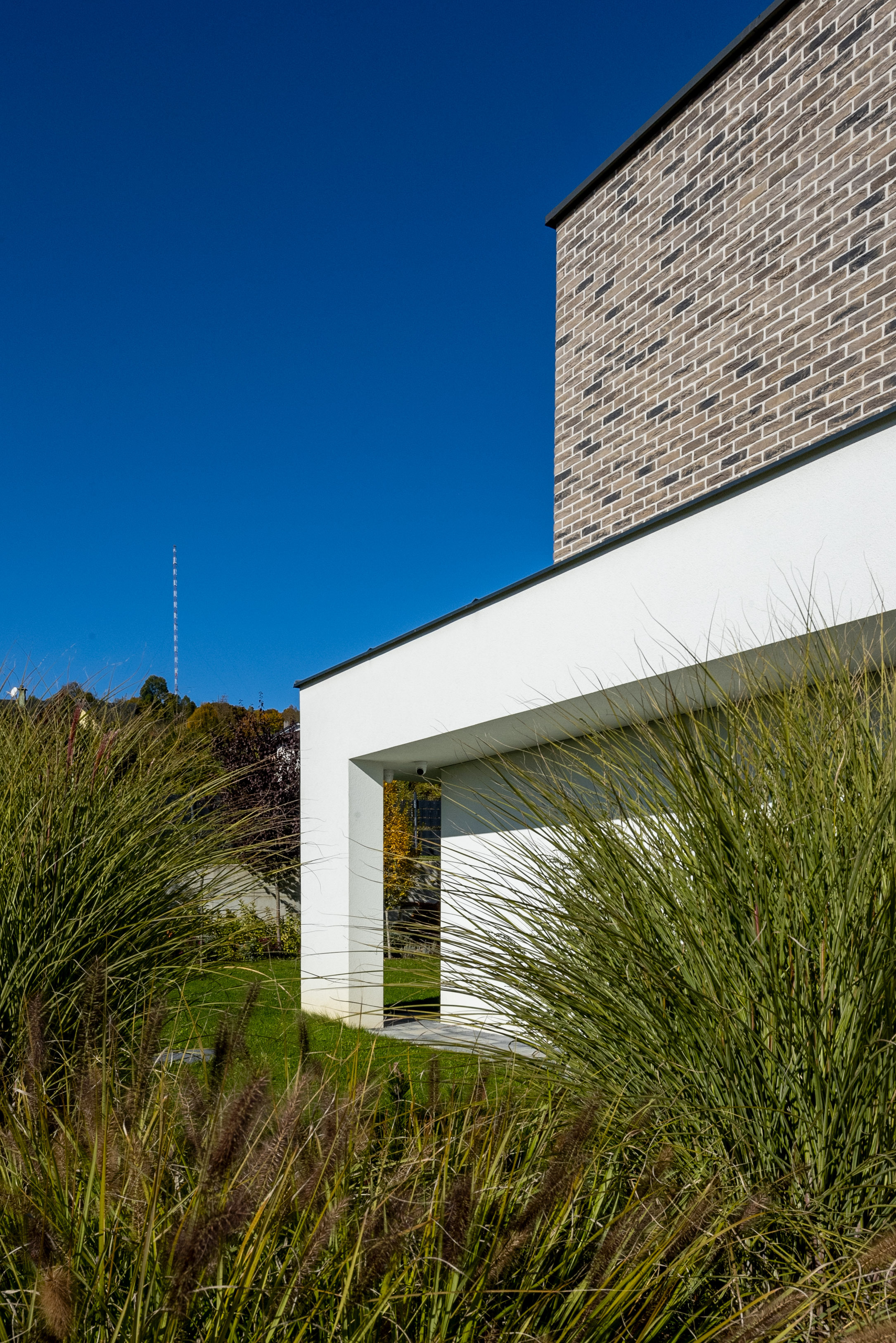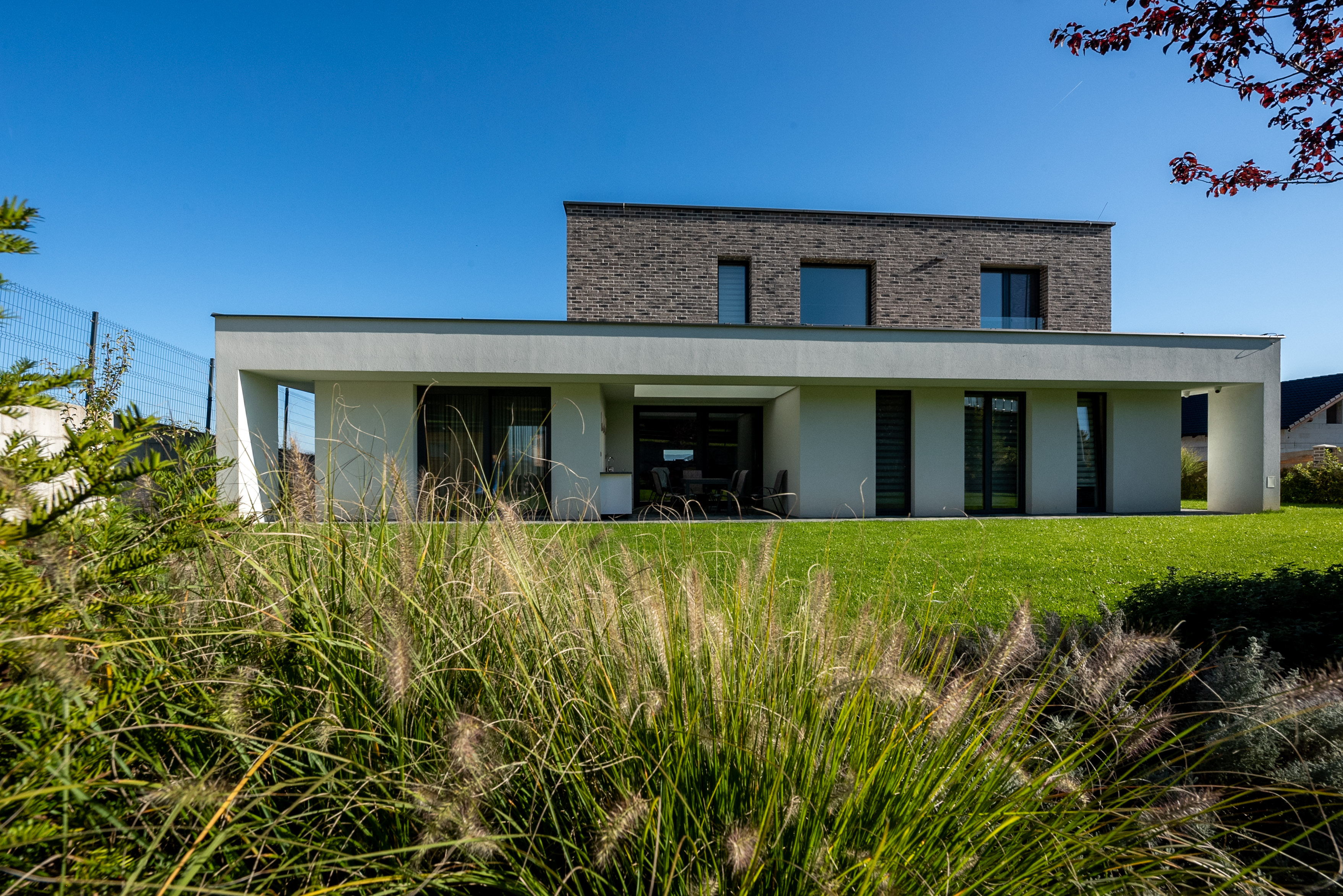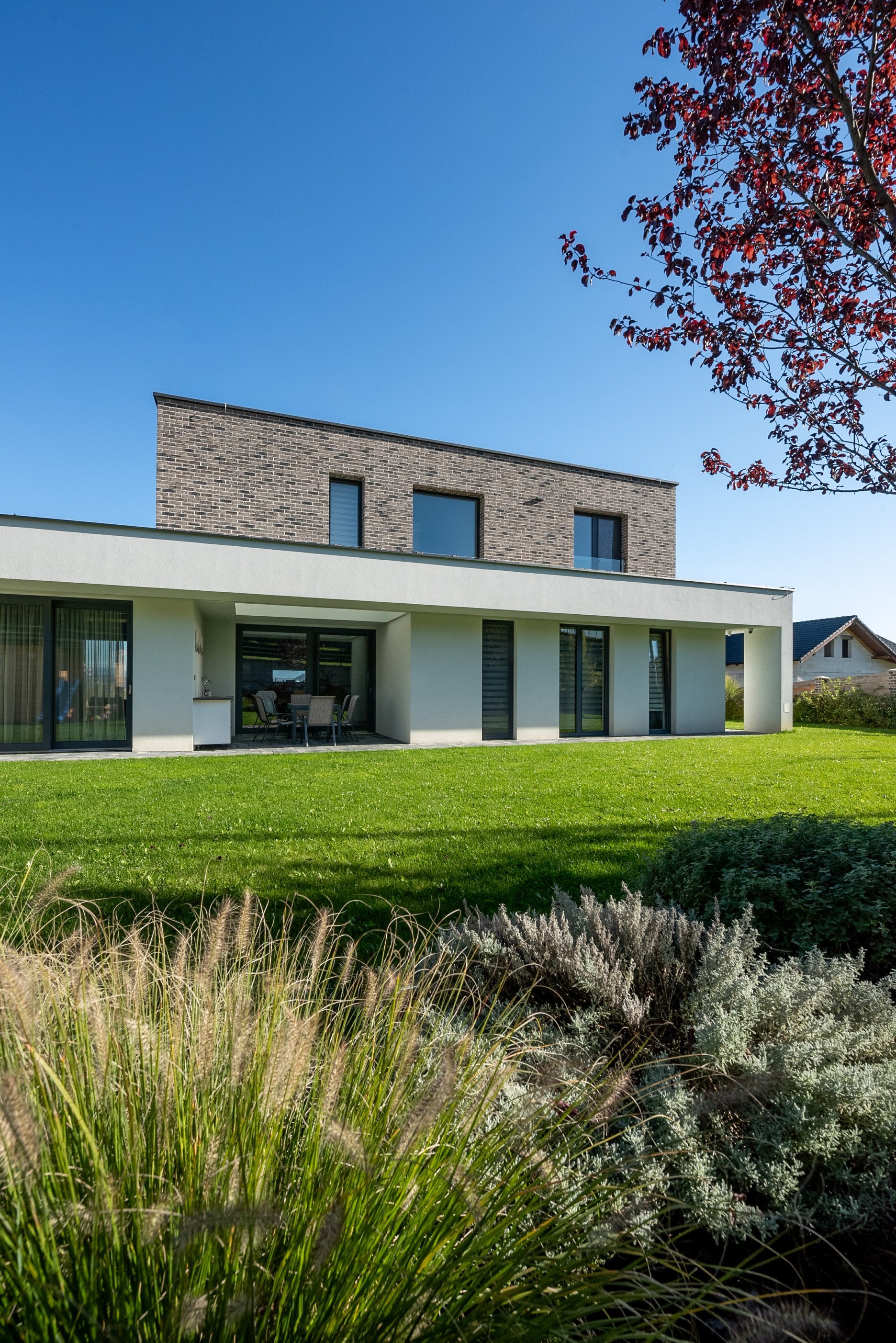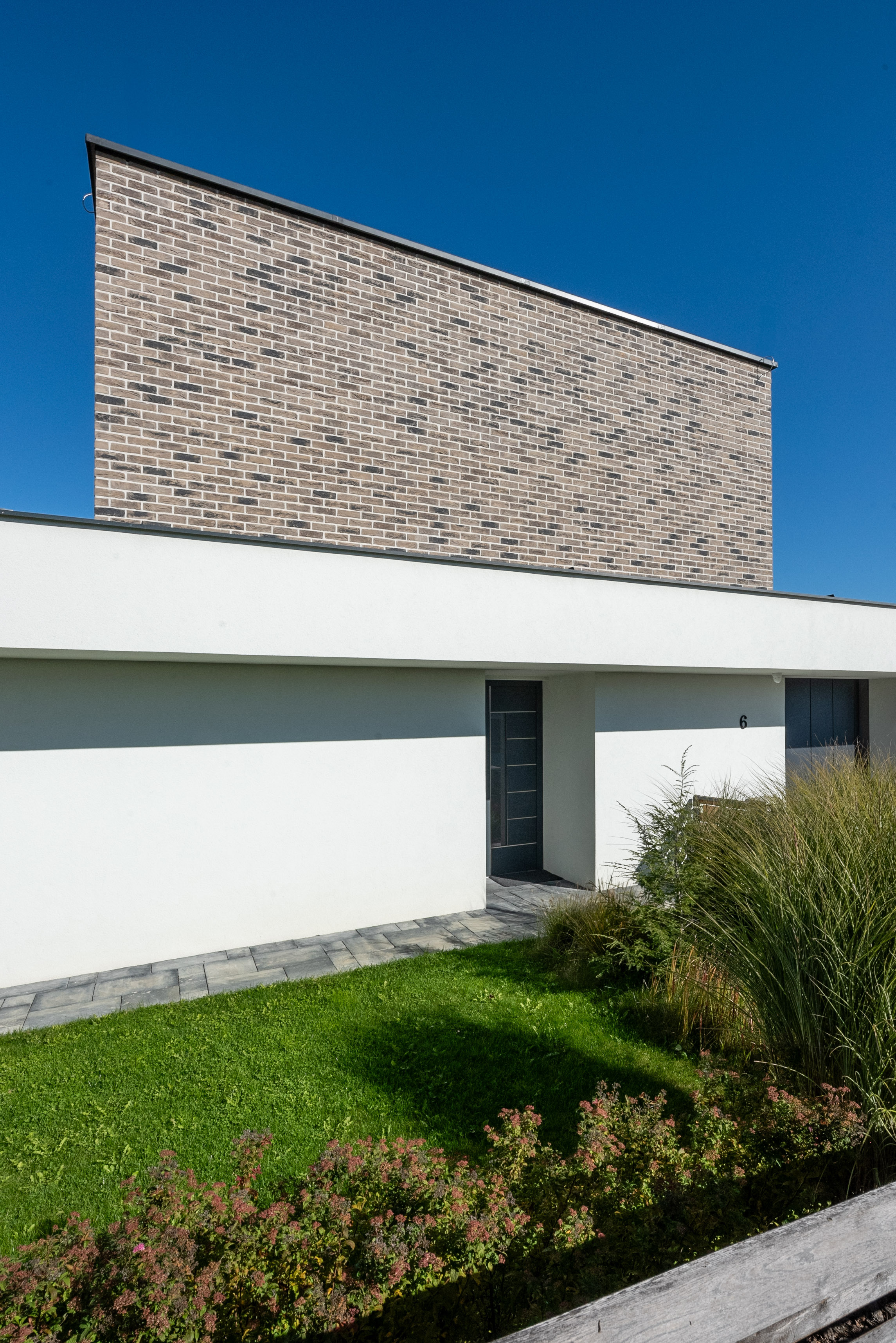 Charakter domu podčiarkuje aj jeho materiálové riešenie. Hlavná hmota je strohá, no ustúpené podlažie obložené keramikou vnáša do kompozície akcent a jemnú textúru. Obklad nie je len vizuálnym prvkom – svojou štruktúrou a materiálovou pravdivosťou odkazuje na vidiecky kontext, v ktorom sa dom nachádza. Prírodná patina tehly navyše umožní, aby stavba časom prirodzene zostarla a ešte viac splynula s okolím.
