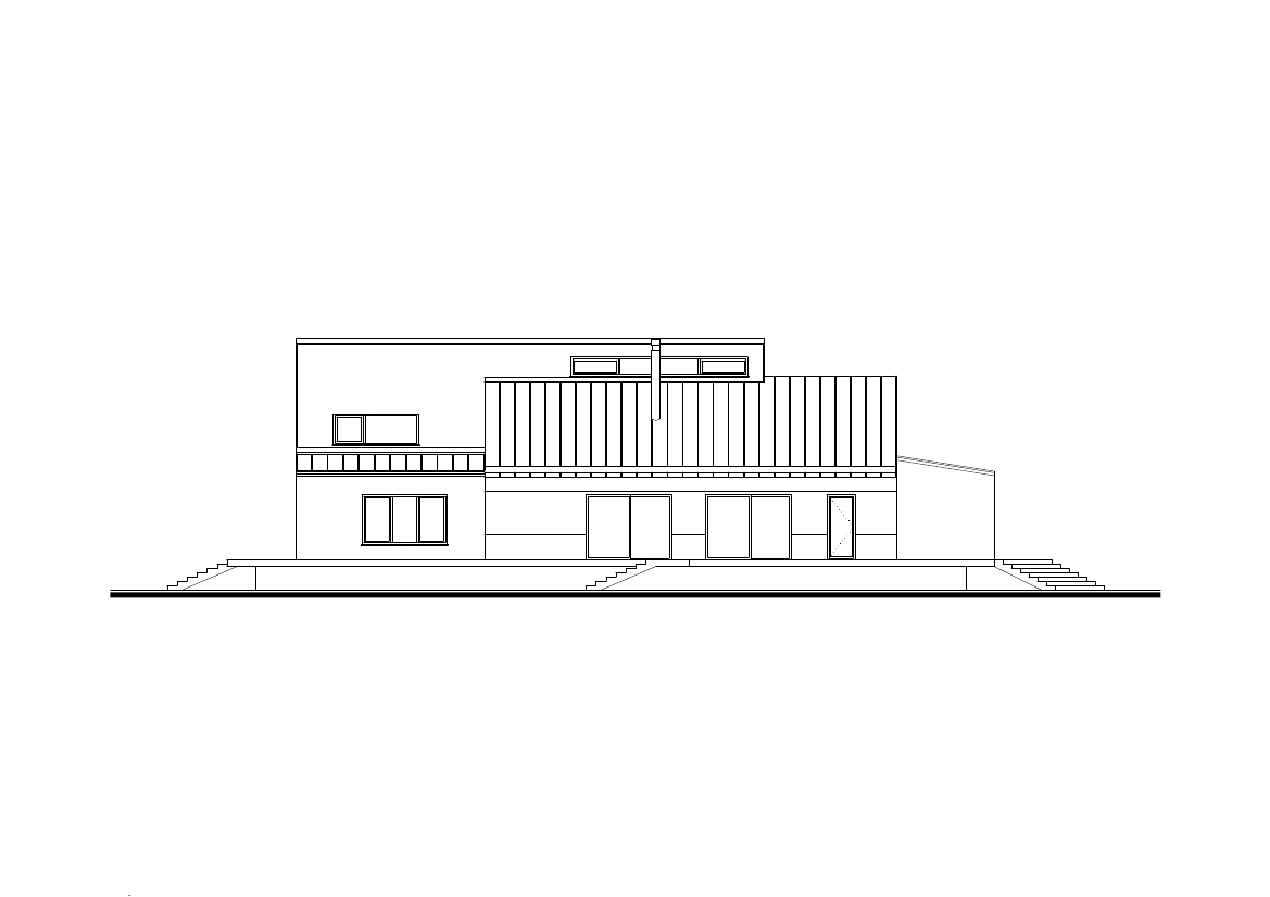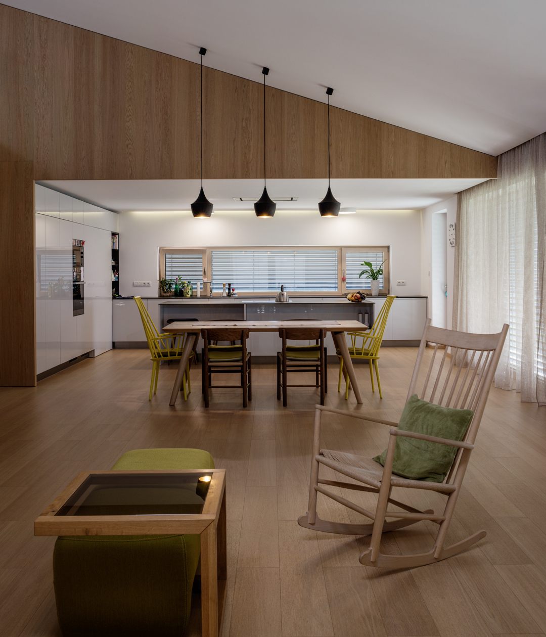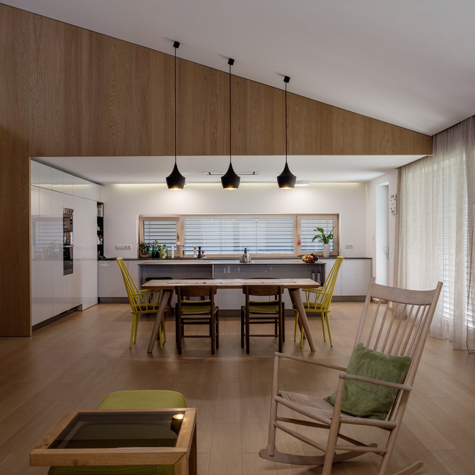 Forma i tvarovanie domu sledujú potreby jeho užívateľov a miestne podmienky. Dom je jednopodlažný s podkrovím, kde prízemie - či jeho väčšia časť plní prevažne funkciu spoločenskú. Veľkosť domu je držaná na "uzde" korekciou mierky - tektonickým pohybom strešných rovín nad hlavným priestorom, či odľahčujúcou kompozíciou pultových striech nad jednotilivými funkčne odlíšenými traktami. Jedálenská a obytná zóna tu na seba voľne nadväzujú, po celej svojej dĺžke sú lemované veľkými presklenými portálovými otvormi s prístupom na východnú, južnú a západnú terasu. Juhozápadná terasa je prekrytá previsom hlavnej pultovej strechy, ktorá v letných mesiacoch zabezpečuje potrebné tienenie spoločenskej časti domu, v zimných zasa vhodne zvolenou dĺžkou previsu dovoľuje preslnenie domu smerom do interiéru nižším zimným slnkom.
