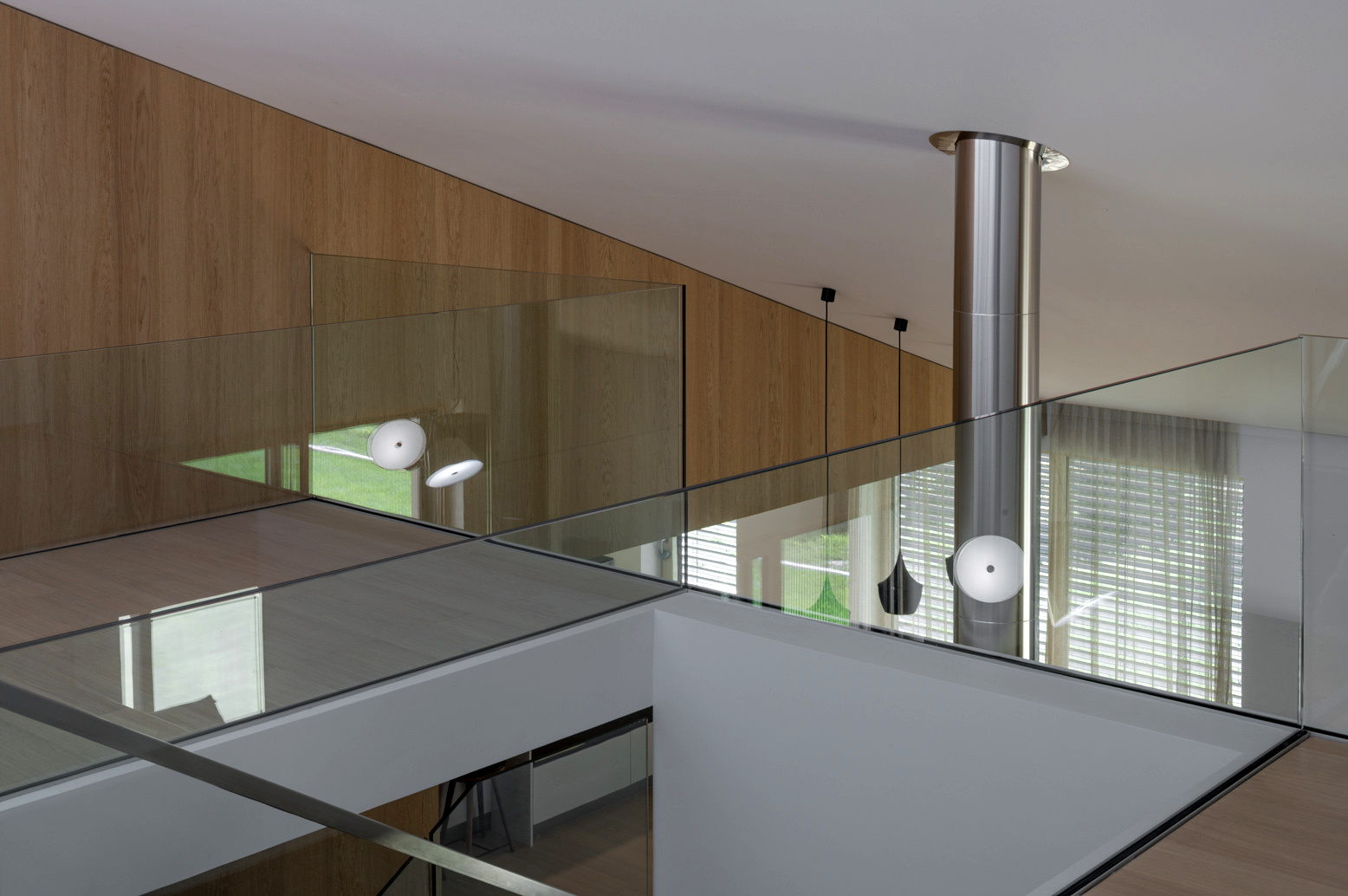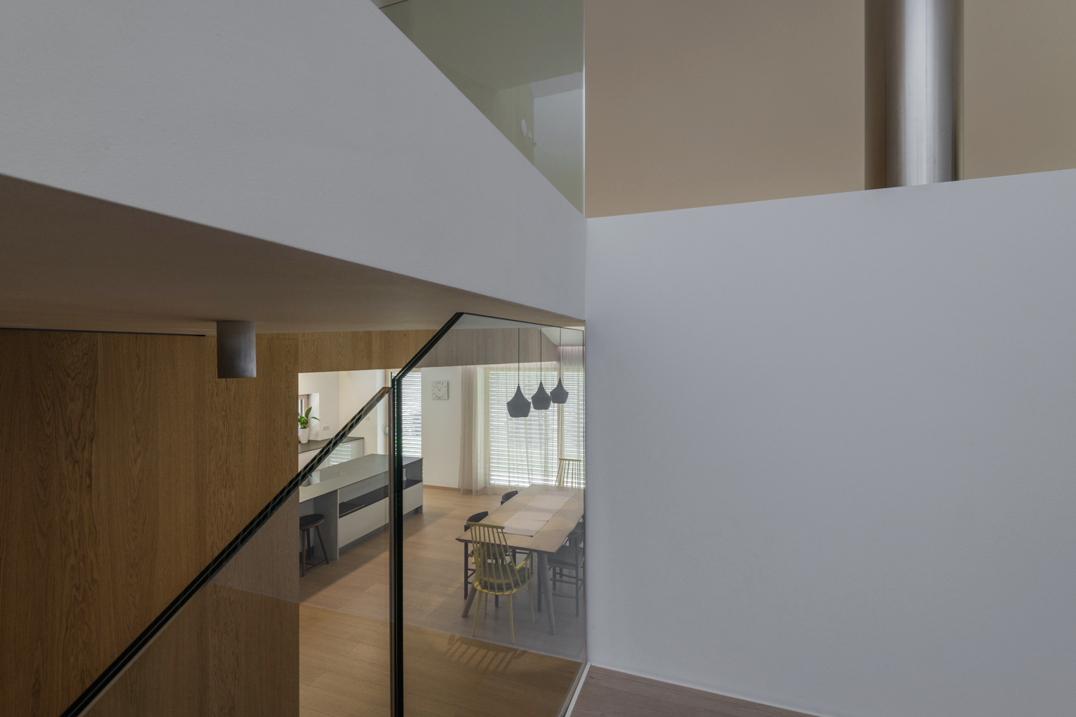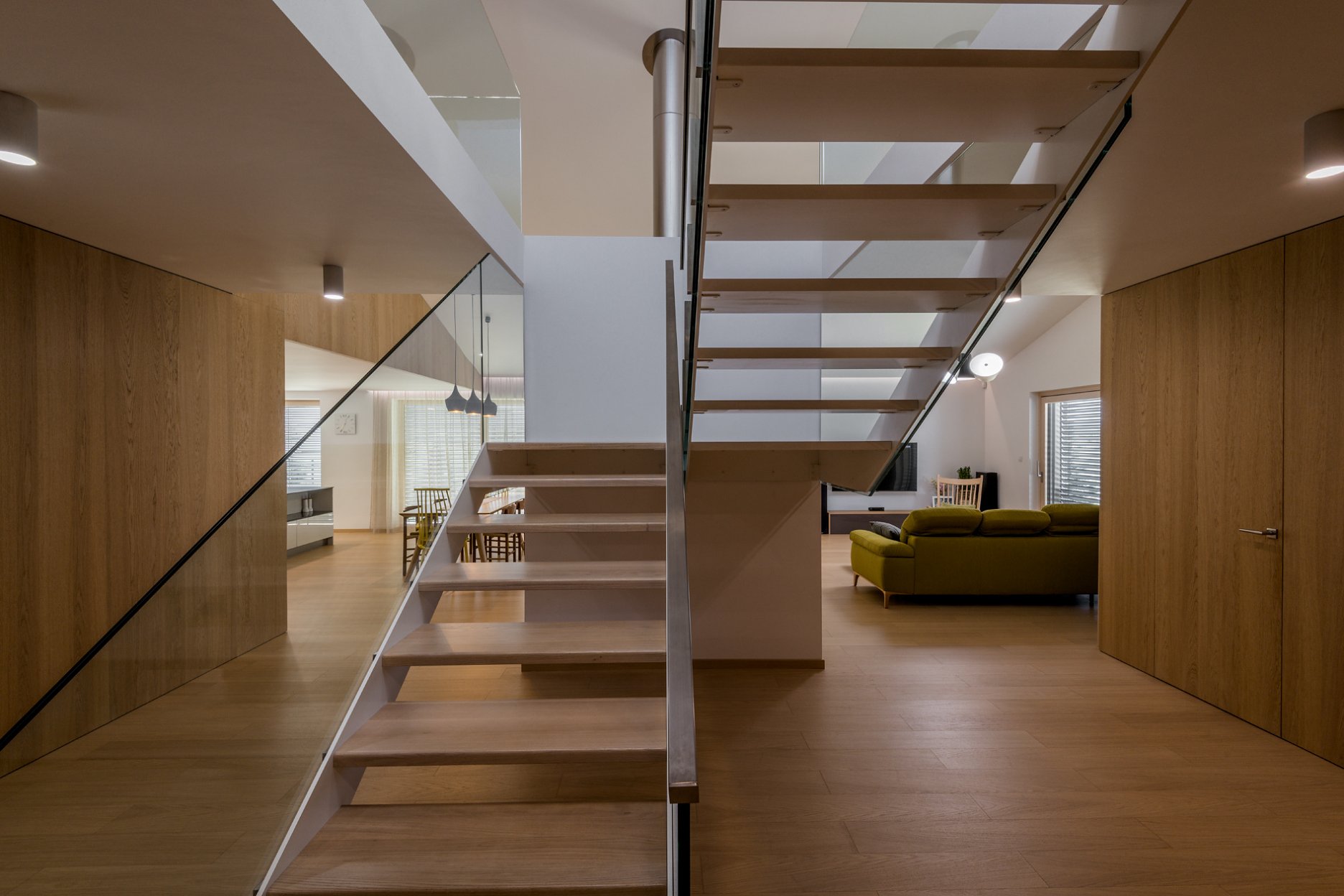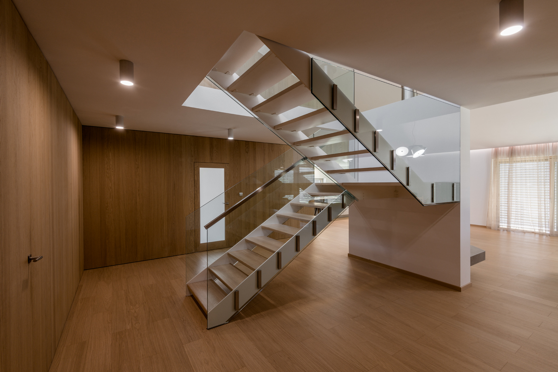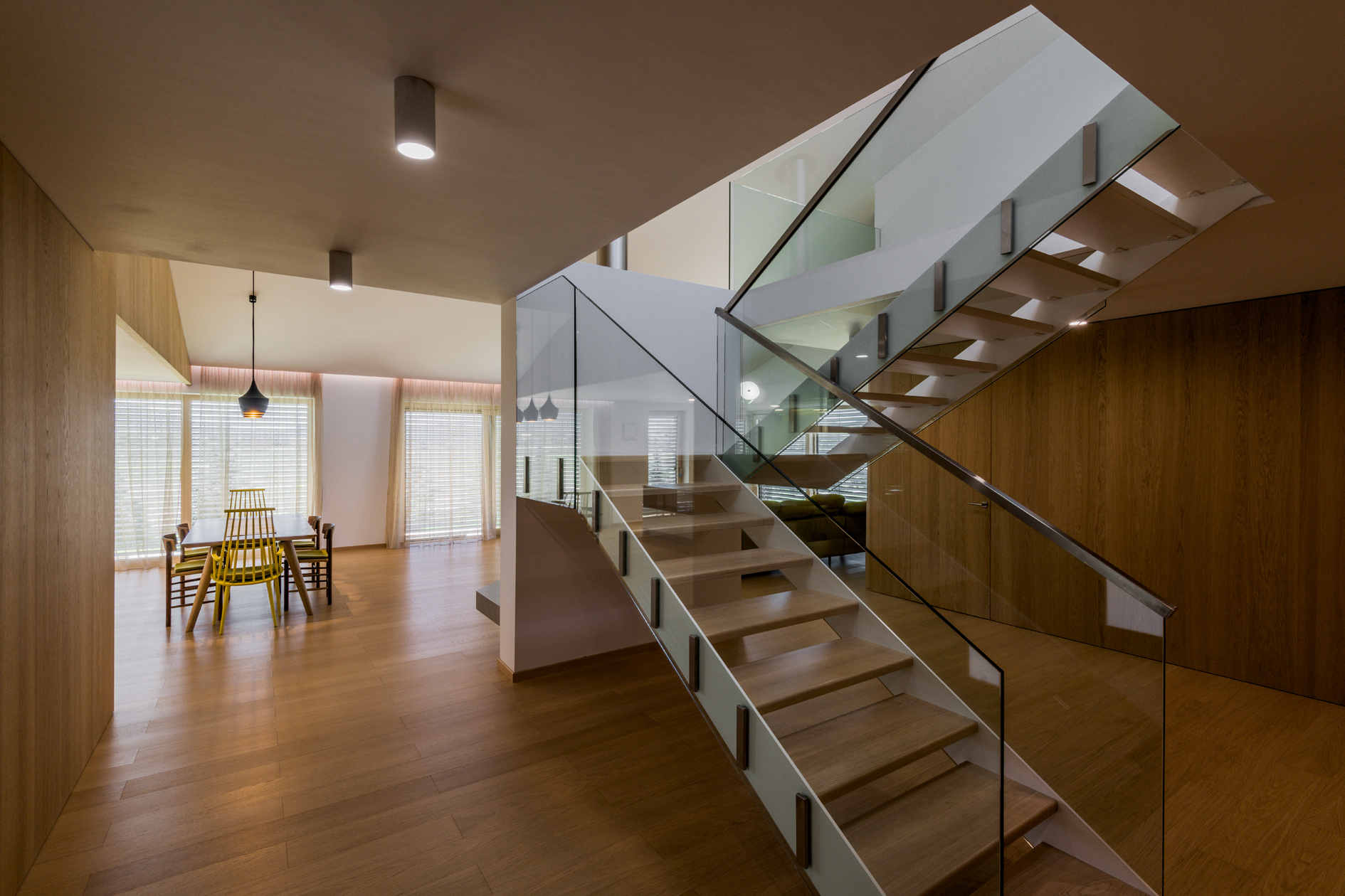 Spoločenská časť prízemia plynulo prechádza do spálňovej časti (hlavnej a hosťovskej spálne), či technologického bloku centrálnym halovým schodiskovým priestorom. Materiálovo je tento stvárnený v paneloch z drevenej dubovej dyhy, materiálovo odlišným prvkom je tu centrálne umiestnené schodisko s bielymi oceľovými schodnicami a preskleným zábradlím. Tento priestor je určujúcim v rámci celkovej hierarchie domu kde, okrem komunikačnej funkcie, umožňuje i komunikáciu vizuálnu a to cez rôzne priehľady a pohľady. V mieste podesty je priestor zvýraznený zaveseným krbom orientovaným do obývacej časti. Schodisko ústi na poschodí do otvorenej galérie dovoľujúcej vizuálne a priestorové prepojenie s nižšou spoločenskou časťou. Vytvorený priestor je vzdušný, otvorený, popritom však stále optimálne oddelený od ostatných priestorov domu.