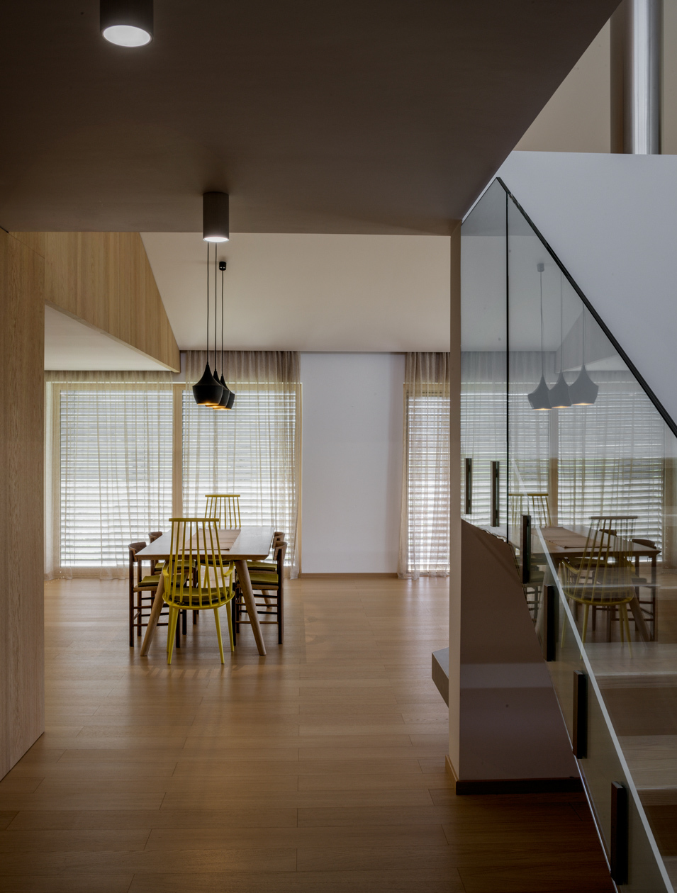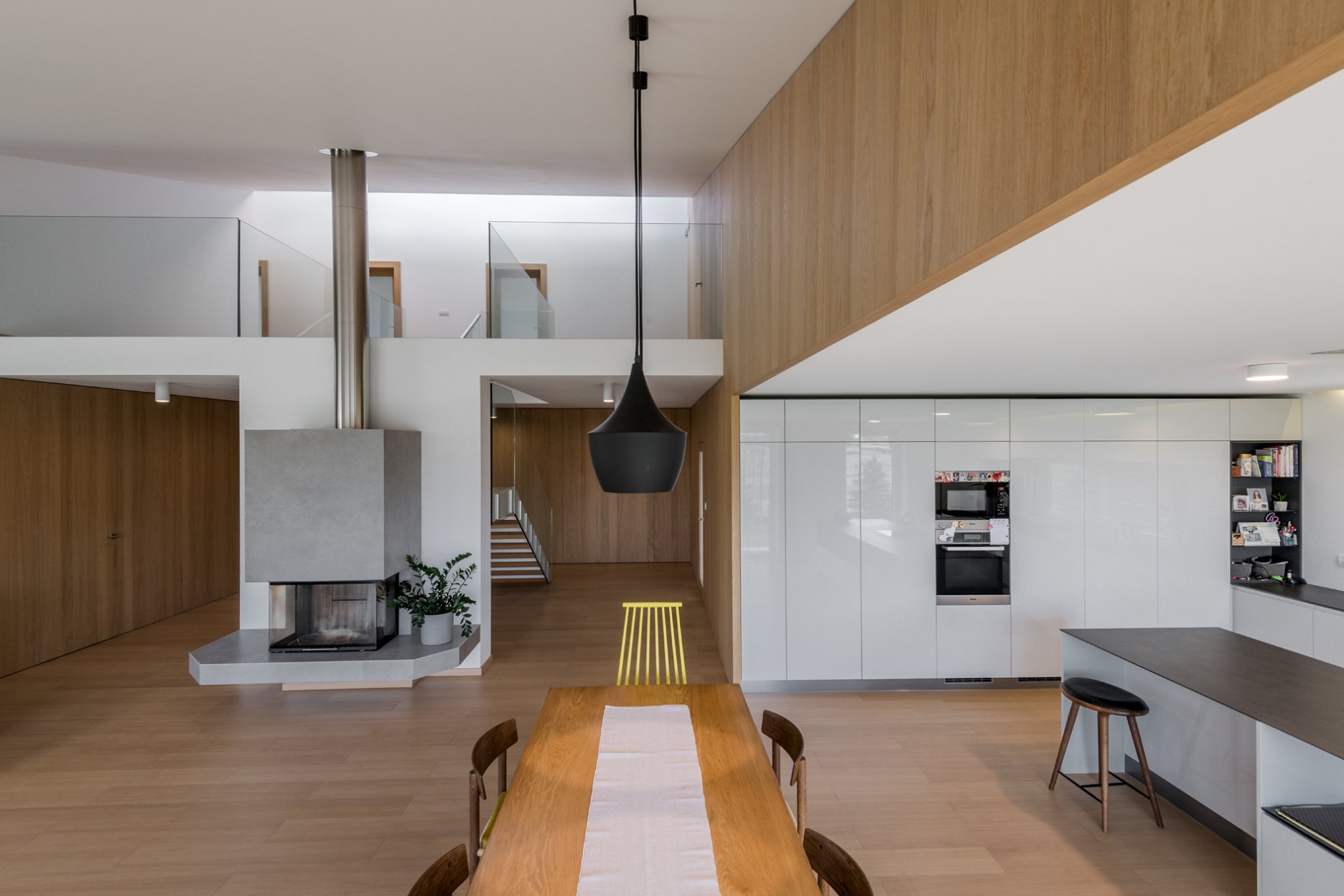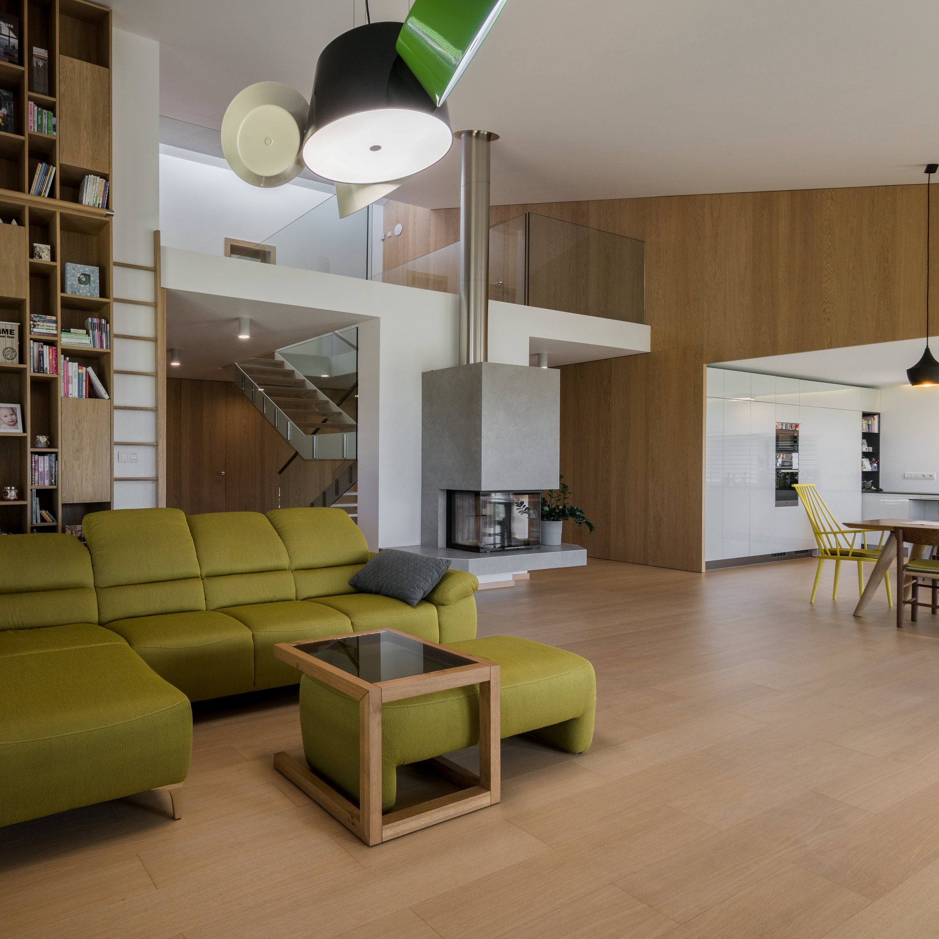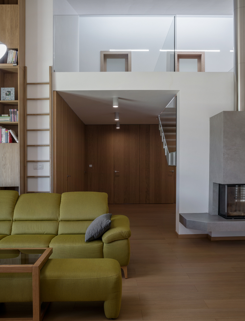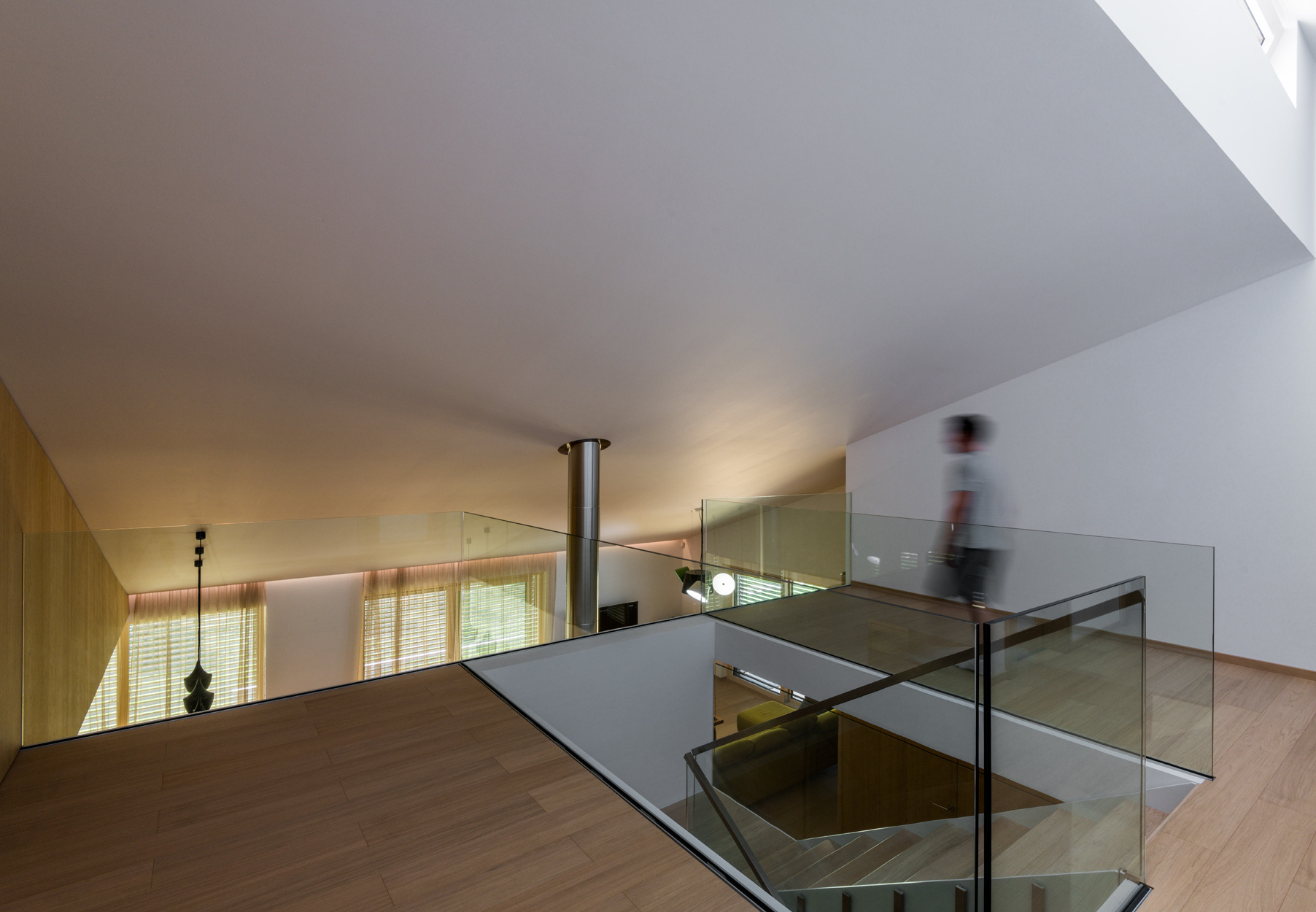 Spoločenská časť prízemia plynulo prechádza do spálňovej časti (hlavnej a hosťovskej spálne), či technologického bloku centrálnym halovým schodiskovým priestorom. Materiálovo je tento stvárnený v paneloch z drevenej dubovej dyhy, materiálovo odlišným prvkom je tu centrálne umiestnené schodisko s bielymi oceľovými schodnicami a preskleným zábradlím. Tento priestor je určujúcim v rámci celkovej hierarchie domu kde, okrem komunikačnej funkcie, umožňuje i komunikáciu vizuálnu a to cez rôzne priehľady a pohľady. V mieste podesty je priestor zvýraznený zaveseným krbom orientovaným do obývacej časti. Schodisko ústi na poschodí do otvorenej galérie dovoľujúcej vizuálne a priestorové prepojenie s nižšou spoločenskou časťou. Vytvorený priestor je vzdušný, otvorený, popritom však stále optimálne oddelený od ostatných priestorov domu.