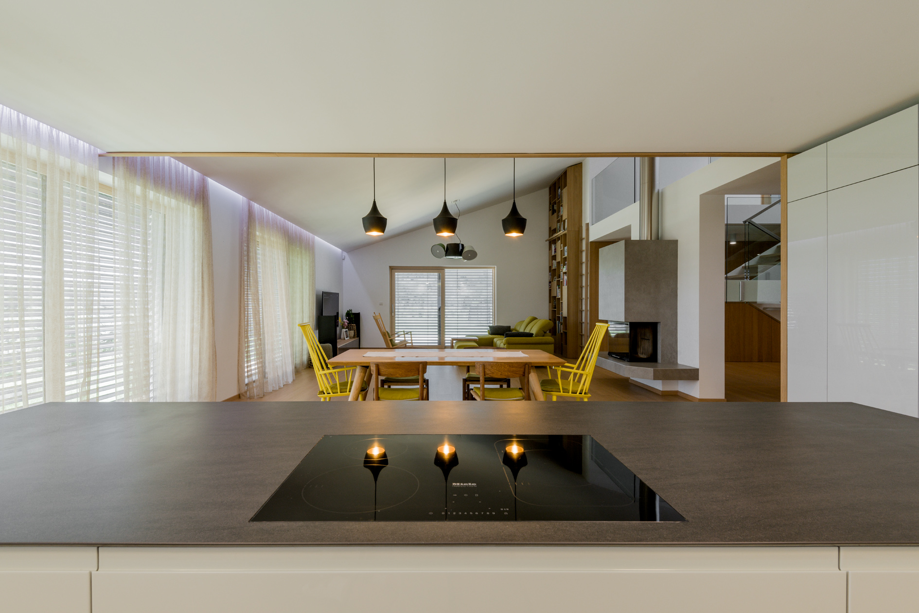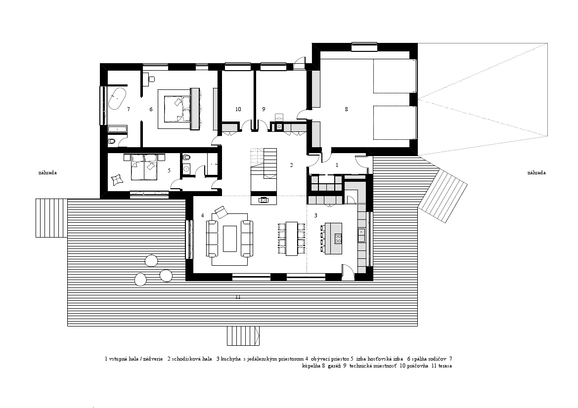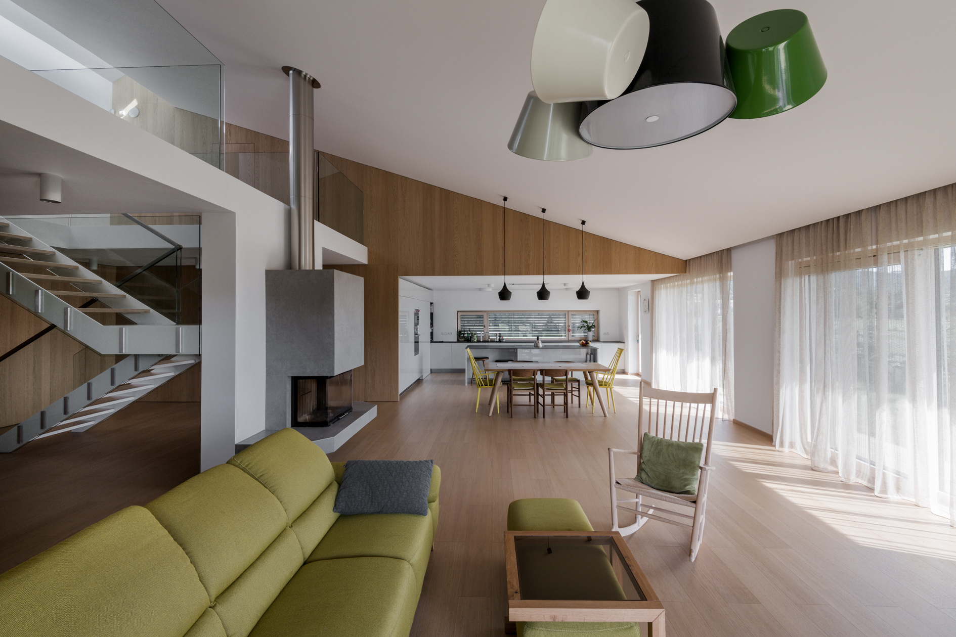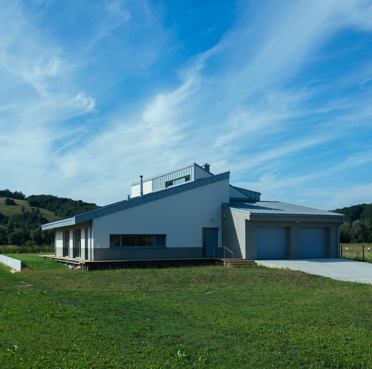 Dispozičné riešenie domu je výsledkom racionálneho zhodnotenia plošných a priestorových nárokov klienta v rámci značne rozľahlého a pozdĺžne tvarovaného pozemku. Pridanú hodnotu tvorí scenéria blízkej prírody, z ktorej dom svojím riešením ťaží. Dôraz je kladený na využitie daností územia, orientáciu objektu a využitie preslnenia zo slnečných strán či otvorenosť smerom do exteriérových zelených plôch.