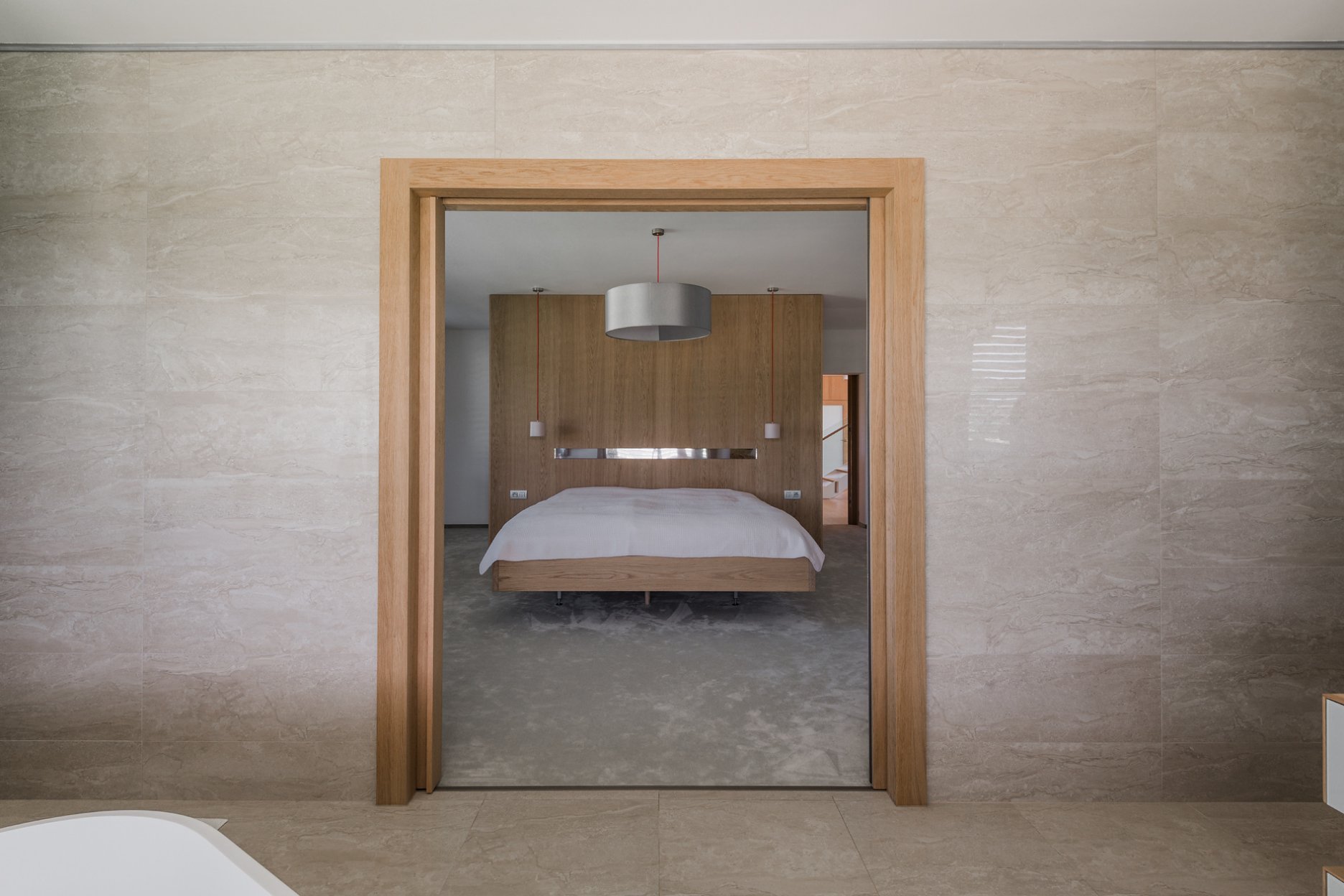 Miestnosť rodičovskej spálne, ukrytej za celodreveným obkladom halového priestoru, je s exteriérom prepojená cez veľkorysý priestor kúpeľne prepojenej zo spálňou dvojkrídlovými posuvnými dverami.