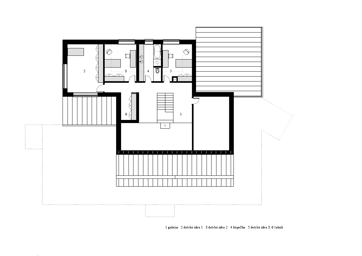 Poschodie má, okrem schodiskovej haly vyúsťujúcej do galérie, už intímnejší ráz. Nachádzajú sa na ňom izby detí, šatník, kúpeľňa a skladová miestnosť.