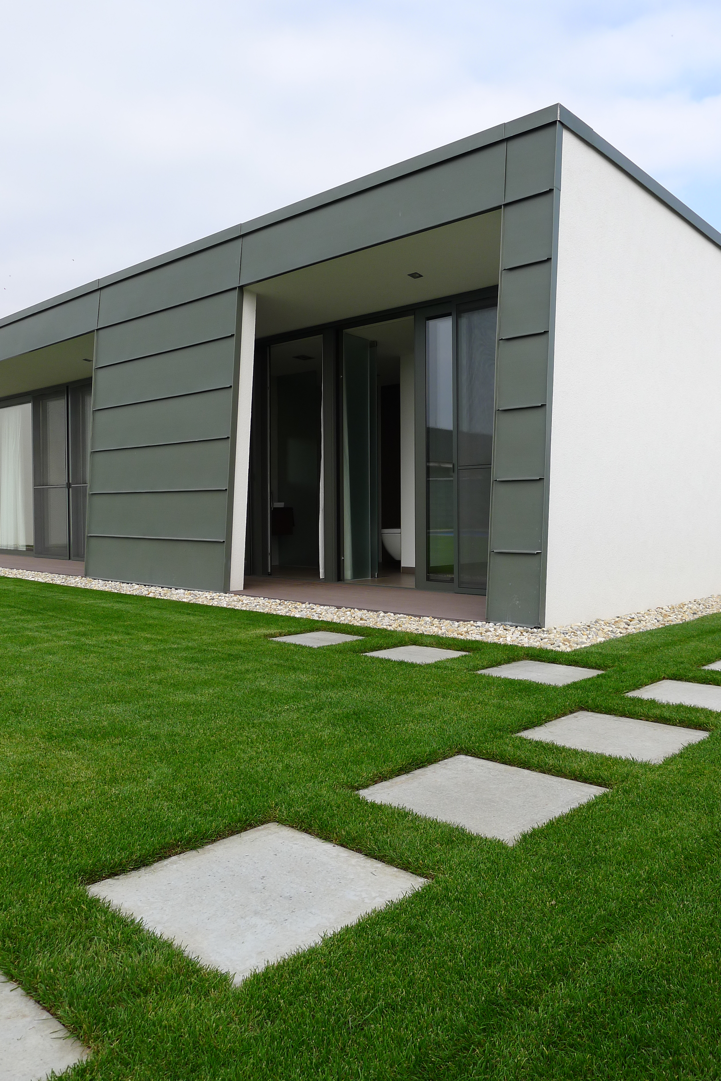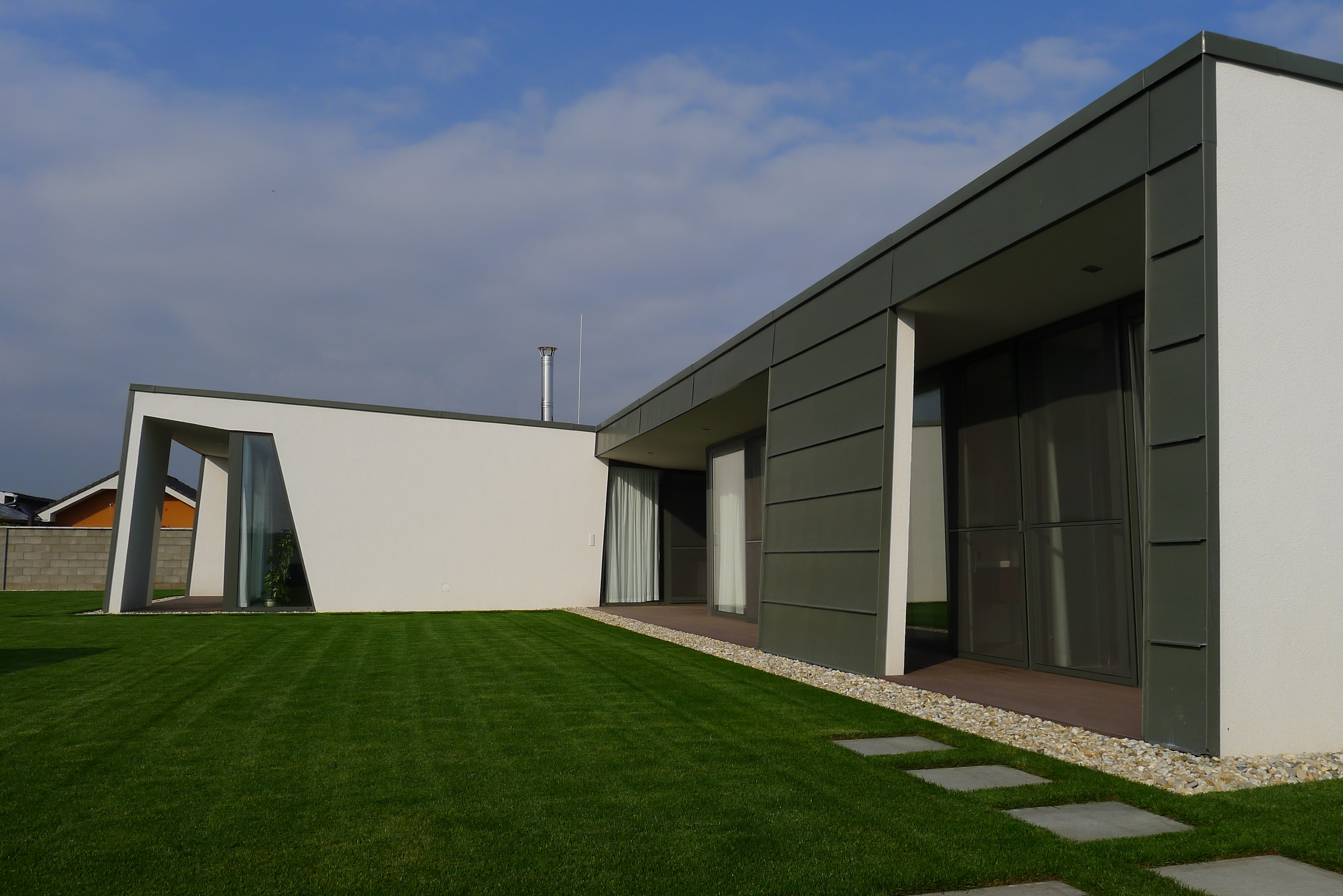 Plocha medzi vstupnými dverami a garážovou bránou je obložená veľkoplošným pieskovcom.
