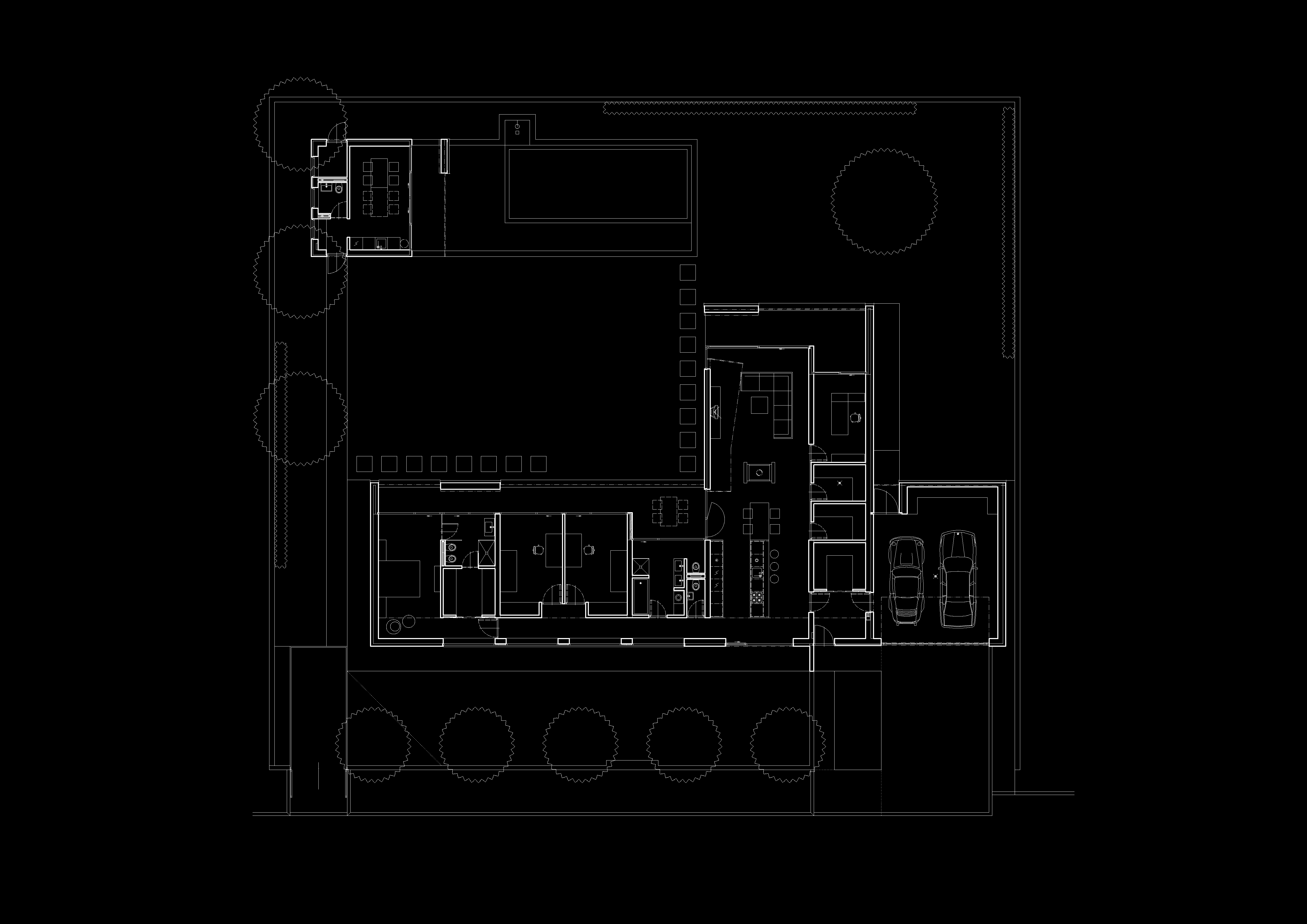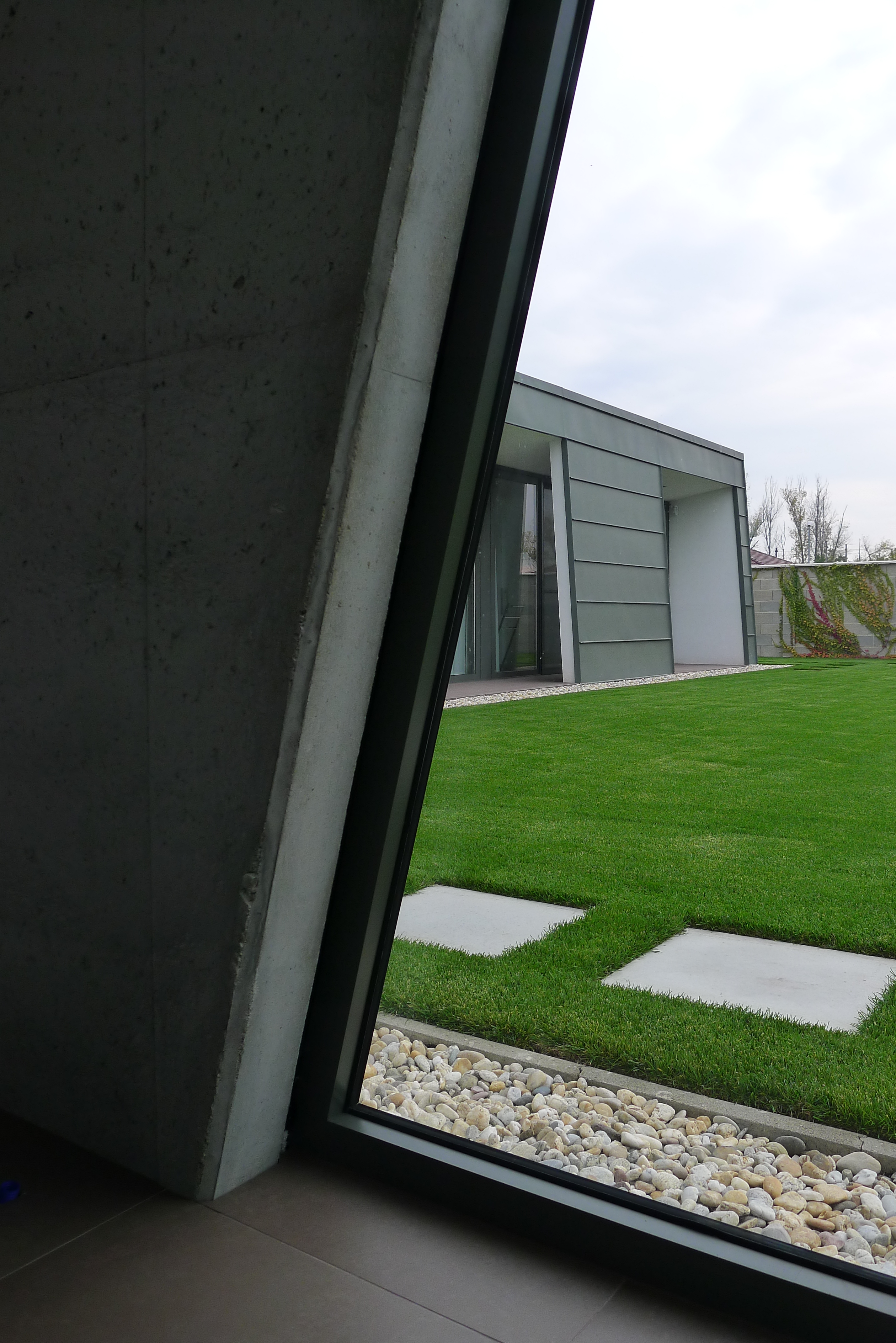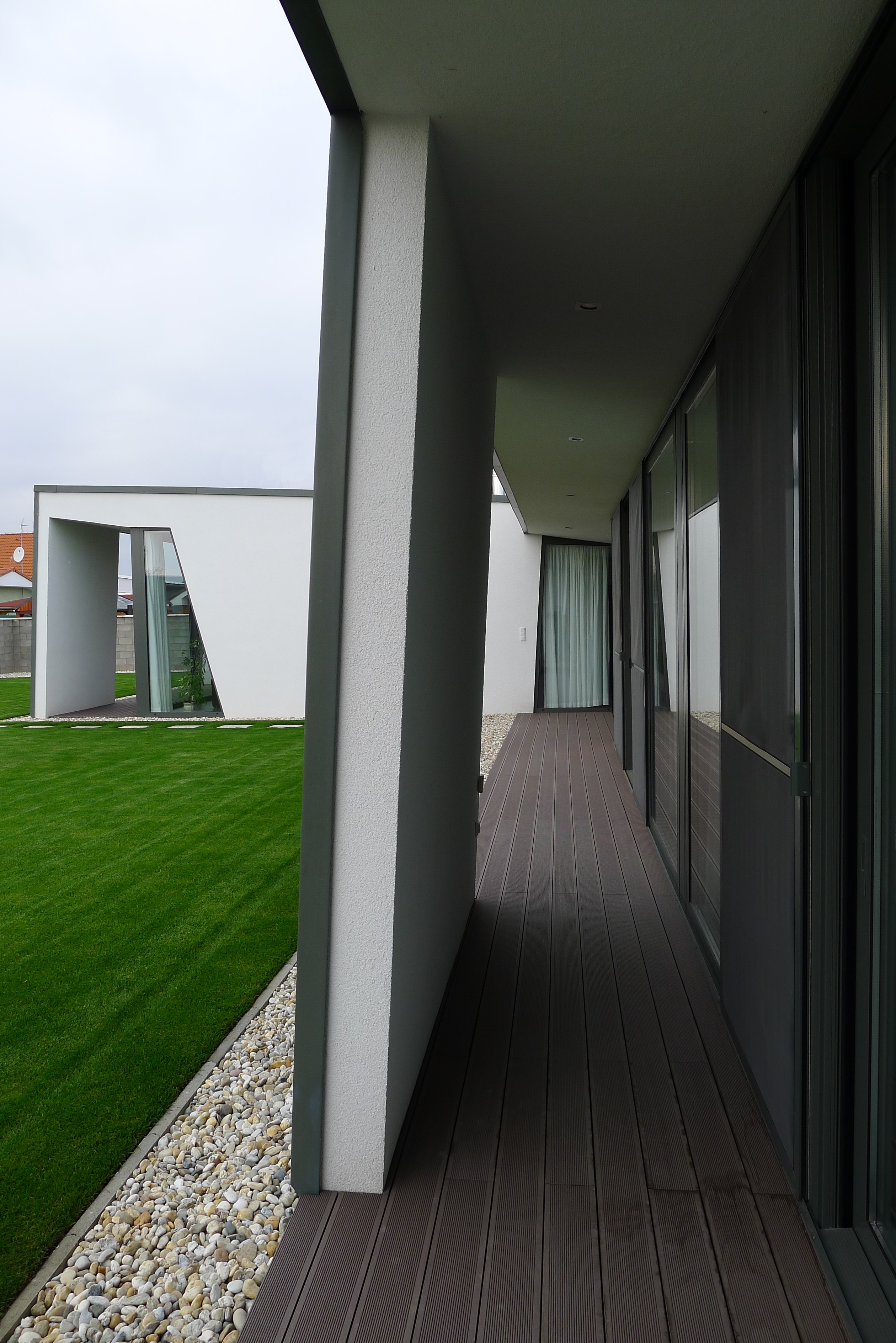 Špecifikom návrhu je ponechanie nástupnej plochy pred vchodovými garážovými dverami mimo oplotenej časti pozemku, čo zjednodušuje logistiku vychádzania a vchádzania do domu a viac zodpovedá typickému charakteru fungovania obyvateľa satelitu viazanému na automobil.