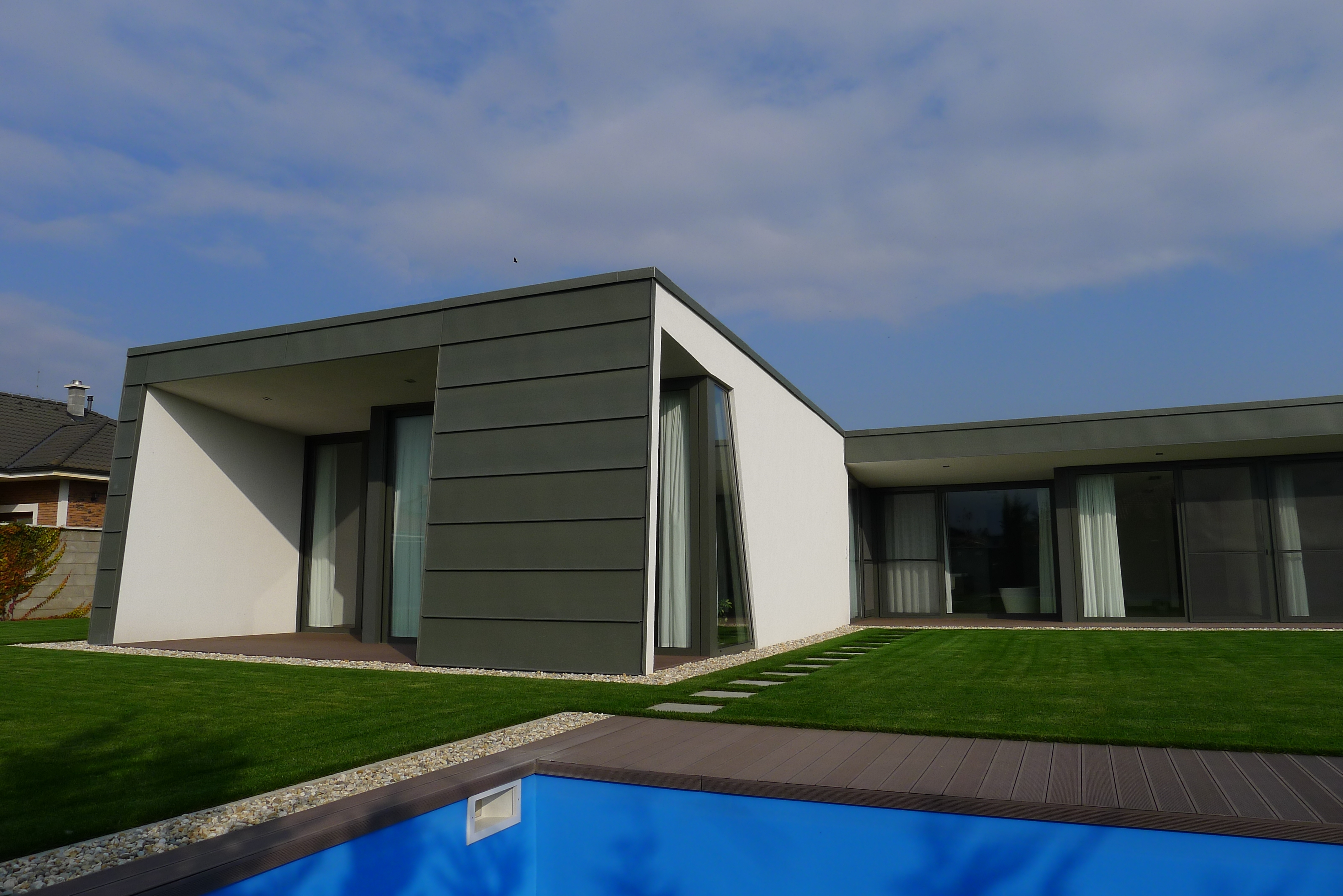Materiálové poňatie exteriérov kombinuje bielu omietku s matným kovovým povrchom zošikmených častí plášťa, s cieľom nechať vyniknúť jemnú skulpturálnosť hmoty. Od ulice vnímateľná časť vstupnej fasády je v minimalistickom duchu olemovaná linkou betónovej markízy, plynule prechádzajúcej do zvislej zásteny.