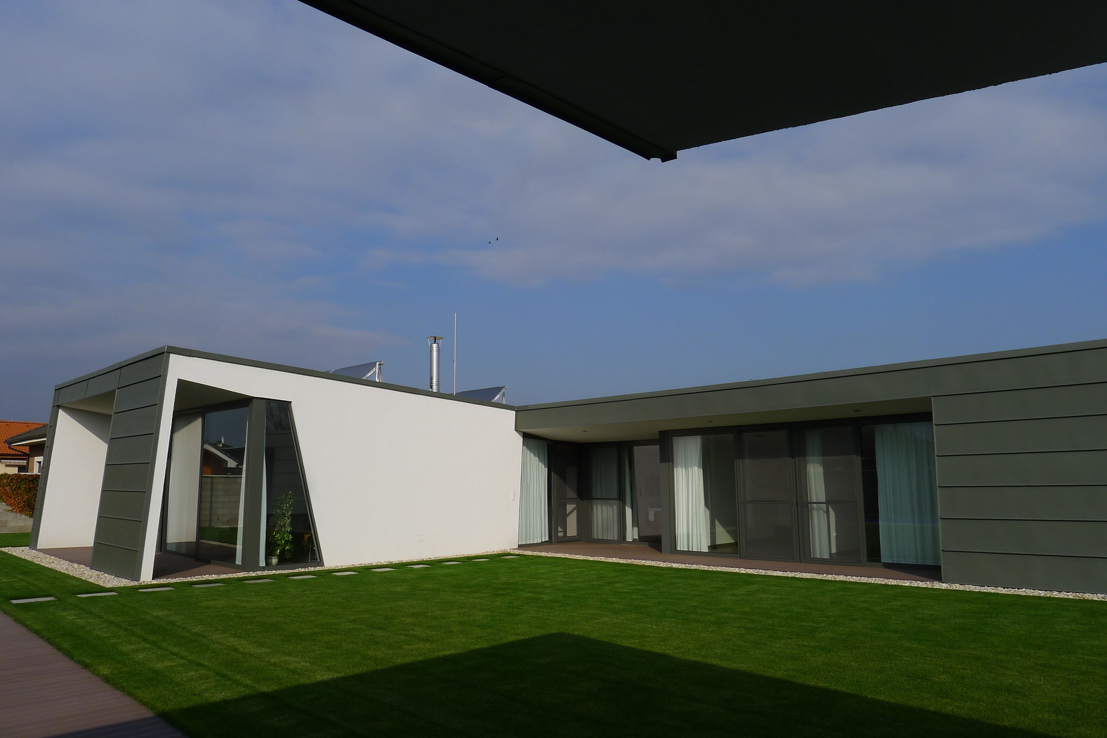 Formovala dispozičné riešenie preferujúce orientáciu obytných miestností na najviac preslnenú svetovú stranu, zadefinovala mierny spád strešnej roviny a spolu s ním účelovo zdynamizovala dvornú – slnečnú stranu objektu, ktorá mierne kontrastuje s industriálnou strohosťou a skúposťou uličnej fasády. Priznanie spádu strechy v interiéri hierarchizuje priestory domu.