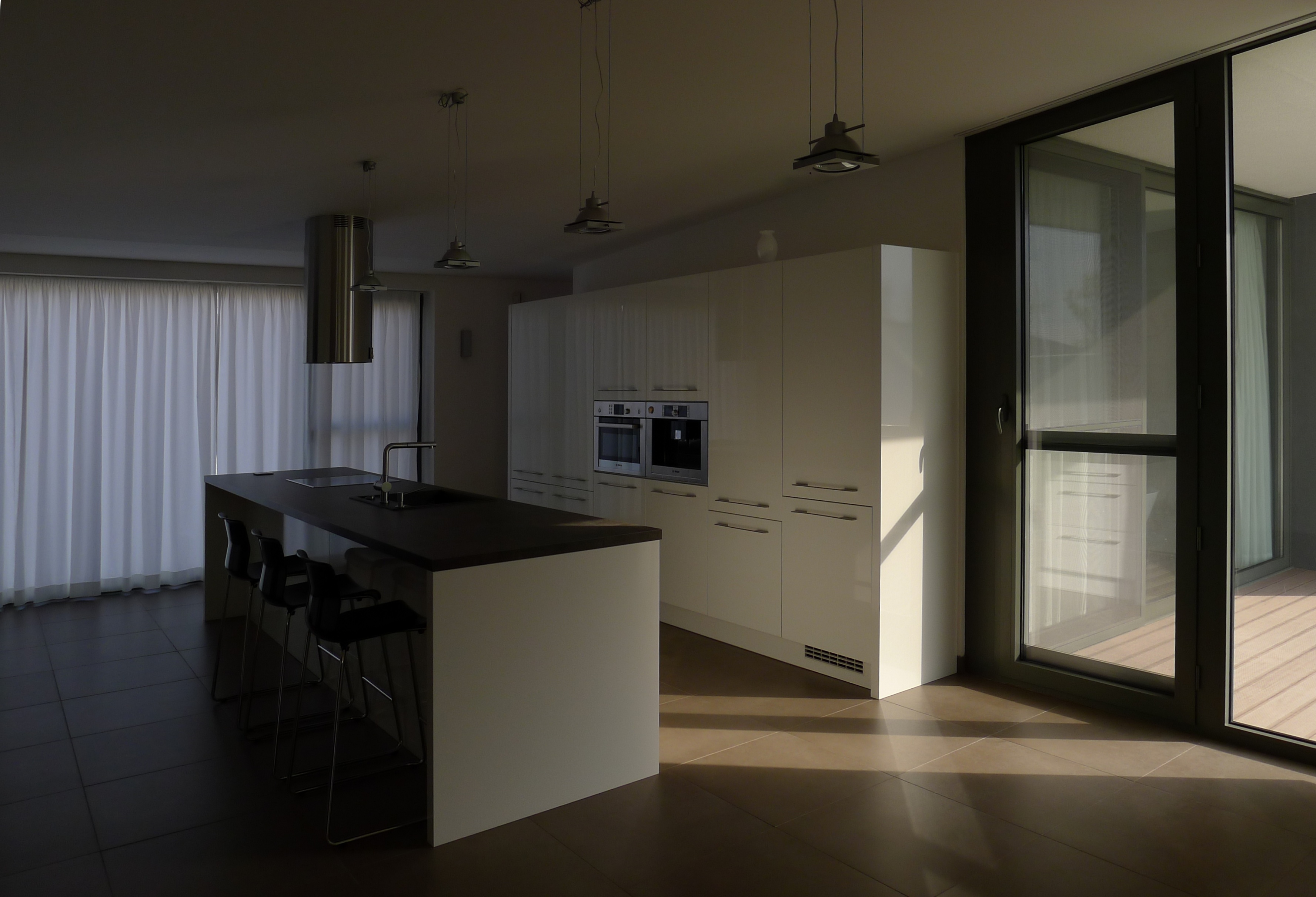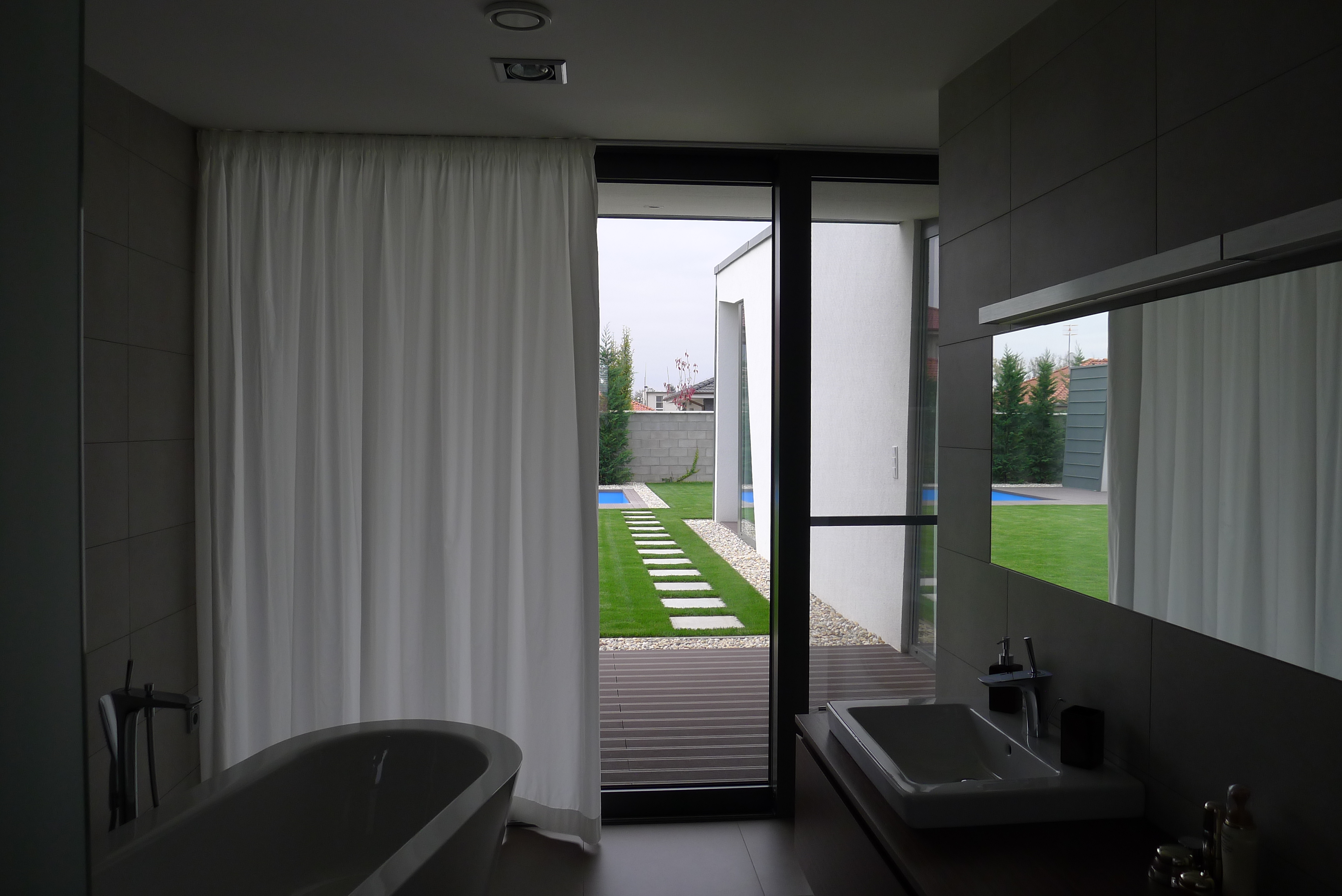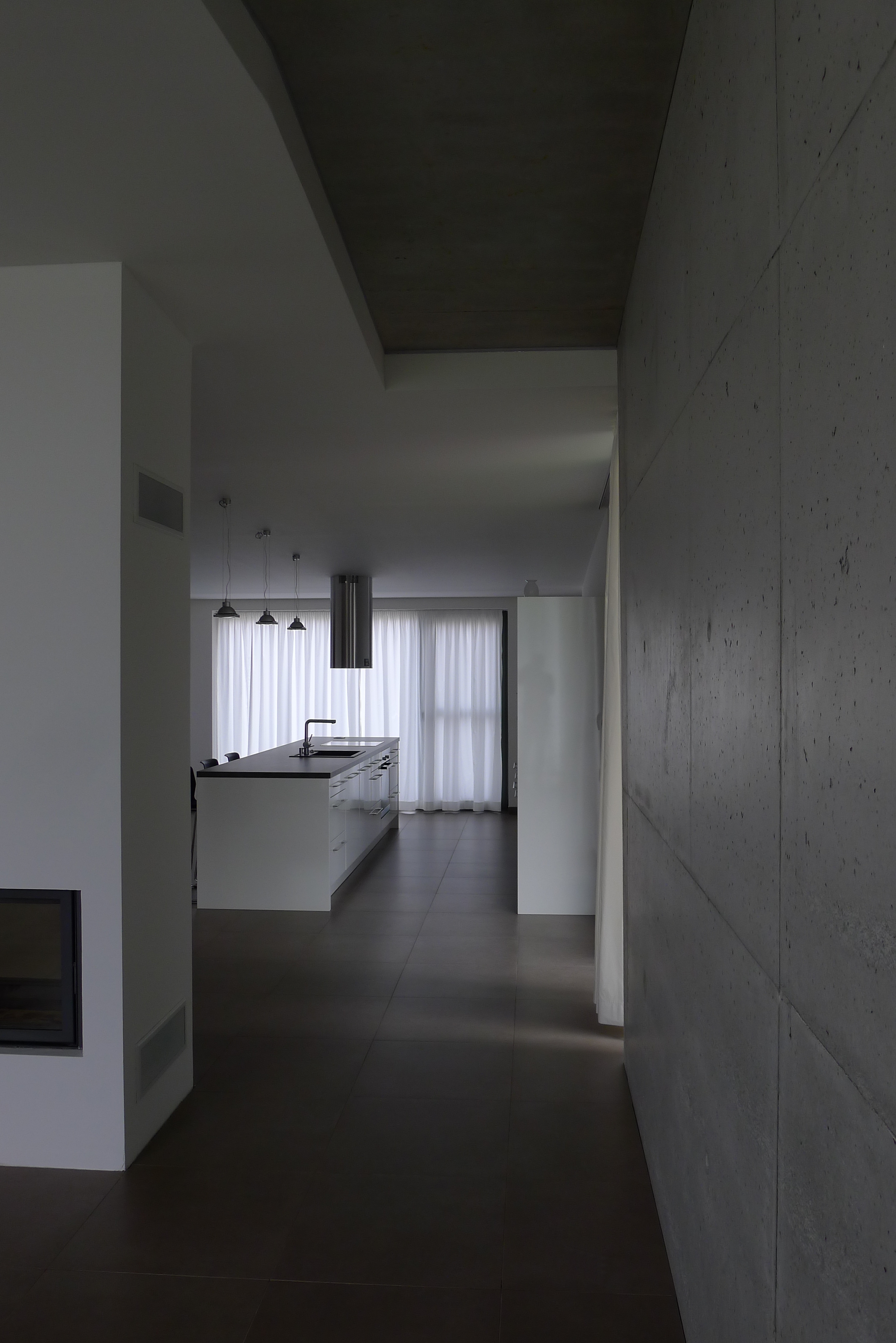 Zjednocujúcim materiálom je sivohnedá veľkoformátová dlažba a tmavohnedá dýha stolárskych výrobkov a mobiliáru. Obývačku oživuje stena a fragment stropu z pohľadového betónu.
