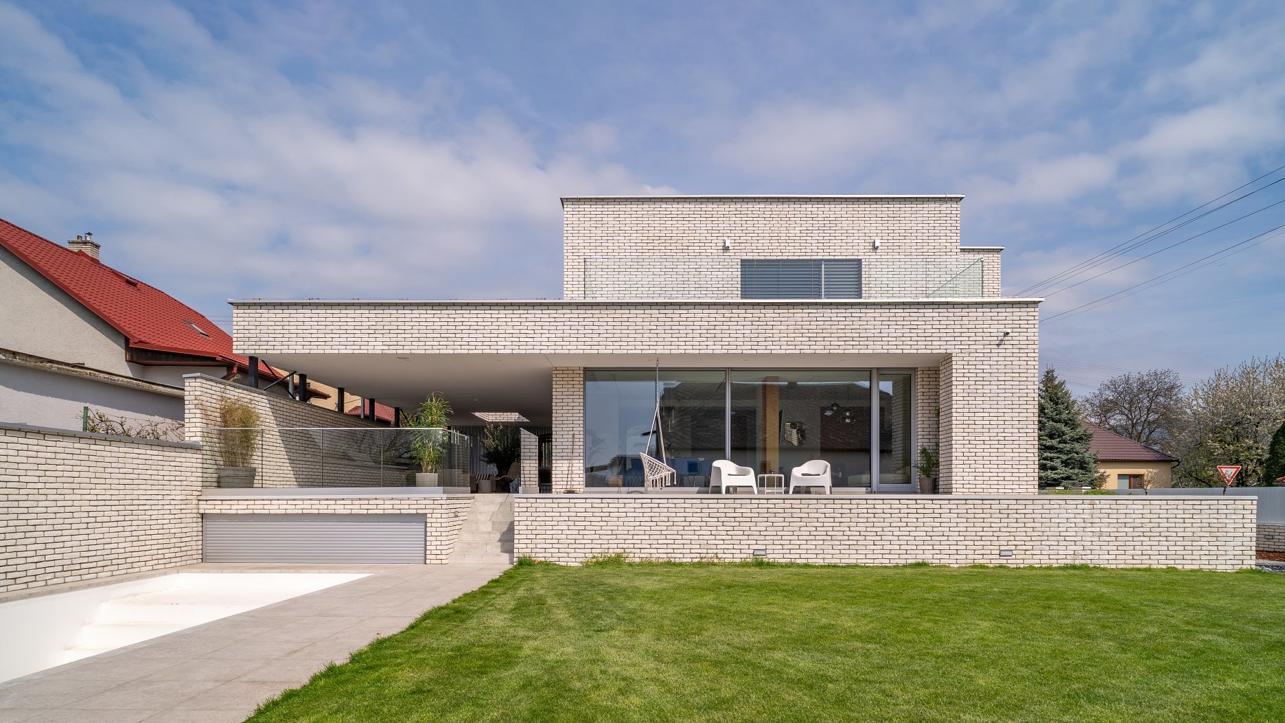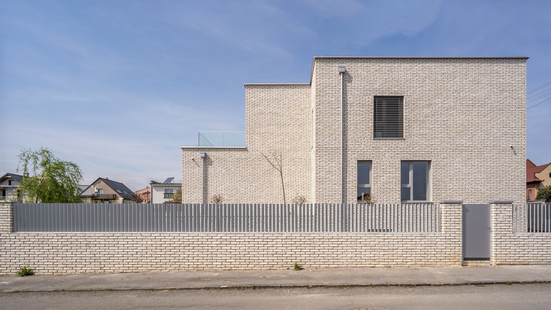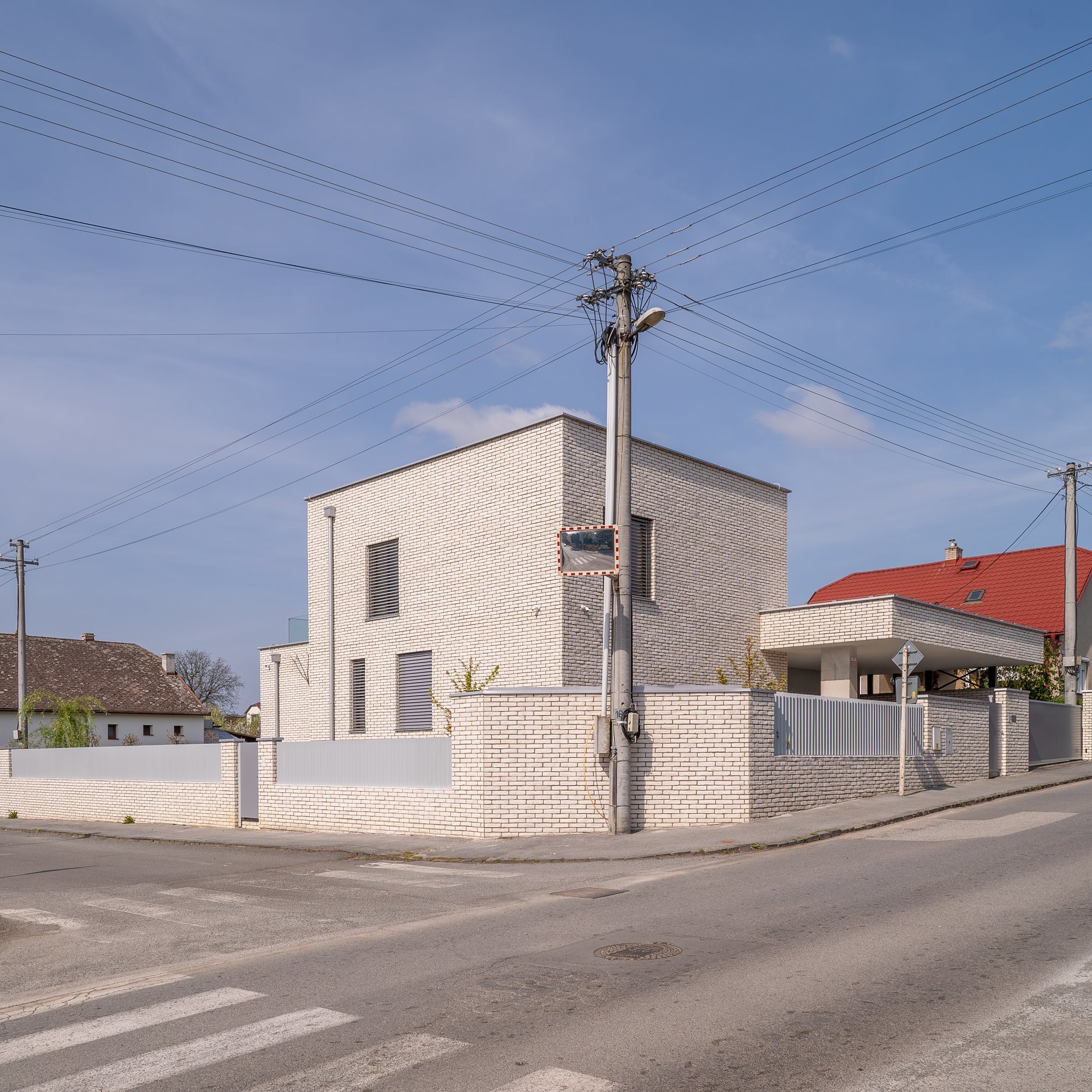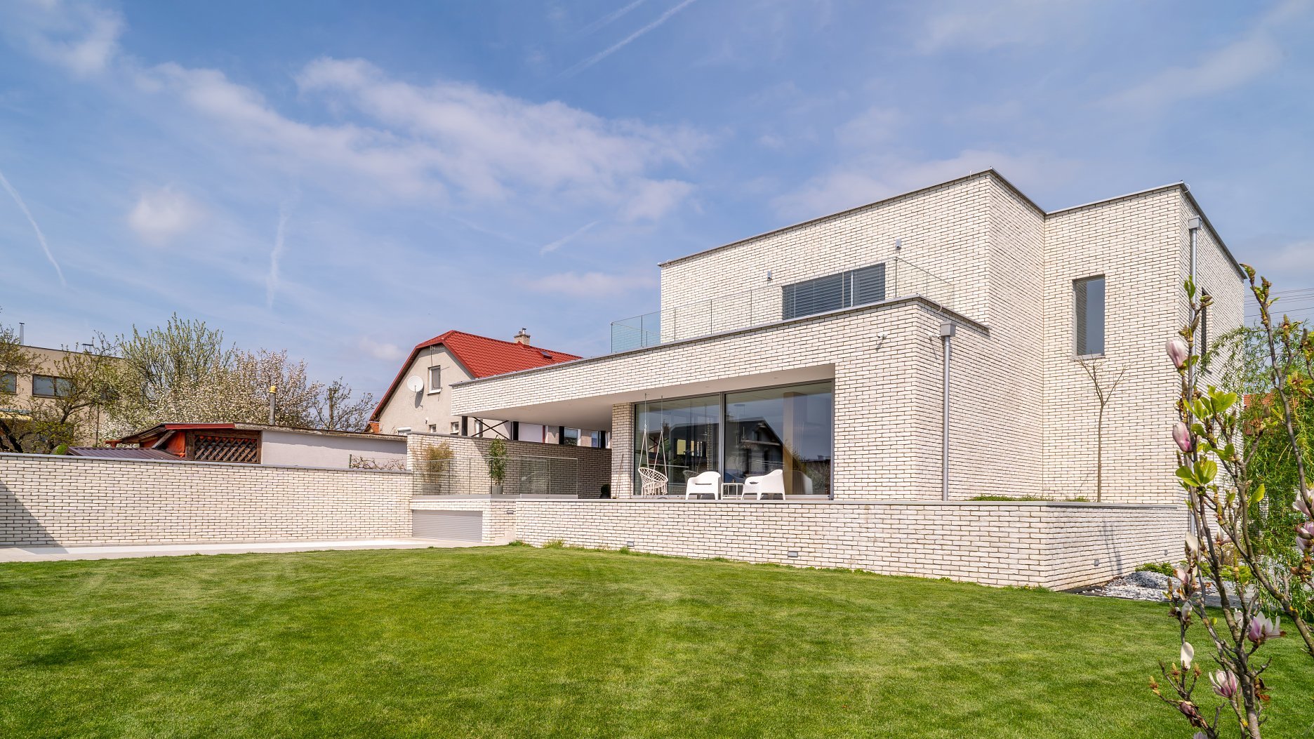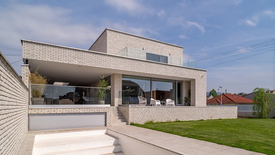 Exteriér rodinného domu charakterizujú tri materiály a farby. Dominantným prvkom na fasáde a oplotení sú biele / béžové tehličky. Tie dopĺňajú sivé hliníkové rámy okien a časti plota. Pochôdzne plochy tvoria betónové a dláždené povrchy. Všetko vyvažuje zeleň a stromy v záhrade.