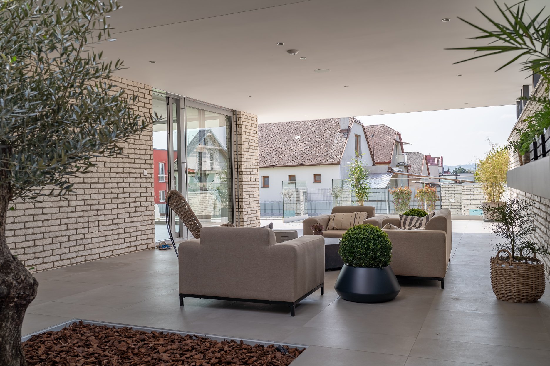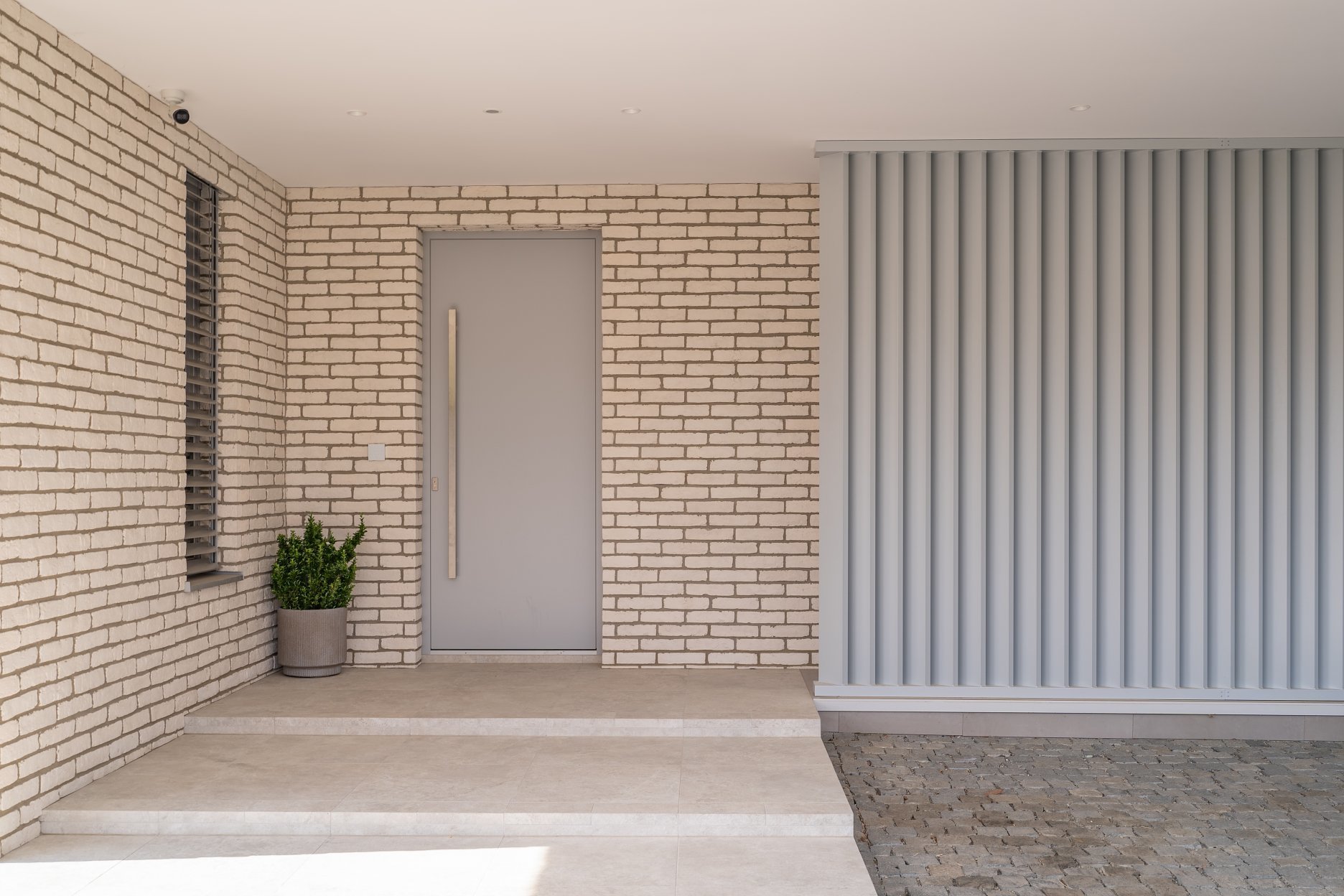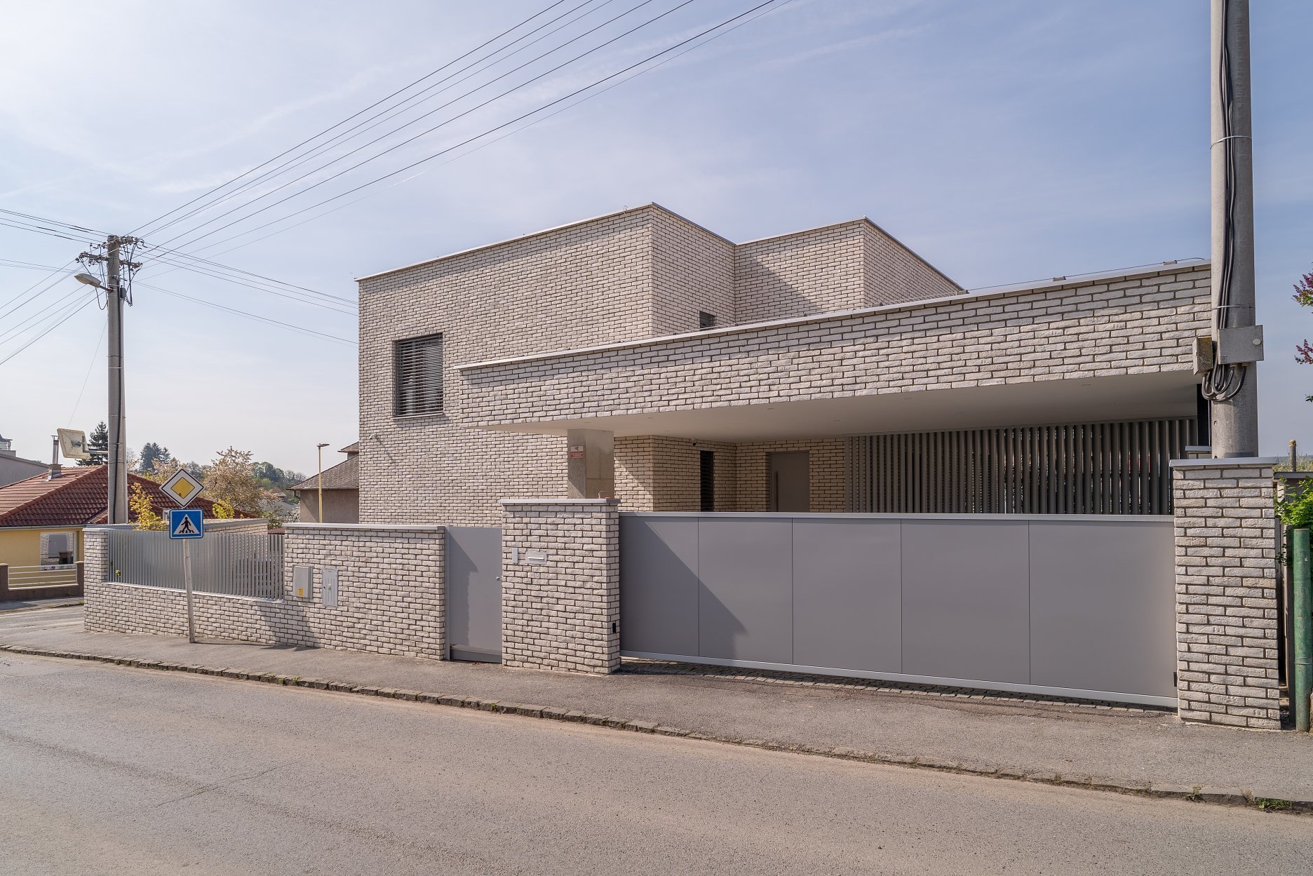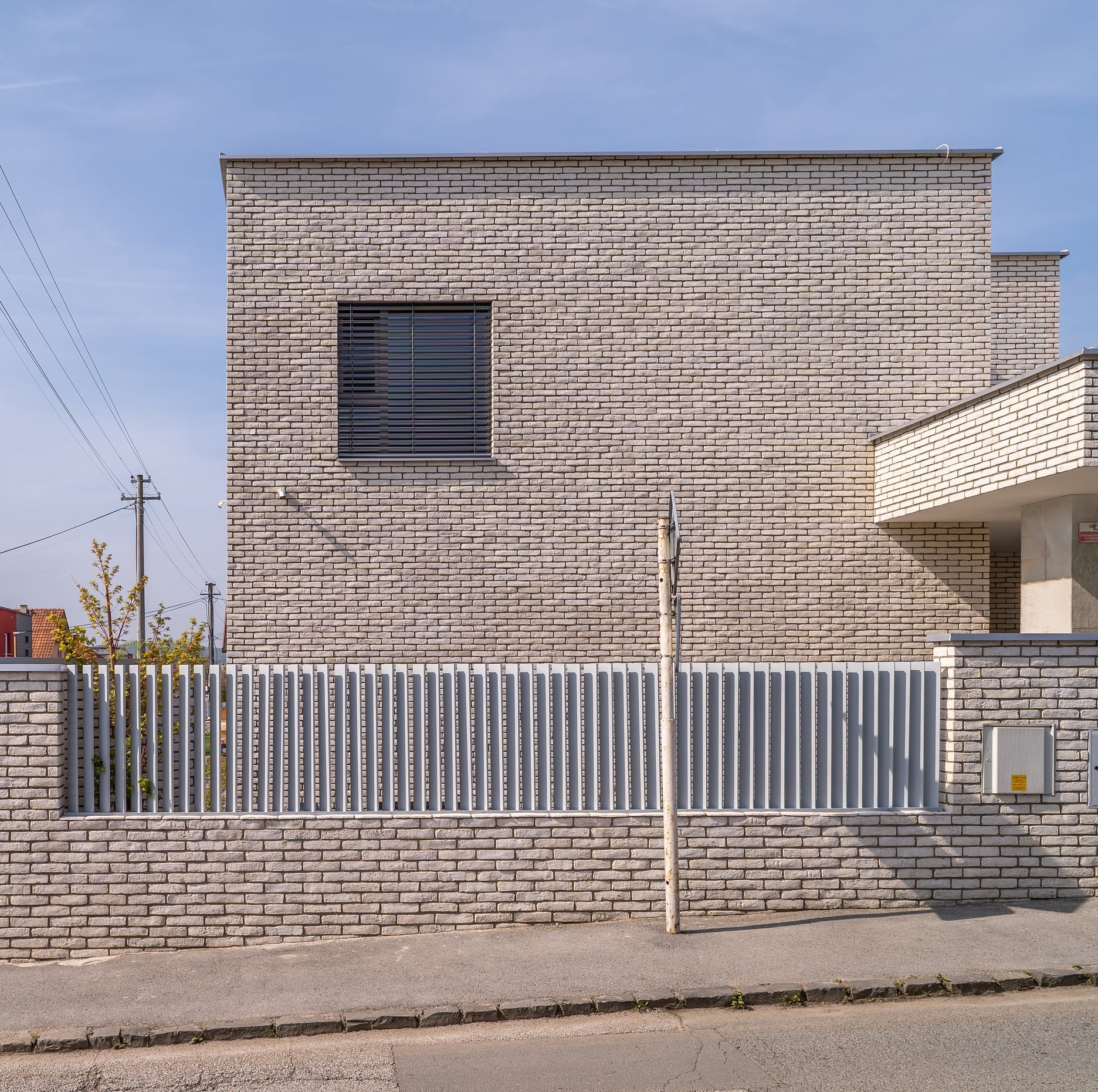 Exteriér rodinného domu charakterizujú tri materiály a farby. Dominantným prvkom na fasáde a oplotení sú biele / béžové tehličky. Tie dopĺňajú sivé hliníkové rámy okien a časti plota. Pochôdzne plochy tvoria betónové a dláždené povrchy. Všetko vyvažuje zeleň a stromy v záhrade.