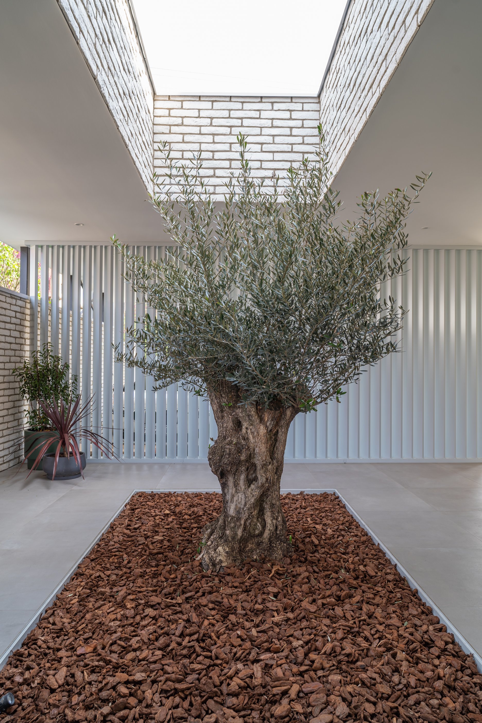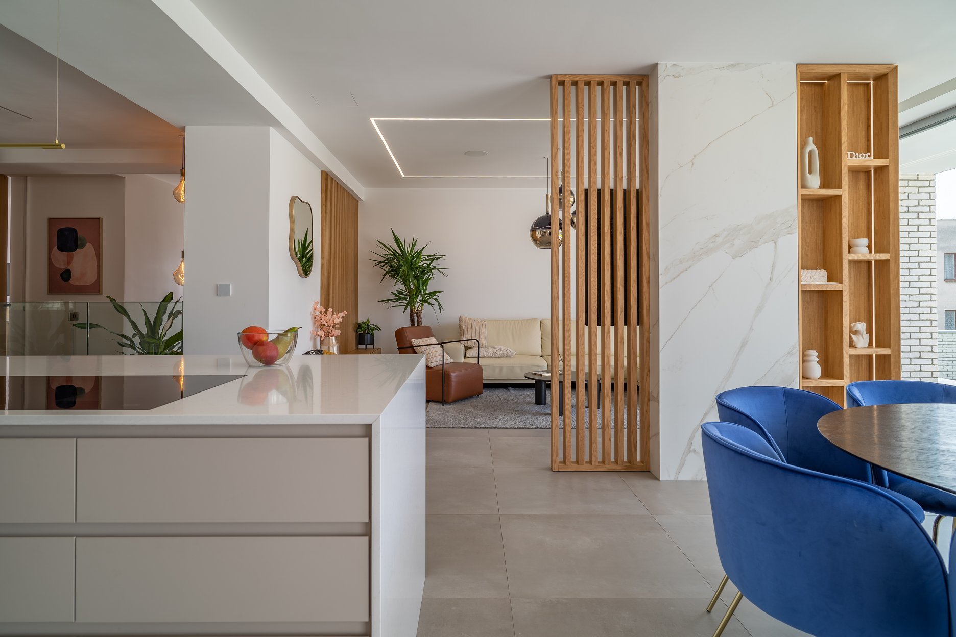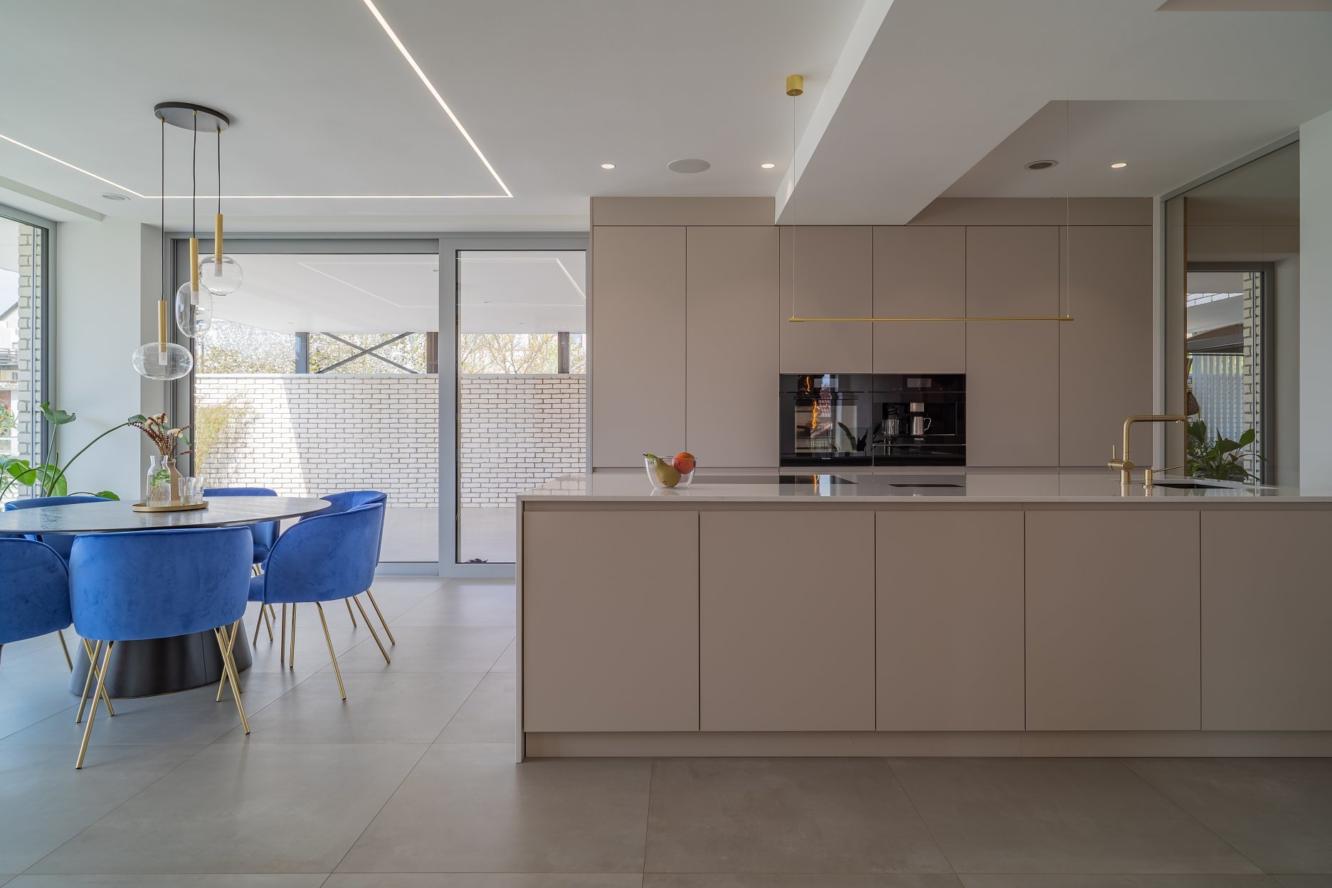 Spojitosť medzi interiérom a exteriérom podporuje sivá dlažba. V interiéri prevládajú biele steny. Farebnosť oživuje drevená dyha a kašmírová farba, zvolená ako akcent nábytkových prvkov na mieru. Kompozíciu dopĺňajú farebné kusy nábytku, svietidlá a rastliny. V kúpeľňi nájdeme kombináciu bieleho a čierneho calacatta mramoru. Návrh riešil aj stvárnenie ostatných miestností, ktoré nie sú súčasťou portfólia.