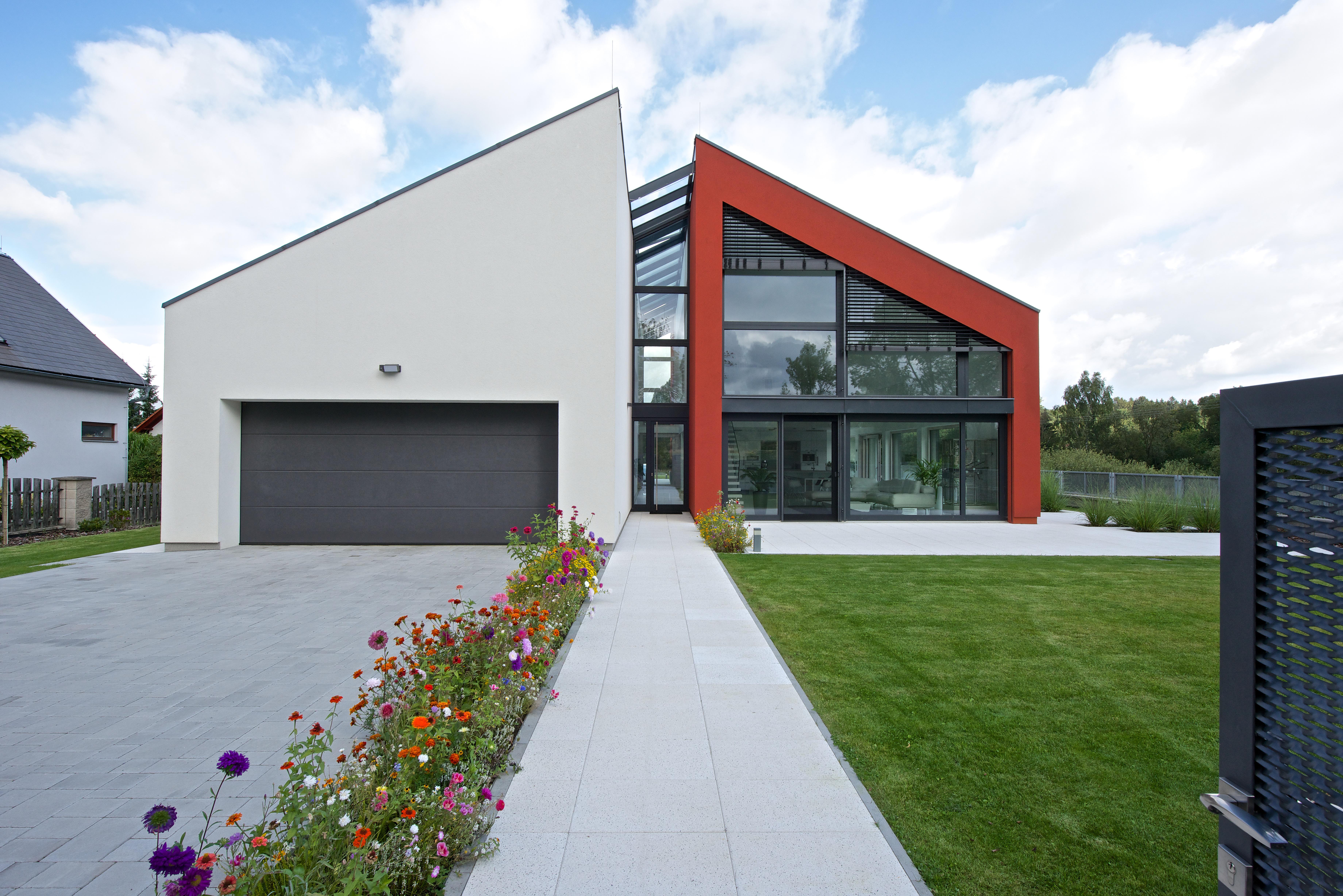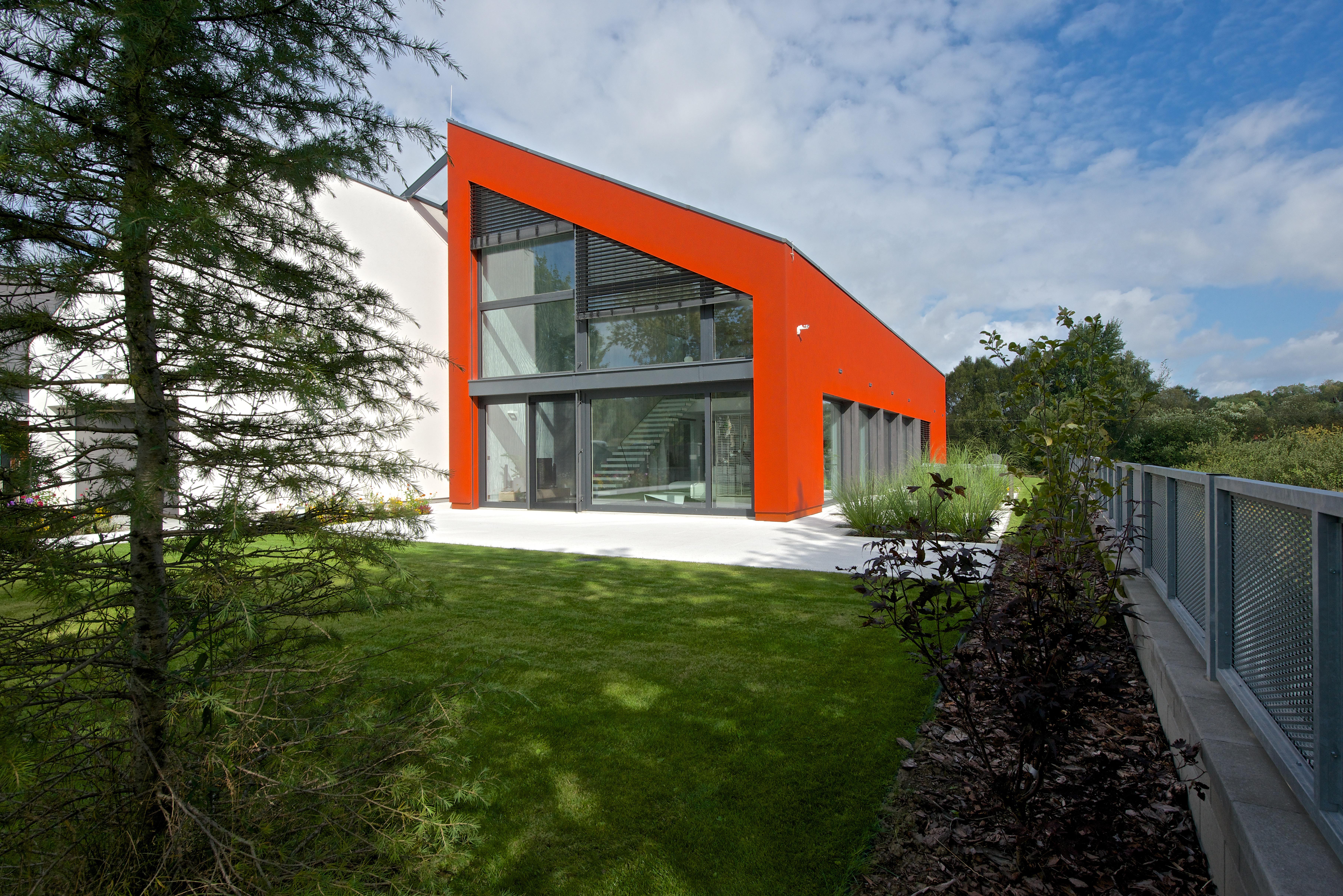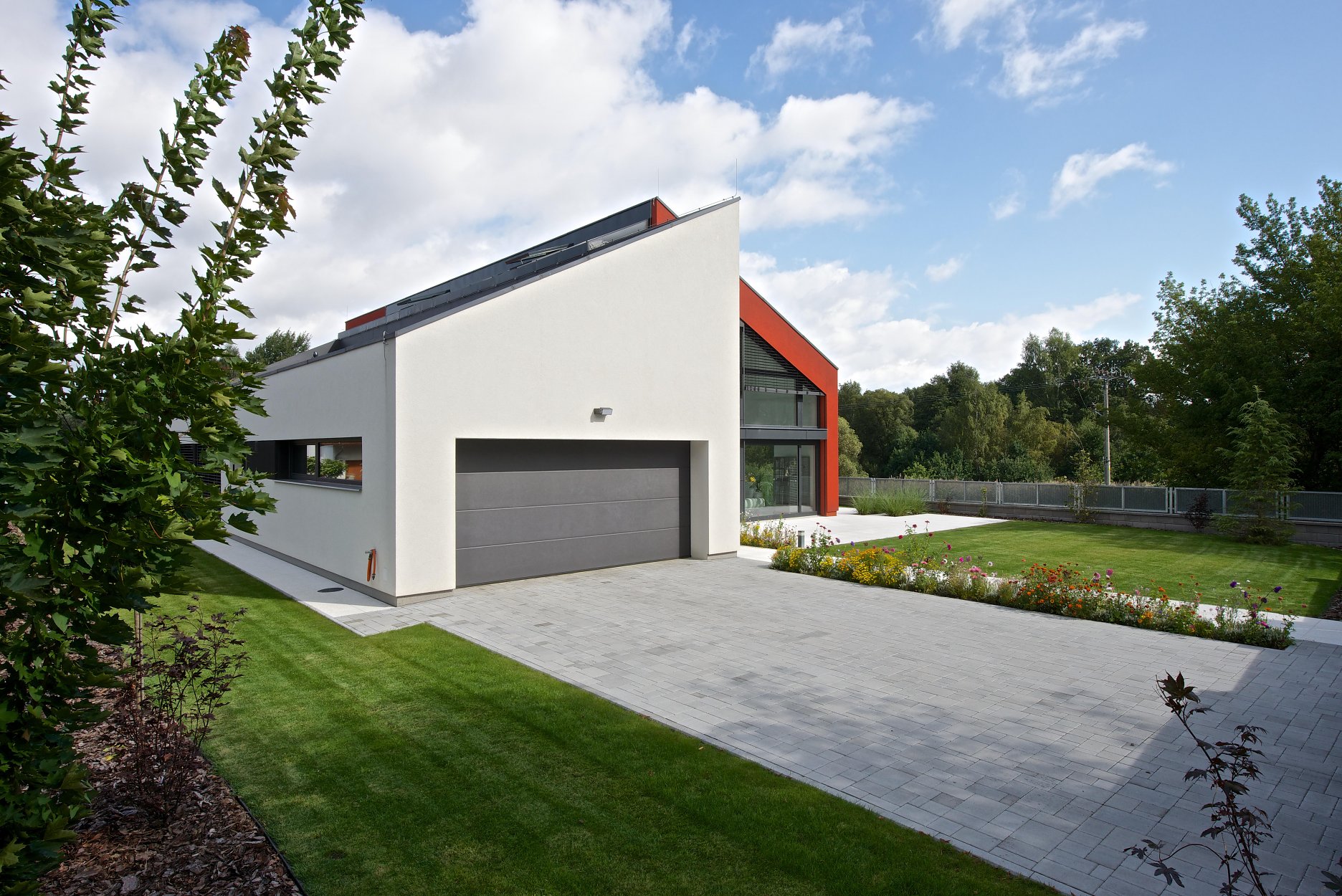 Objekt je dispozičně i kompozičně navržen jako trojtrakt. Východní a západní trakt tvoří samostatné hmoty s pultovou střechou, propojené středním spojovacím prostorem – halou, zastřešenou pultovým světlíkem. Západní nižší trakt je půdorysně mírně předsunut před hmotu východního traktu tak, že osoba přicházející od vstupní brány nevnímá výškový rozdíl hmot - opticky hmoty působí jako stejně vysoké. Toto předsunutí, také napomohlo k vytvoření útulnějšího prostoru pro jižní a severní terasu, posunutí garáže blíže ke komunikaci a prosvětlení místností v soukromé části východního traktu. Prosklenou spojovací halou, která je prodloužením přístupového chodníku, je umožněn průhled do prostoru zahrady za domem. Štítová stěna východního traktu je prosklená, velké plochy oken jsou výrazným prvkem východní i západní fasády. Fasáda východního traktu byla v návrhu obložena fasádními deskami rezavé barvy, ale na přání klienta byla změněna na omítku v podobném tónu vybraného obkladu. Západní trakt je dle původního návrhu v bílé omítce. Nenápadná plechová střešní krytina je skryta za střešní atikou domu.