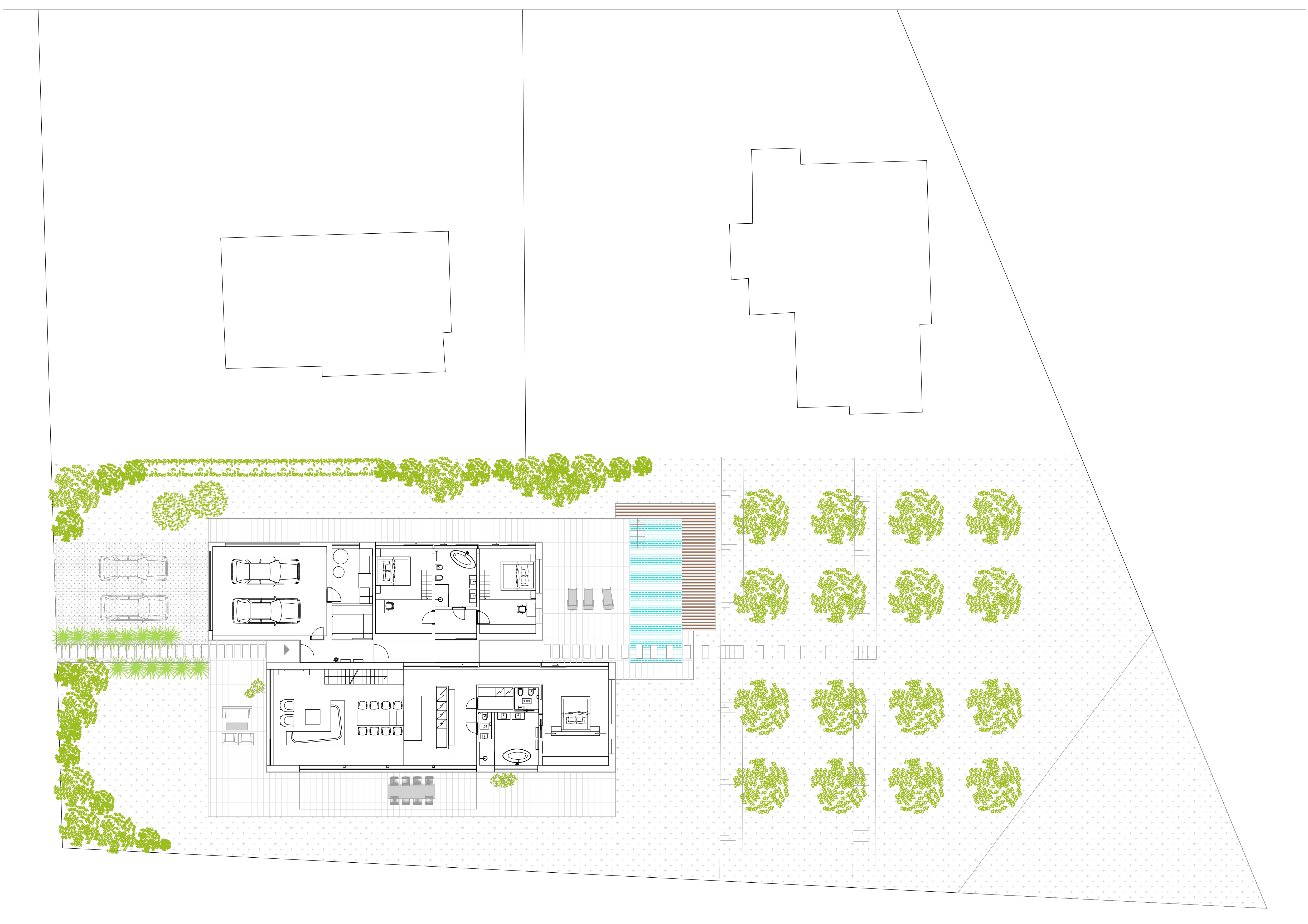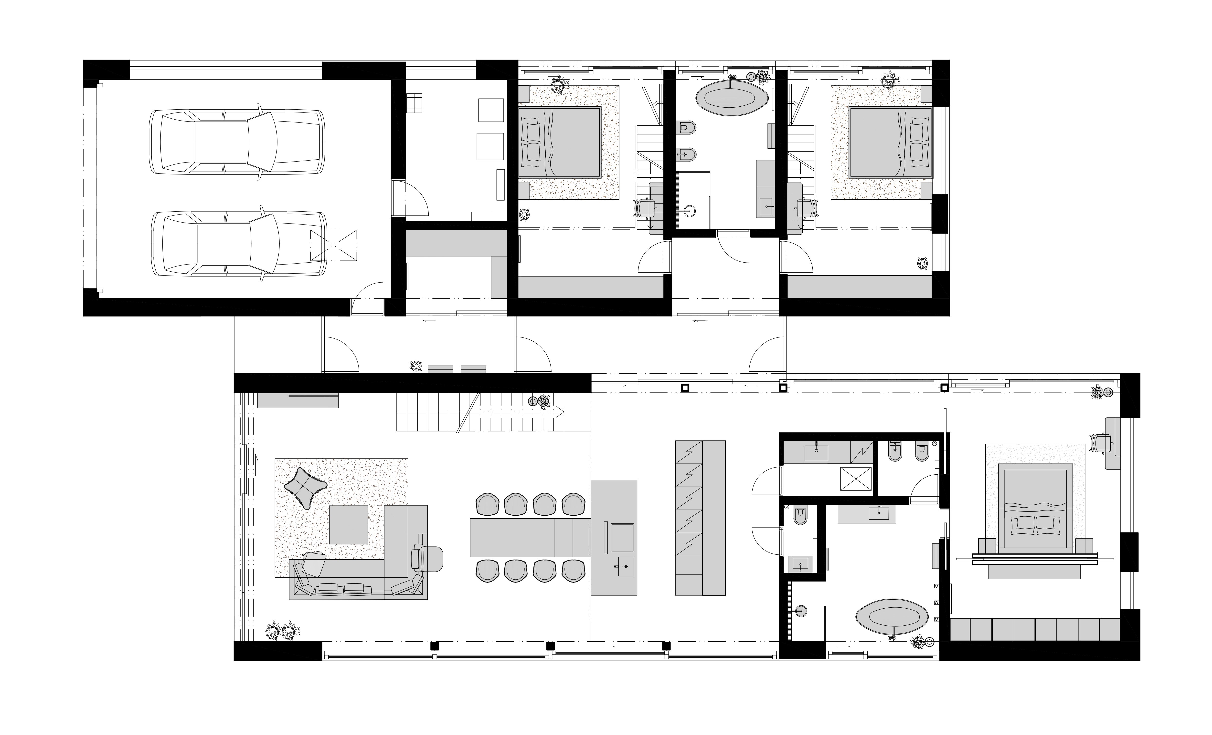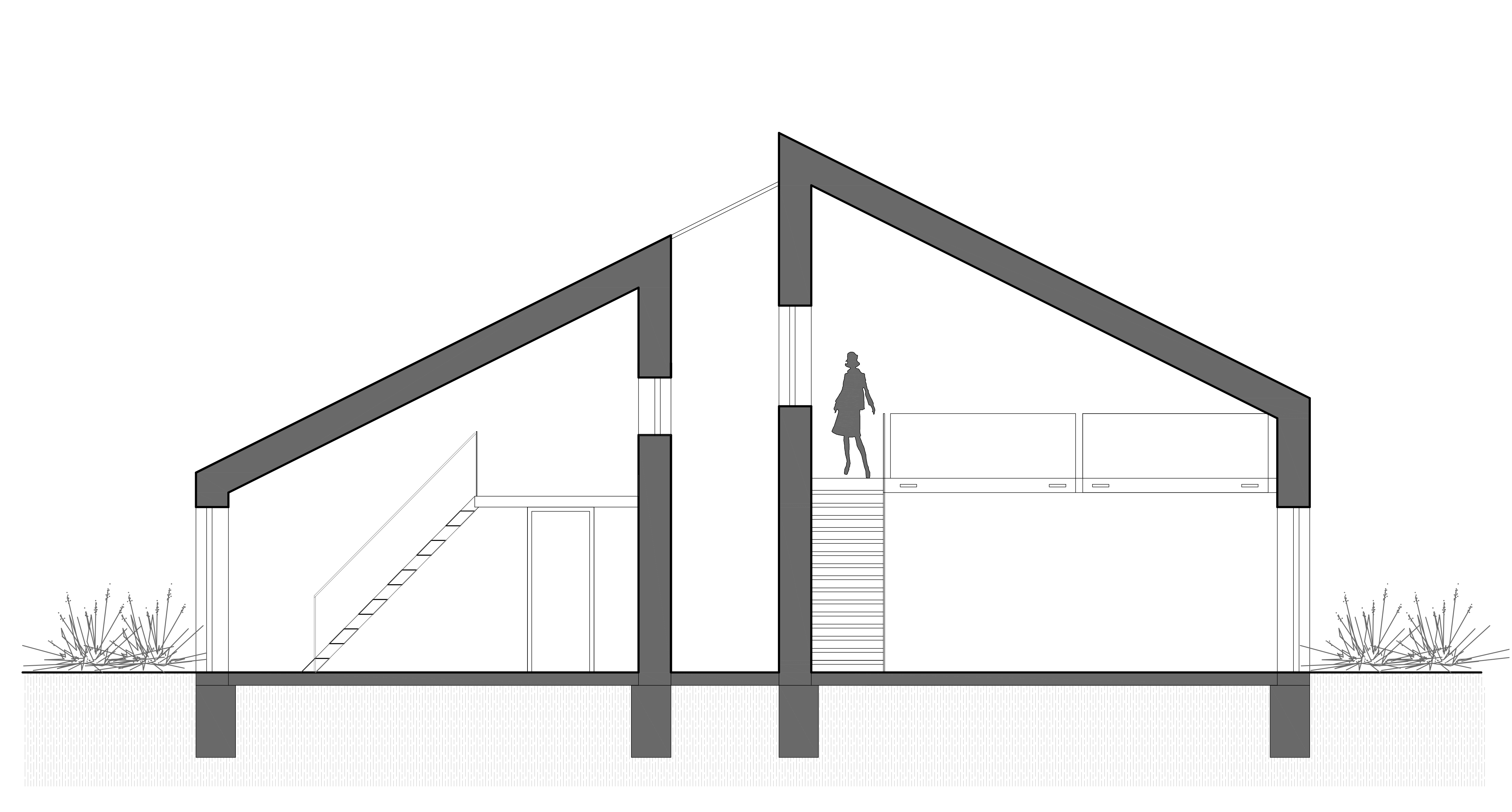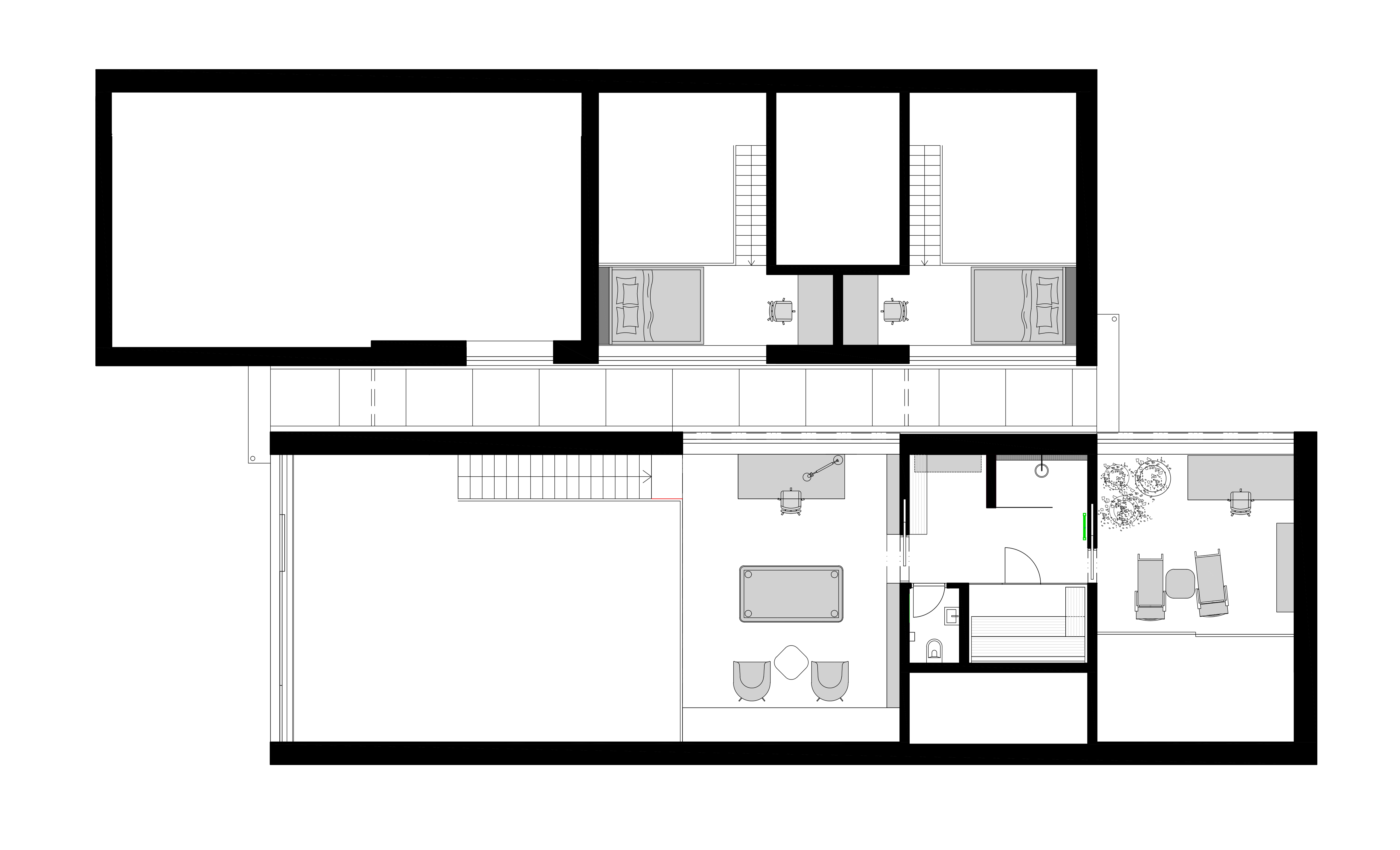 Východní hmota domu je určena pro potřeby manželského páru a západní hmota pak pro jejich dospělé děti s rodinami, které obývají dům jen u příležitostí návštěv.
