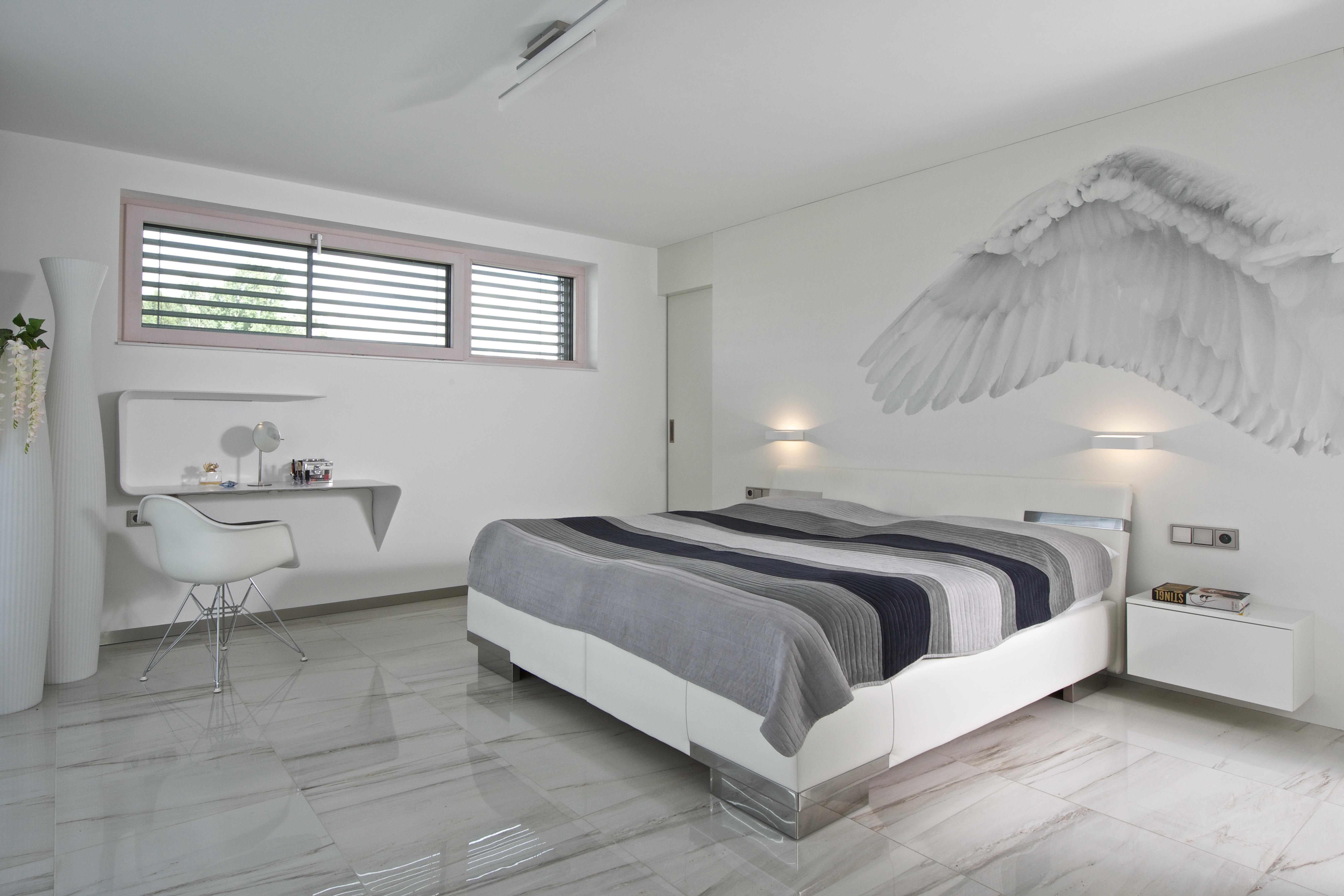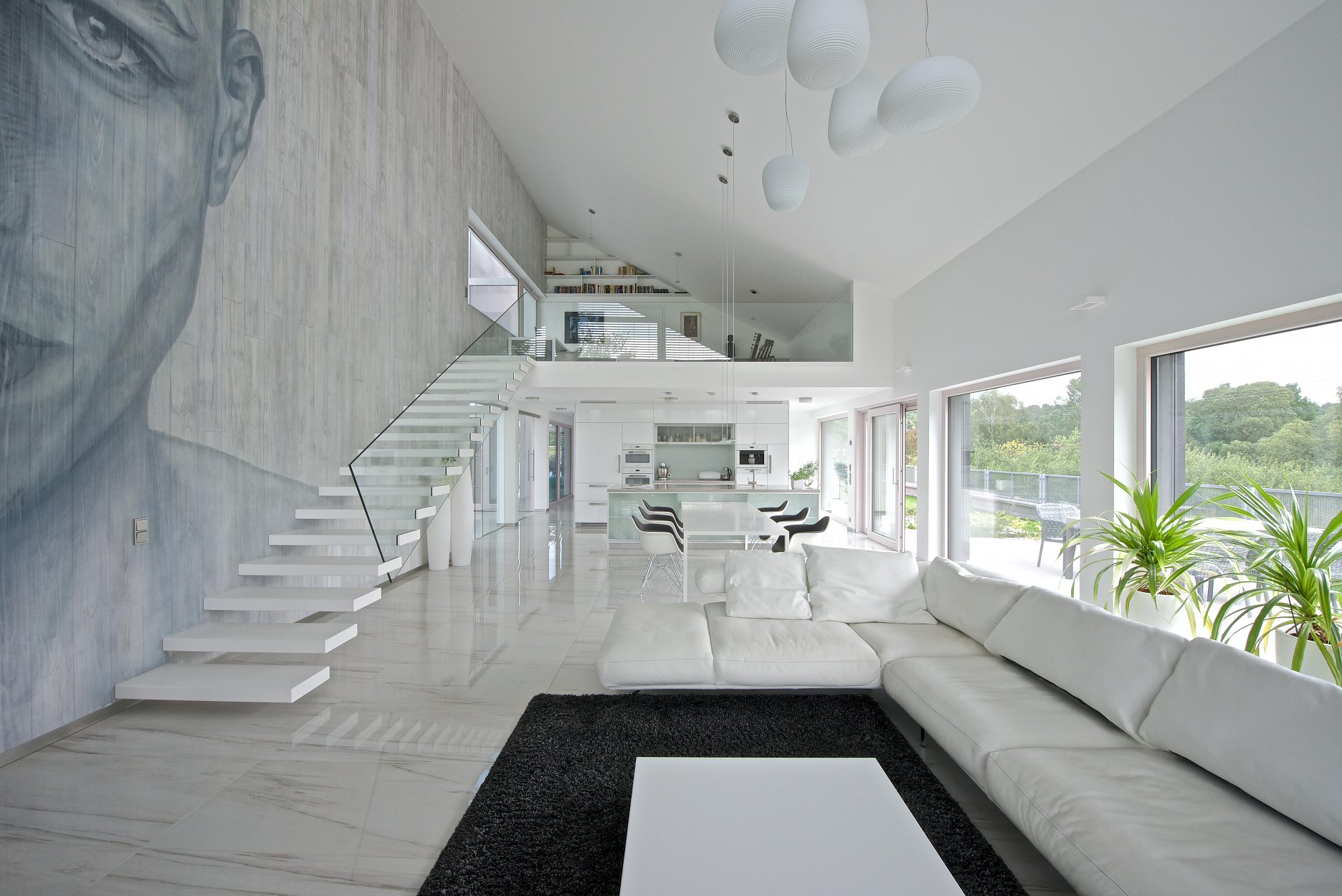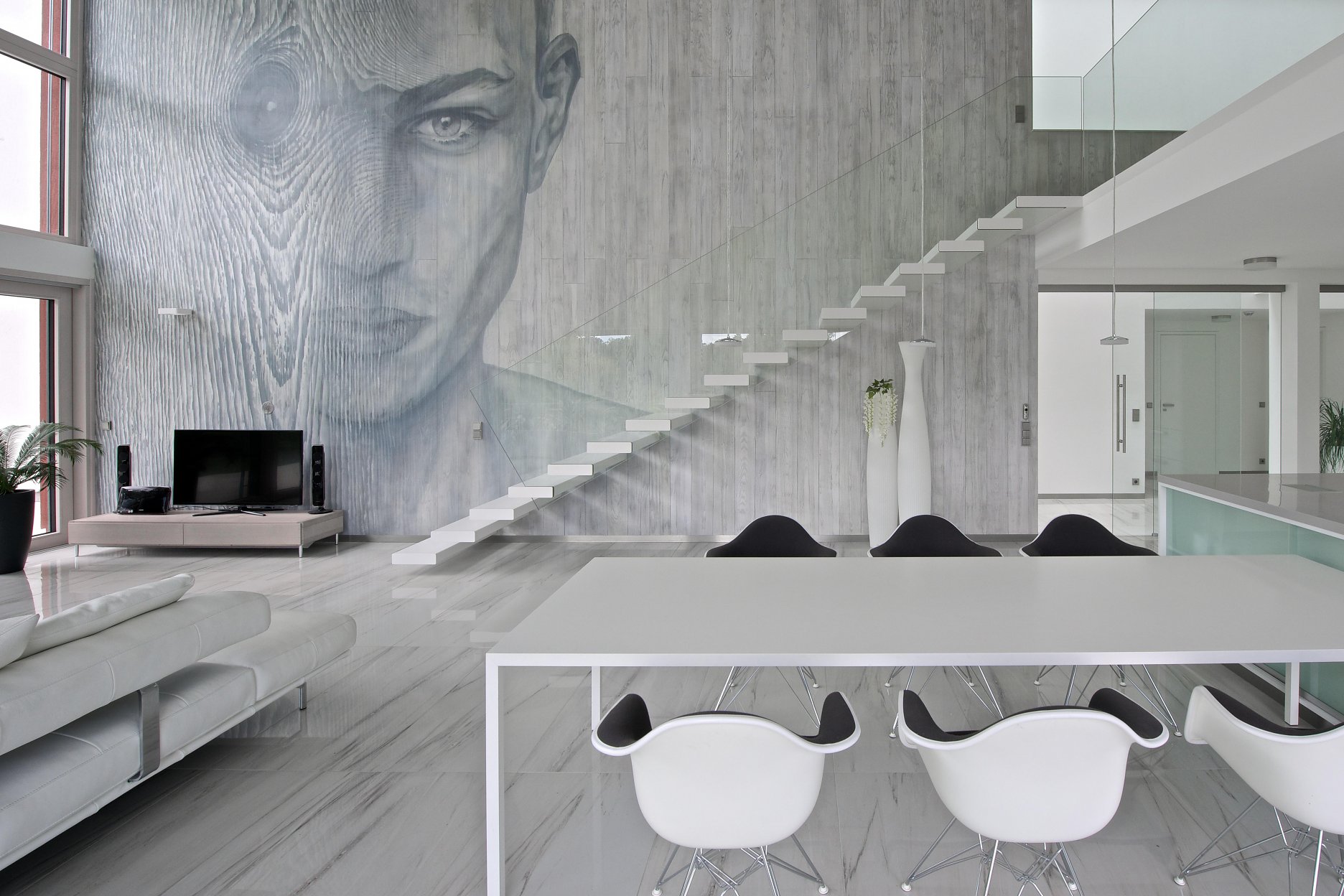 Dominantou převýšeného obývacího pokoje je původně fotografická koláž Antonia Mory namalovaná na stěnu 6x12m Ondřejem Laštůvkou.