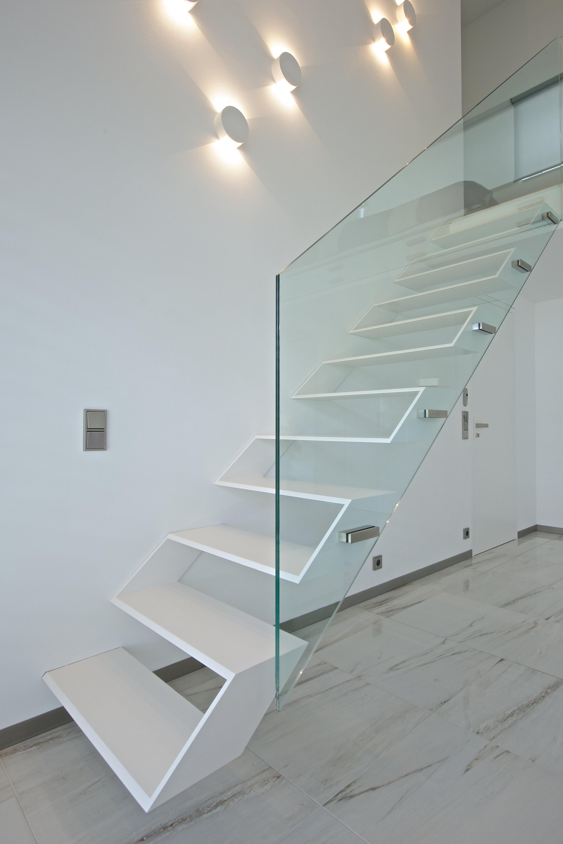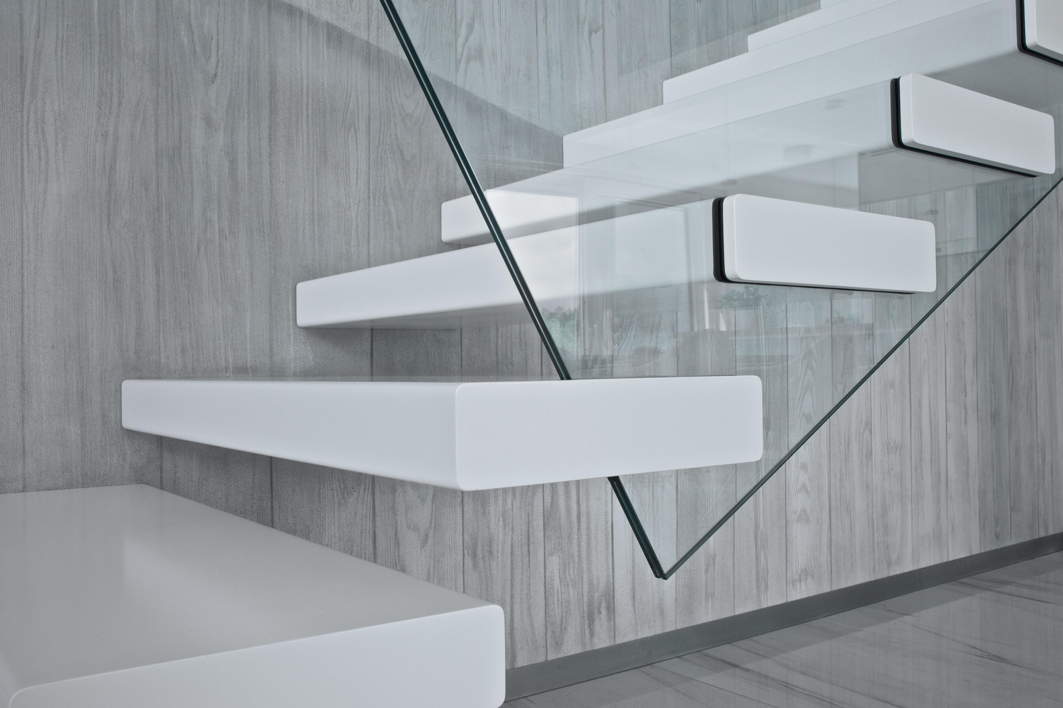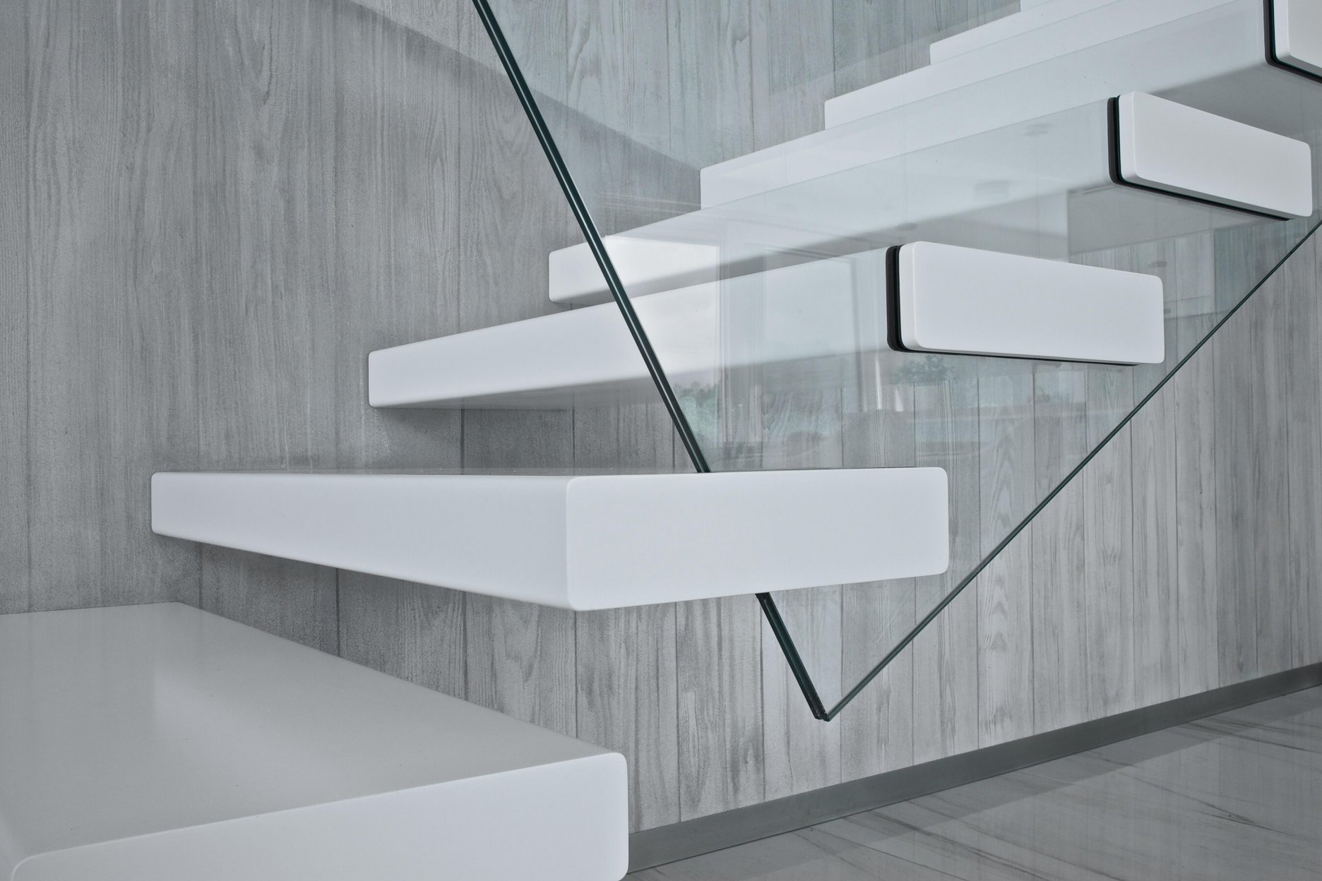 Jednoramenná ocelová schodiště jsou opatřena skleněným zábradlím.