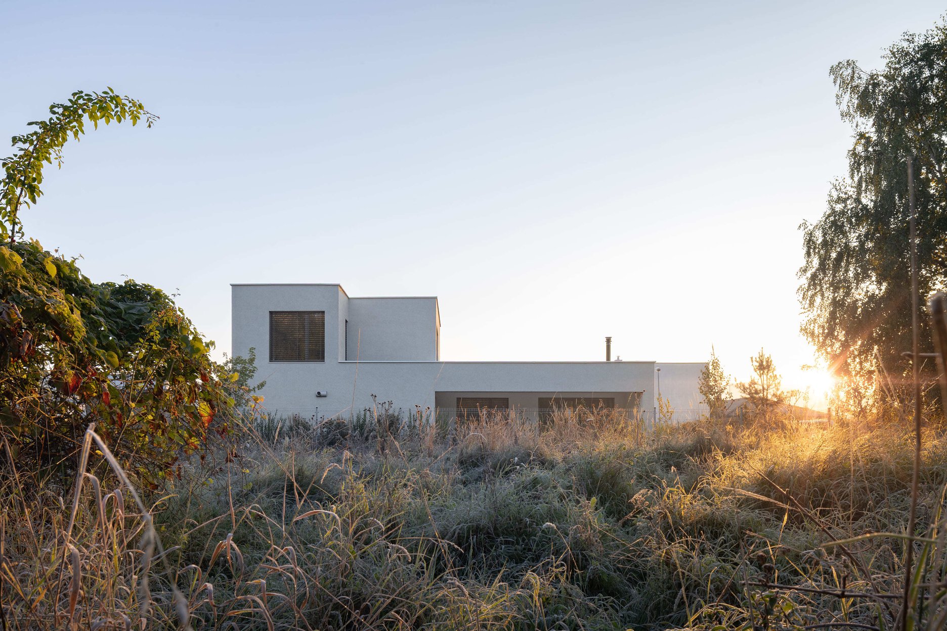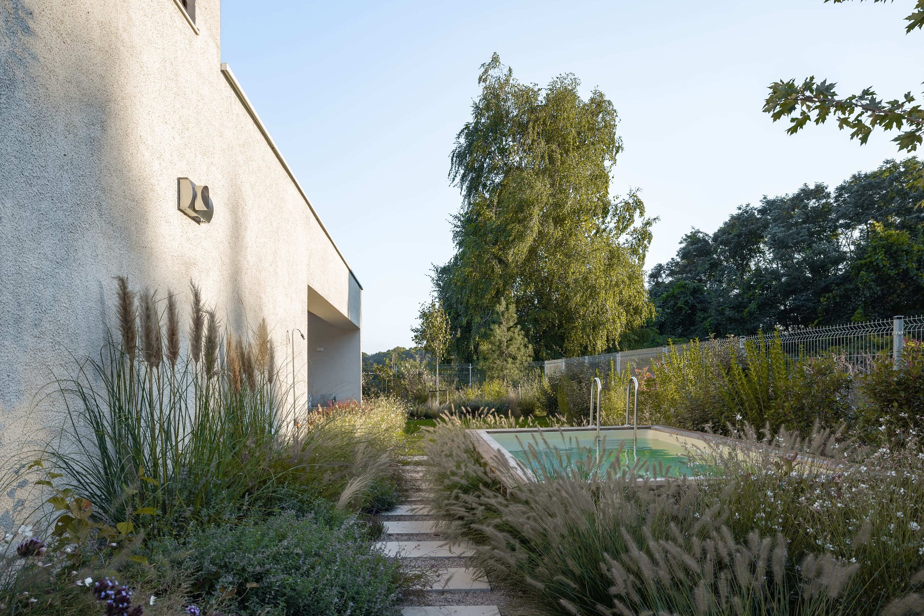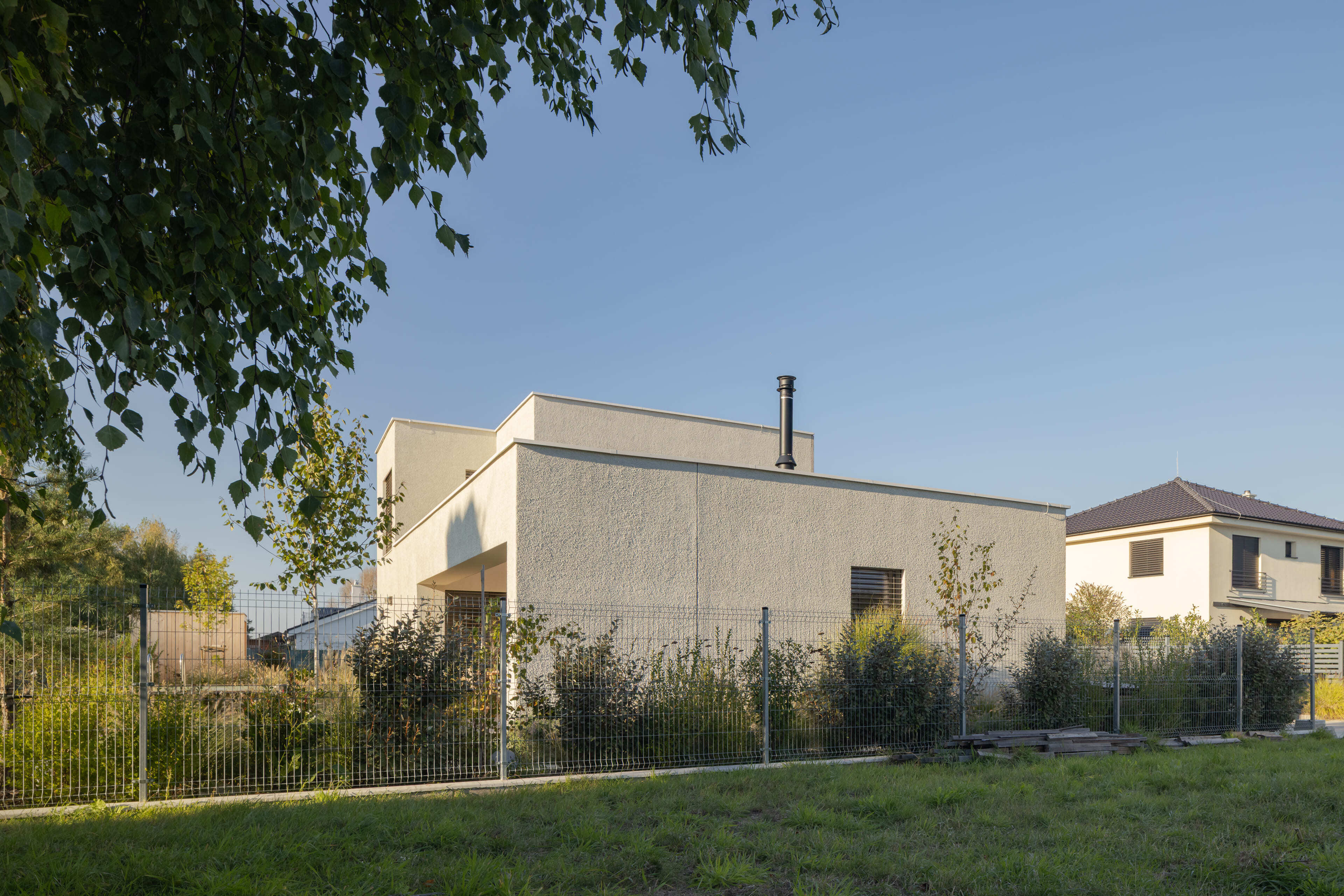 Dom sa otvára najmä na západ do záhrady s trvalkami, ktorá plynule prechádza do otvorenej krajiny. Z okna spálne vzniká dojem, akoby ste sedeli na poľovníckom posede – majitelia odtiaľ neraz pozorujú pasúcu sa divú zver. Na pozemku sa nachádza aj čiastočne zapustený drevom obložený bazén, ktorý si už po roku spontánne privlastnilo divoké rastlinstvo.