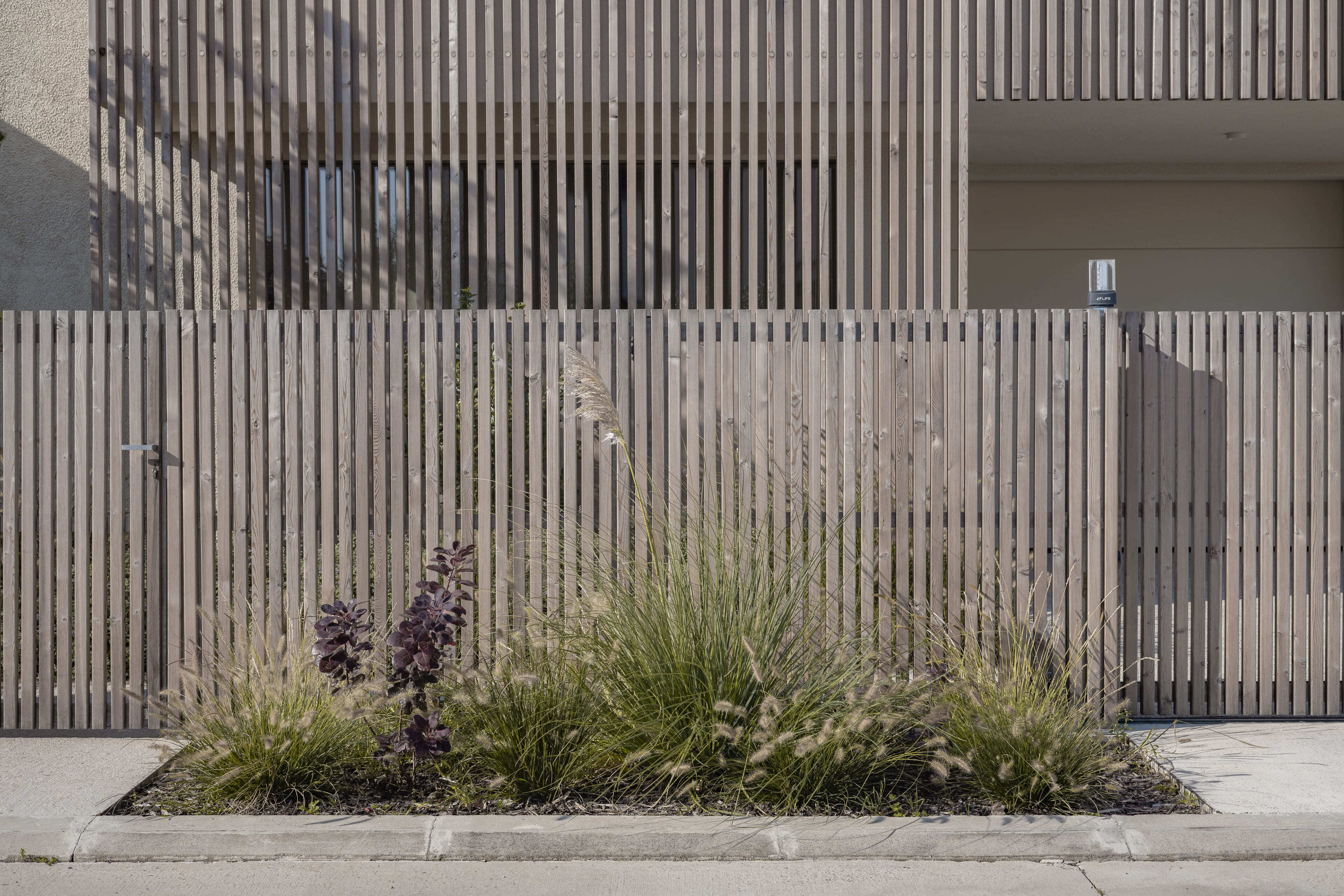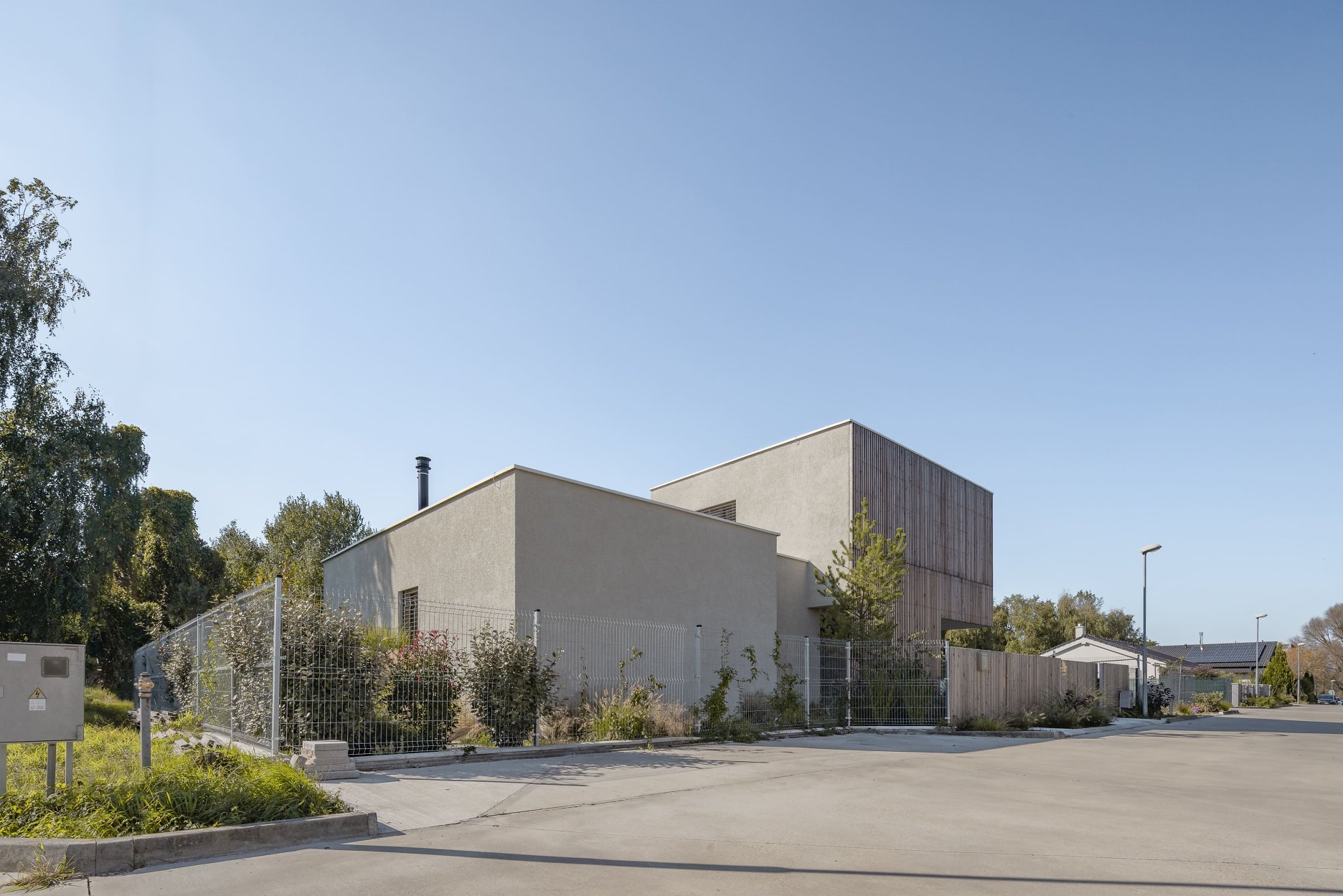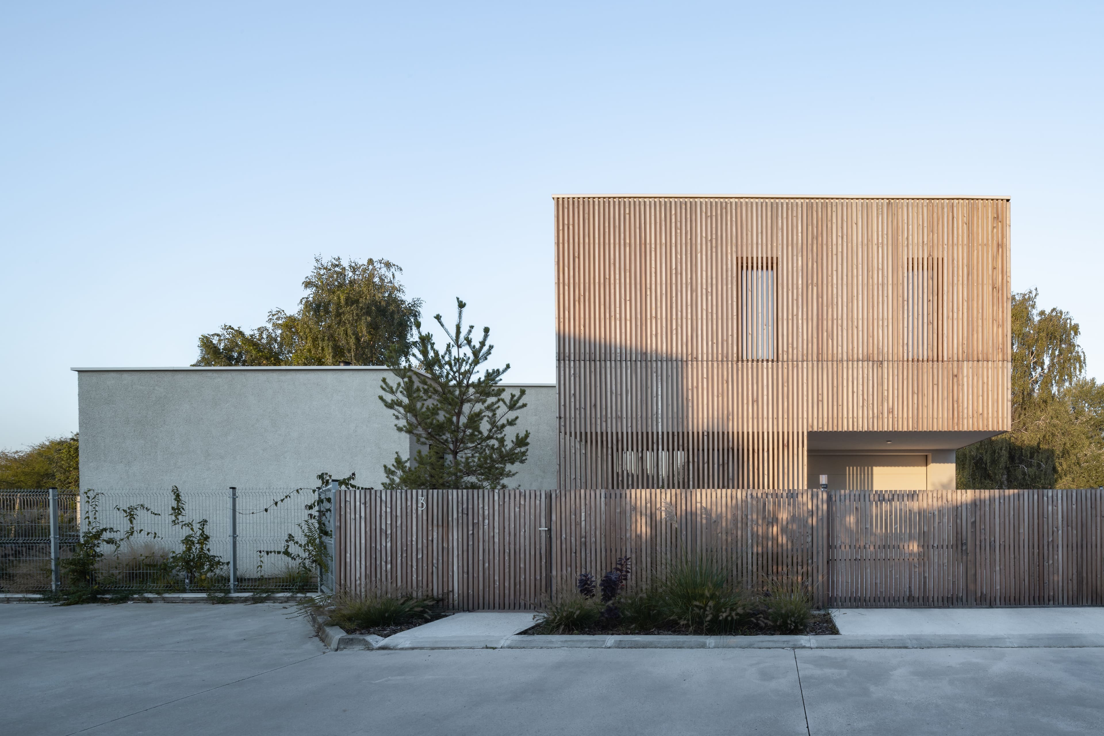 Dom sa otvára najmä na západ do záhrady s trvalkami, ktorá plynule prechádza do otvorenej krajiny. Z okna spálne vzniká dojem, akoby ste sedeli na poľovníckom posede – majitelia odtiaľ neraz pozorujú pasúcu sa divú zver. Na pozemku sa nachádza aj čiastočne zapustený drevom obložený bazén, ktorý si už po roku spontánne privlastnilo divoké rastlinstvo.
