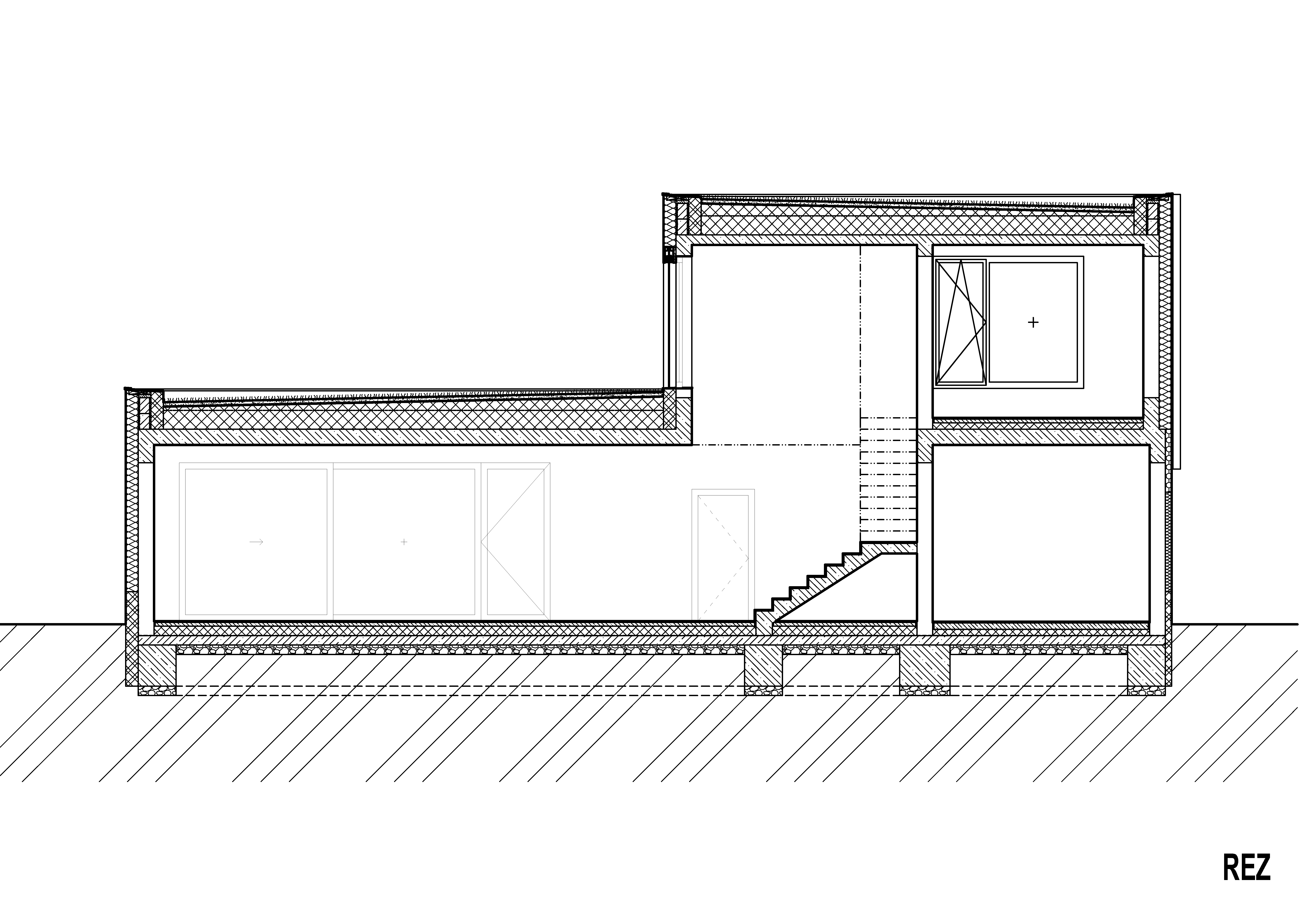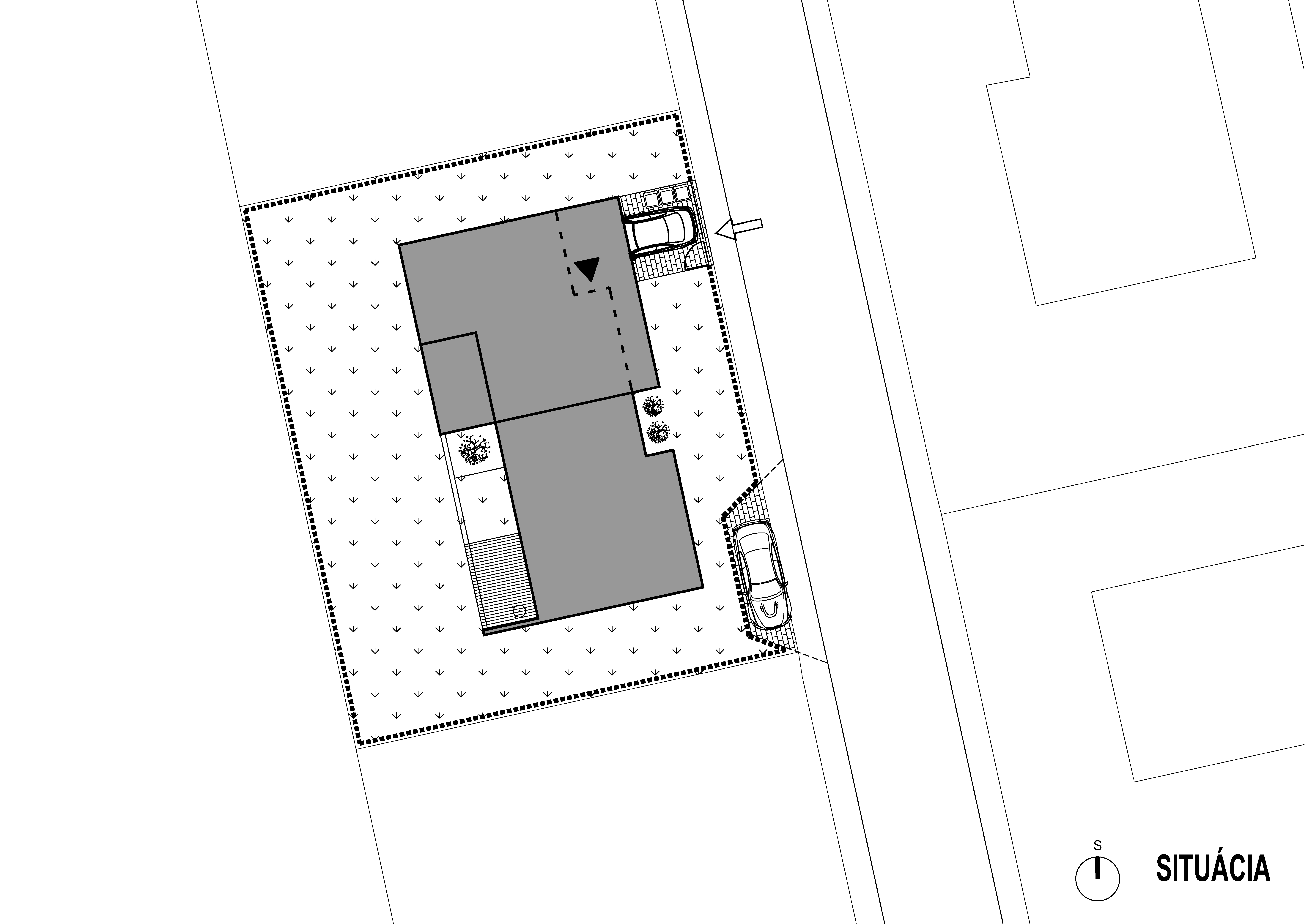 Rodinný dom s pôdorysom v tvare členitého obdĺžnika je riešený ako jednopodlažný objekt s ustúpeným podlažím a plochou strechou s extenzívnou zeleňou.