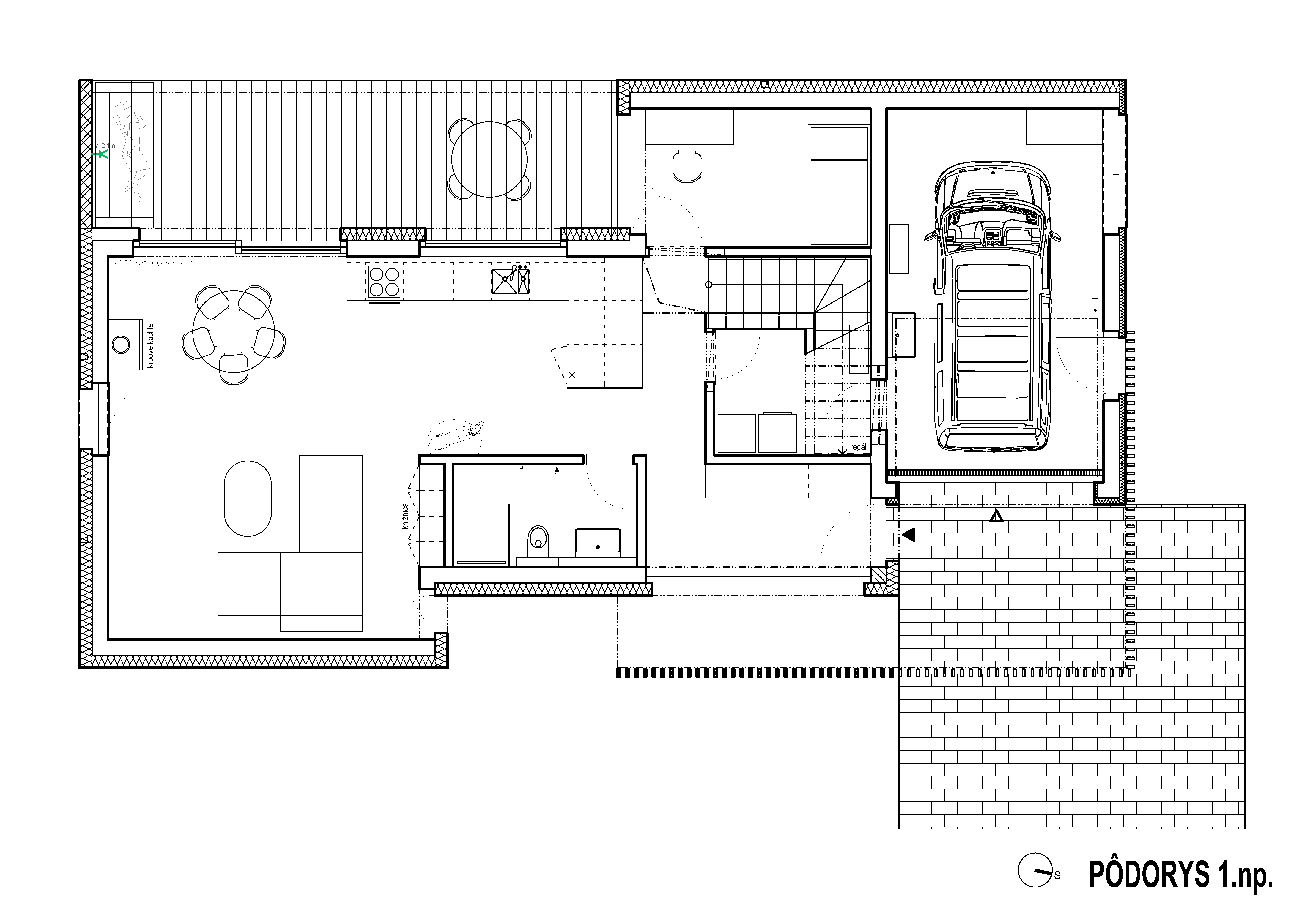 Prvé nadzemné podlažie dopĺňa hosťovská izba. Garáž, ktorá je súčasťou rodinného domu, je s dennou časťou prepojená filtrom / technickou miestnosťou.
