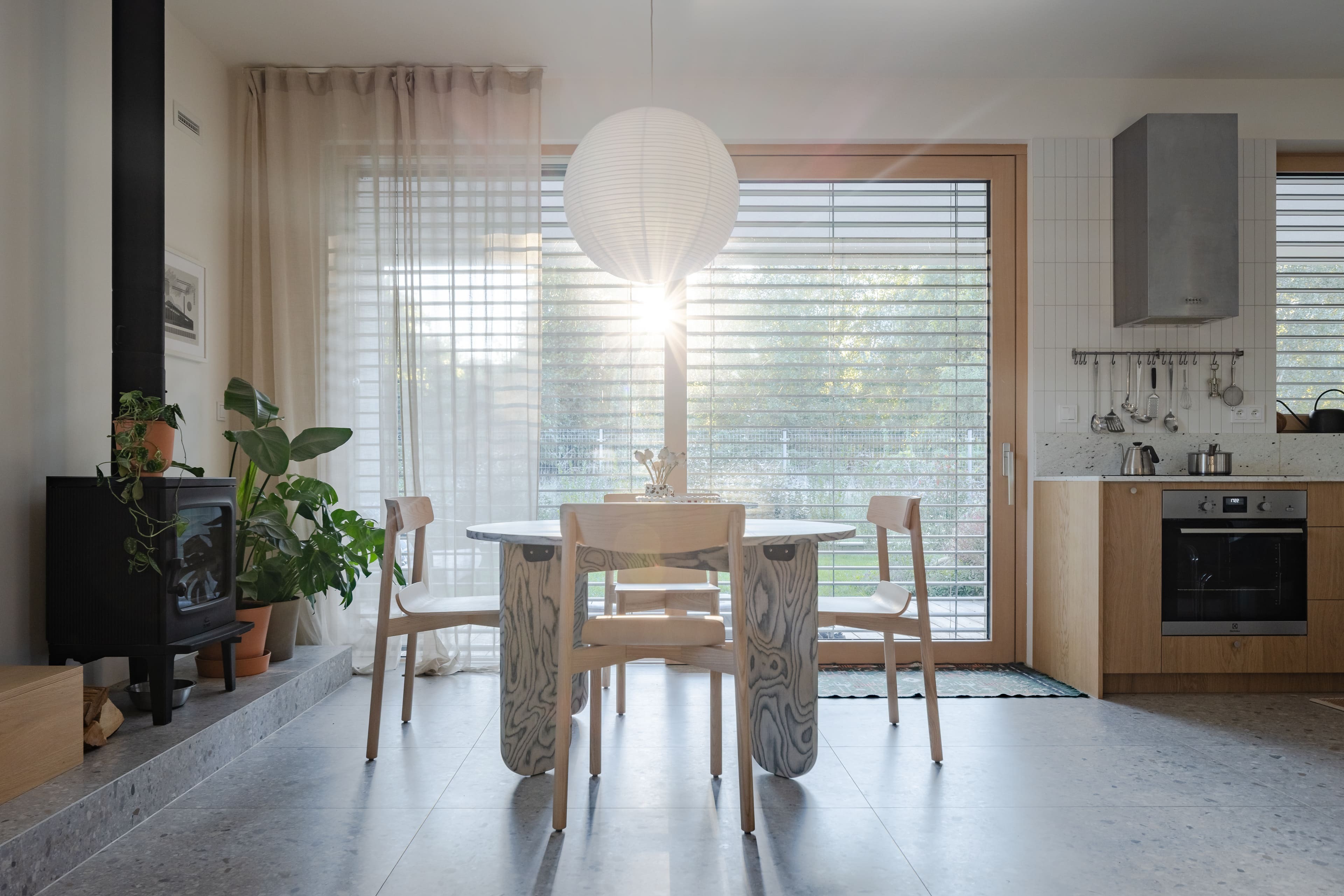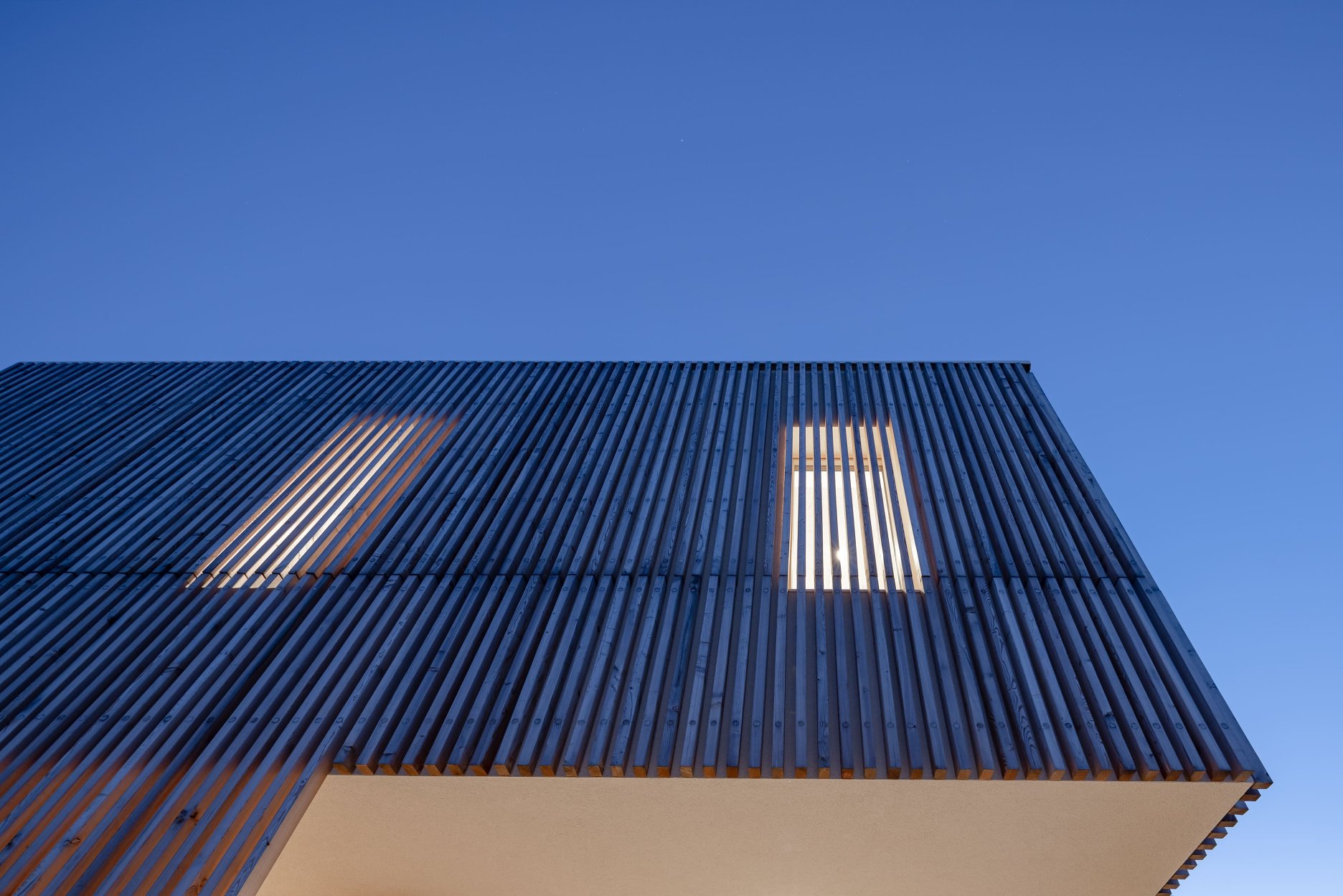 Medzi dôležité súčasti architektonického riešenia patrí práca s prirodzeným presvetlením interiéru. Pohyb slnka počas dňa vytvára meniace sa atmosféry – ranné mäkké presvetlenie kuchyne, popoludňajší lesk v obývacej časti, aj večerný západný tieň na stenách. Svetlo tu funguje ako rovnocenný tvorivý prvok, ktorý spája všetky vrstvy domu.