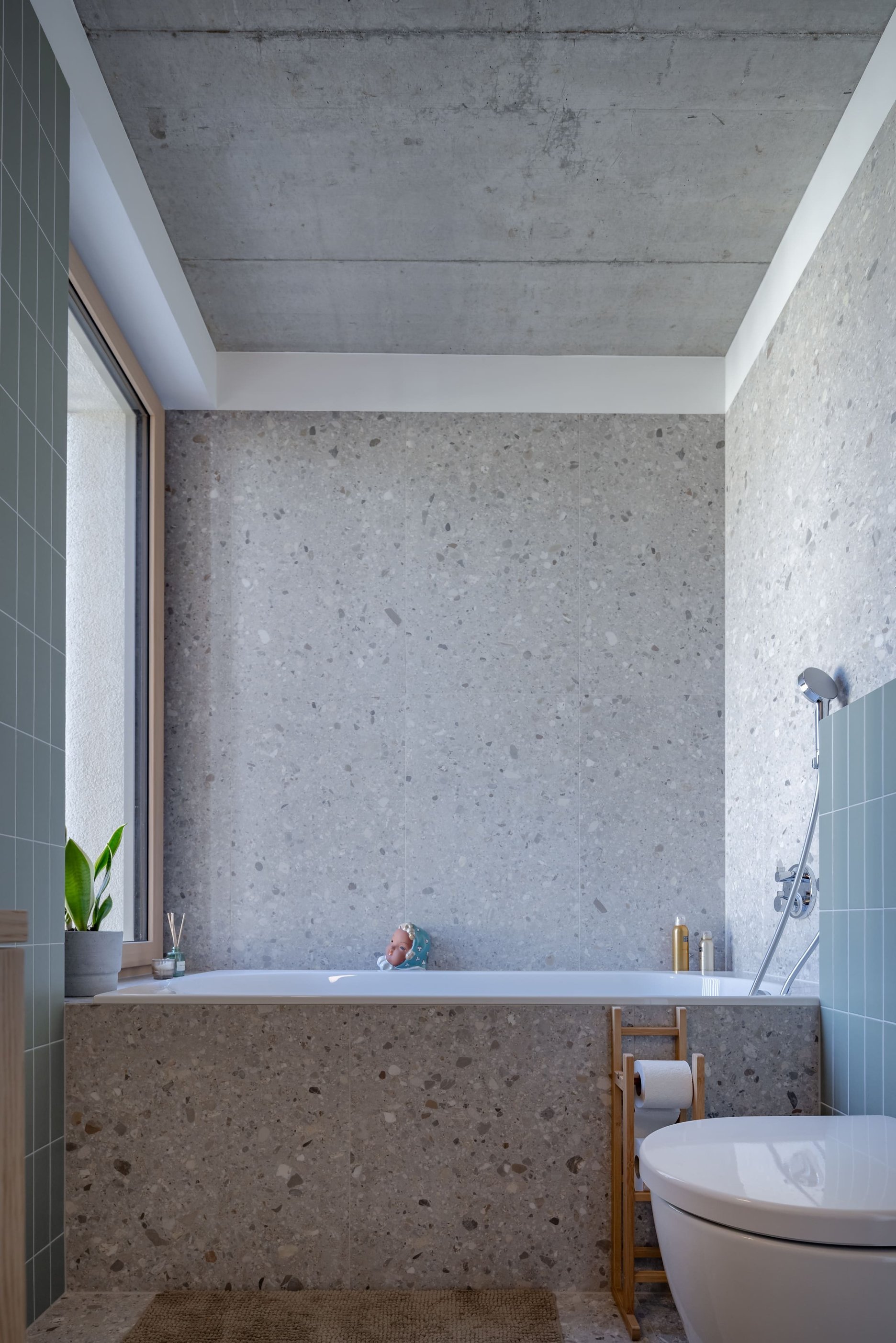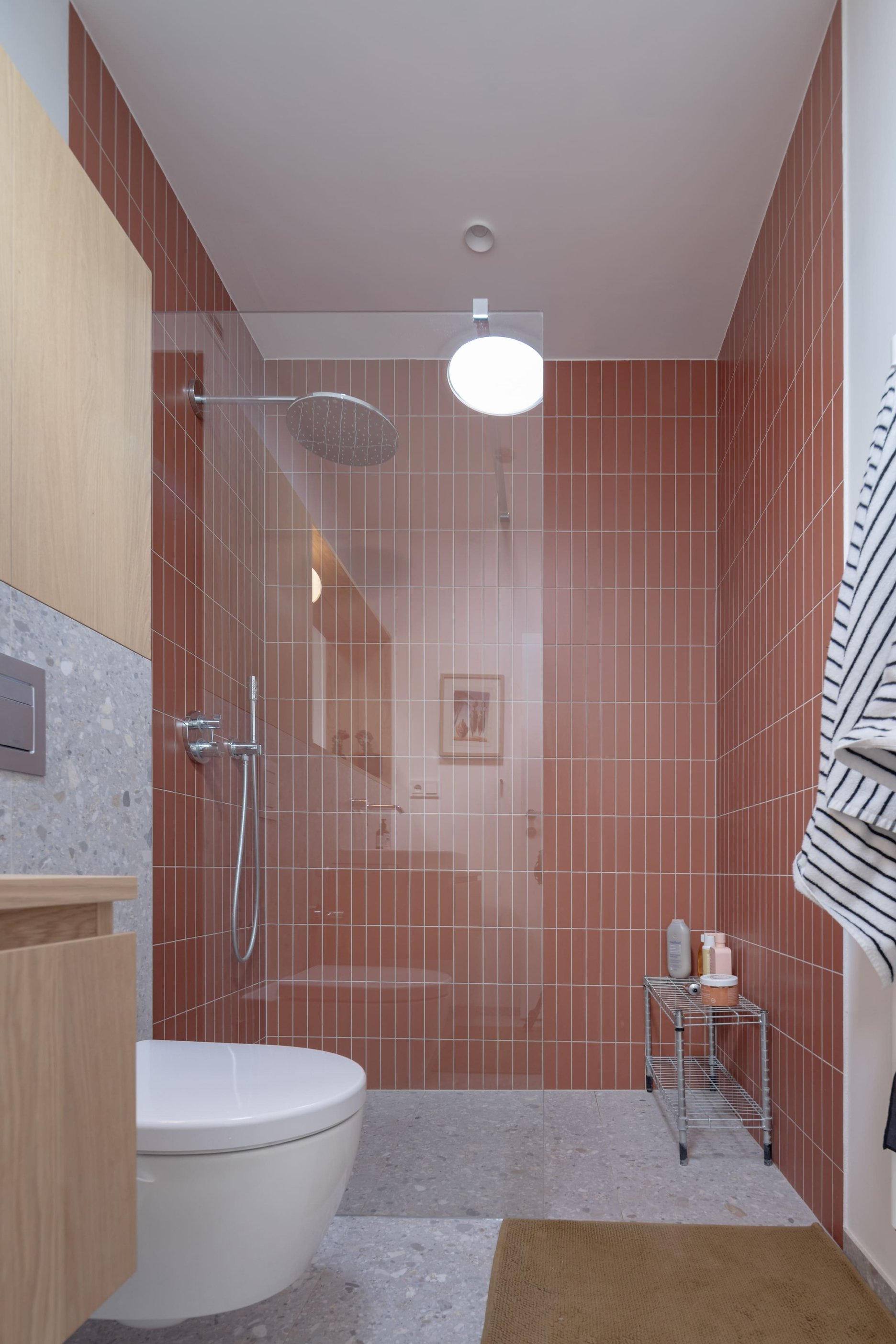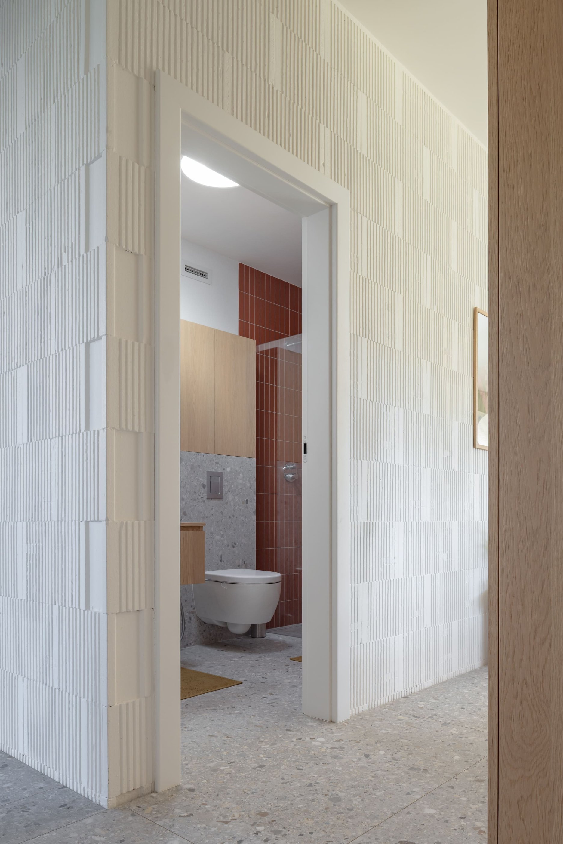 Na oboch podlažiach sa nachádzajú kúpeľne, každá v inej farebnej tonalite – terakotová s hrejivým, takmer južanským charakterom a kontrastnejšia mentolovo-zemitá zelená. Obe však spája rovnaká práca s textúrou, svetlom a remeselným detailom.