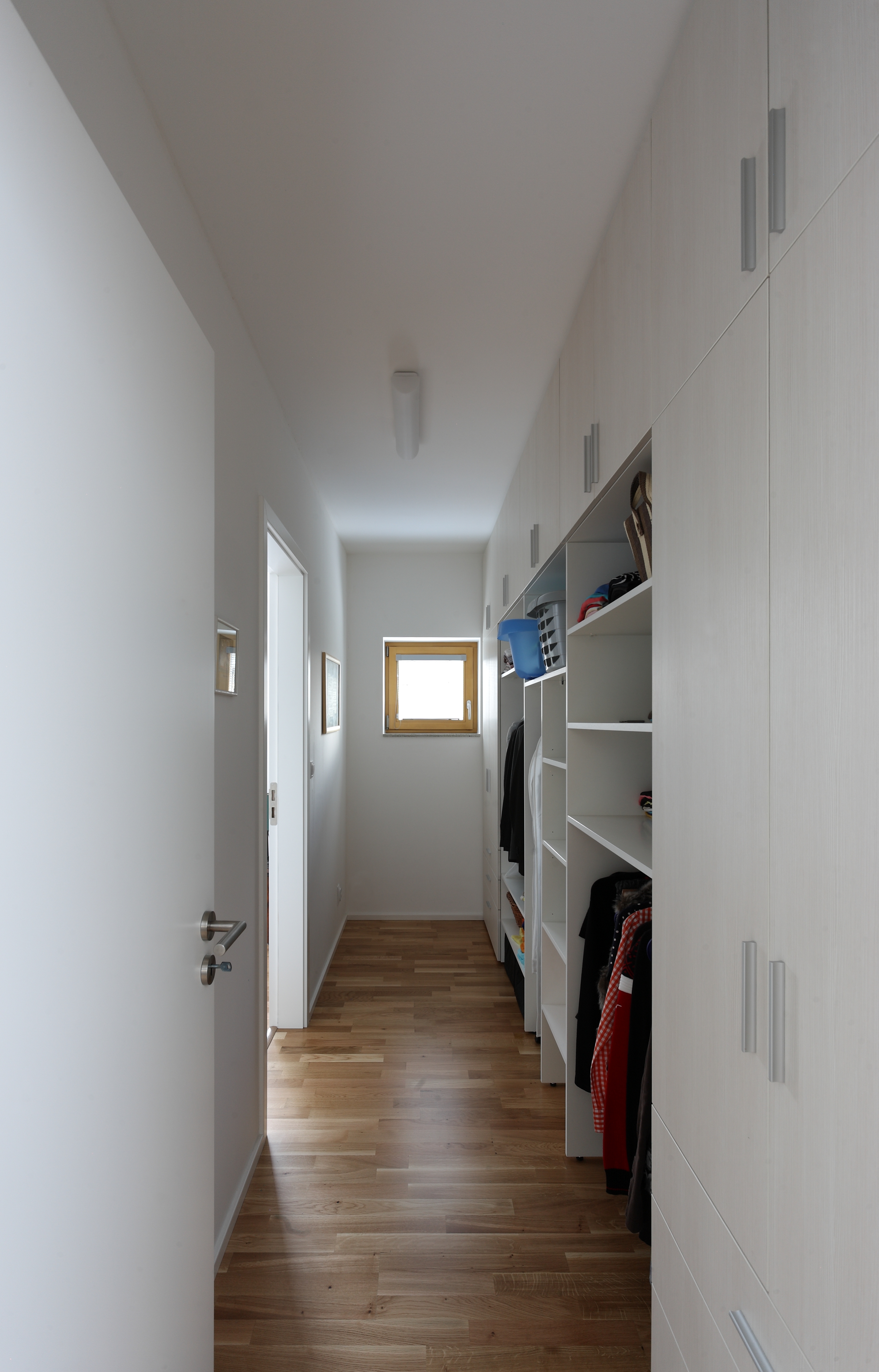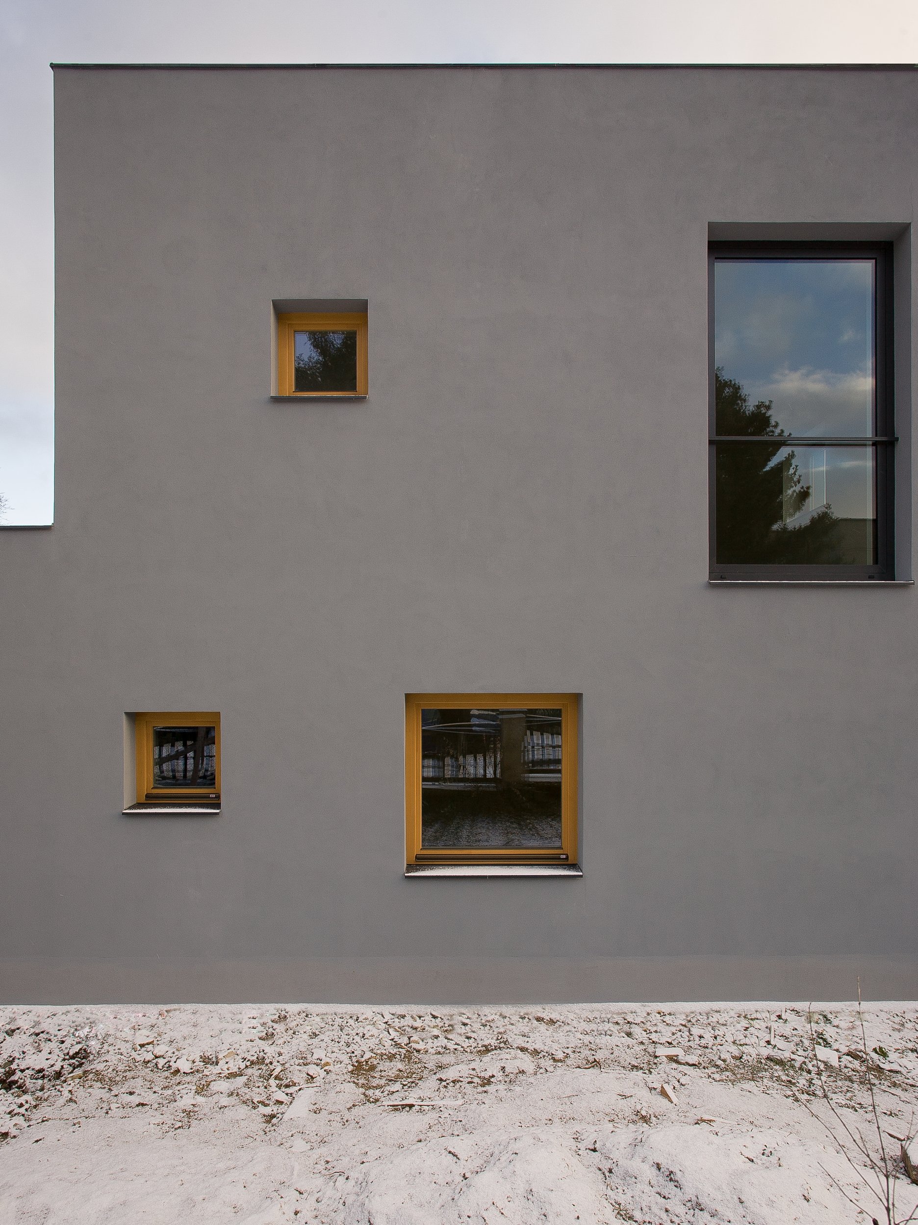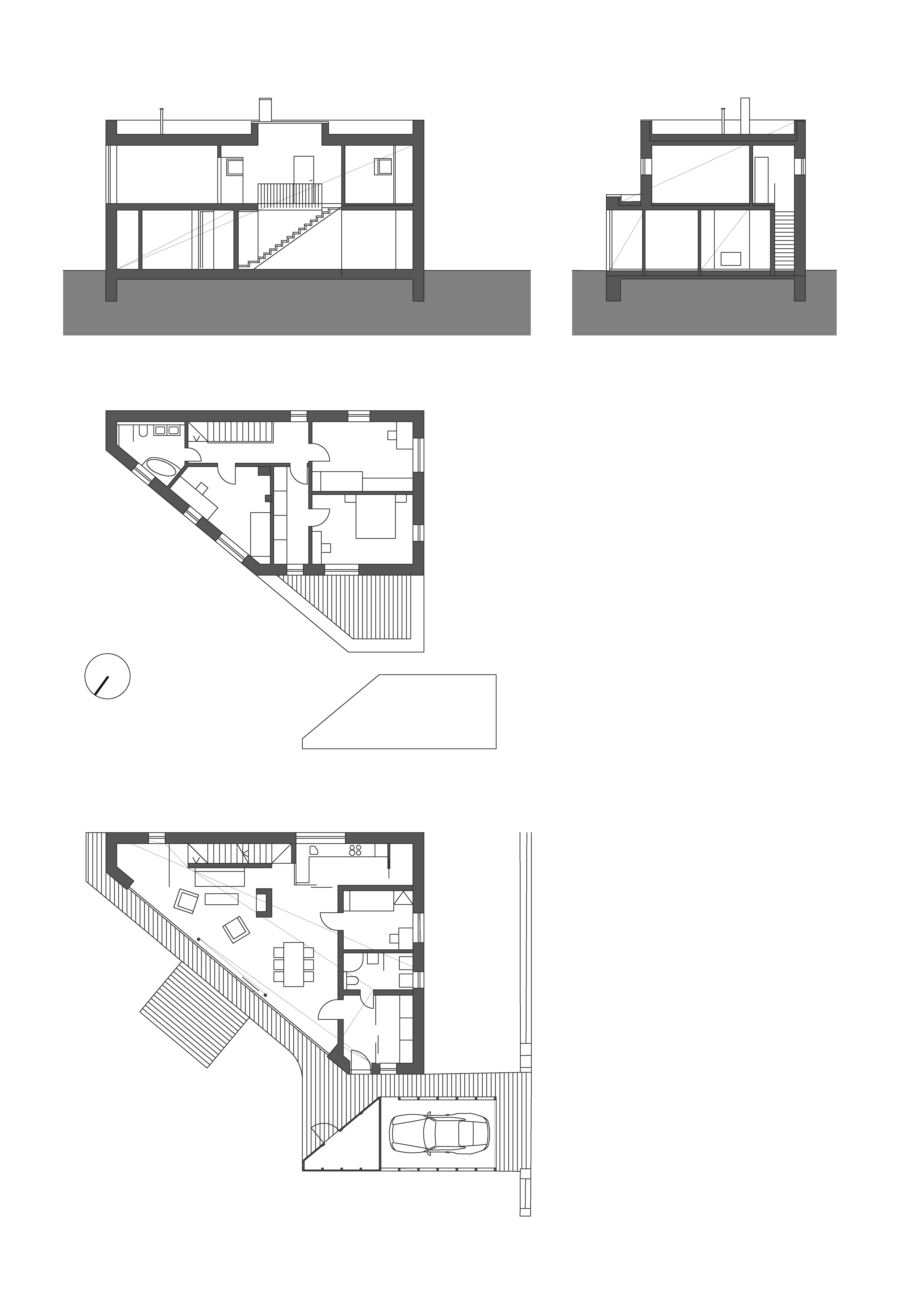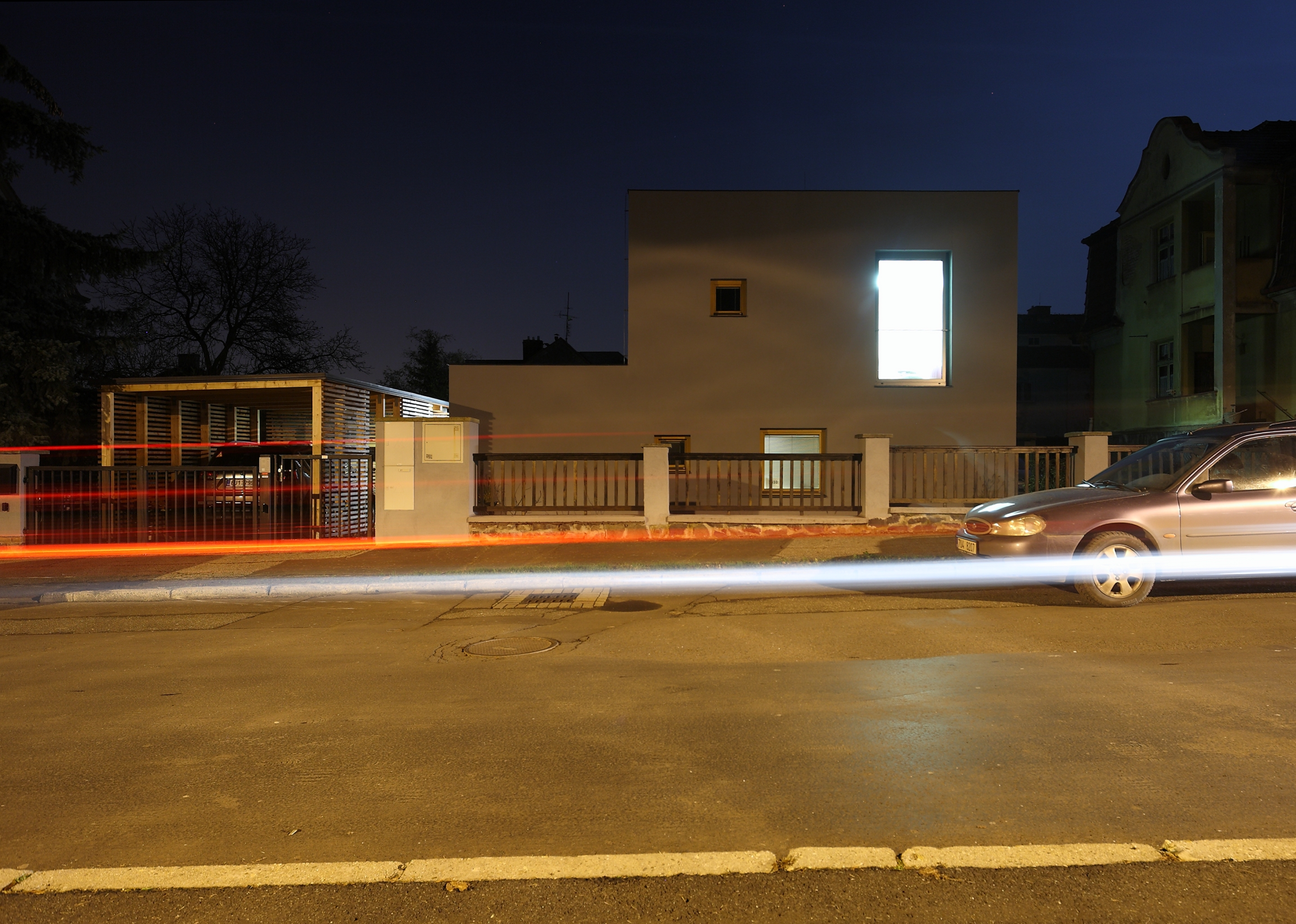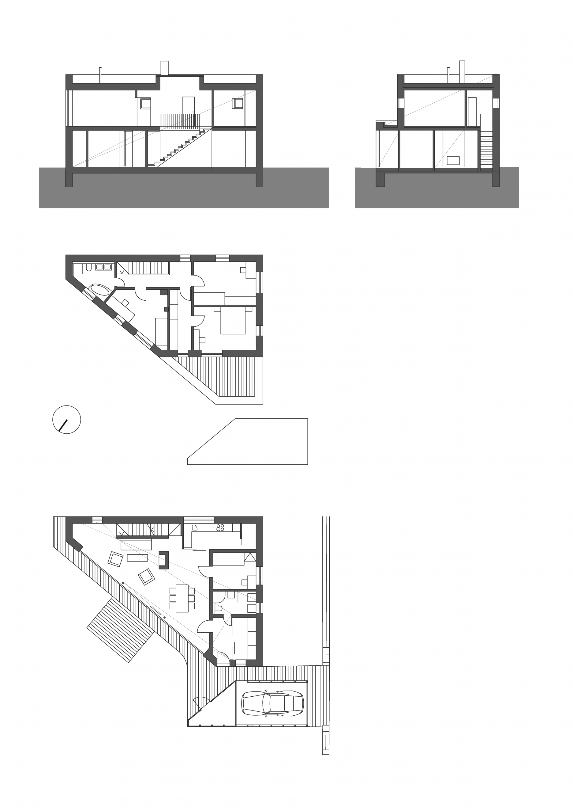 Geometrická forma domu drží uličnú čiaru. Pôdorysne sa však zo striktného pravouhlého rastra vyníma skosenou severnou fasádou. Najdlhšia fasáda domu je orientovaná do súkromného priestoru zvažujúcej sa záhrady. Presklená stena na úrovni prízemia prepája hlavný obytný priestor s exteriérovou terasou. V centre otvorenej obývačky s oddeľiteľným priestorom kuchyne je situované krbové teleso. V dennej časti domu je ďaľej hosťovská izba a hygienické zázemie naväzujúce na vstupný priestor so šatníkom. Na poschodí sú tri izby so spoločnou hygienou v rohu dispozície.