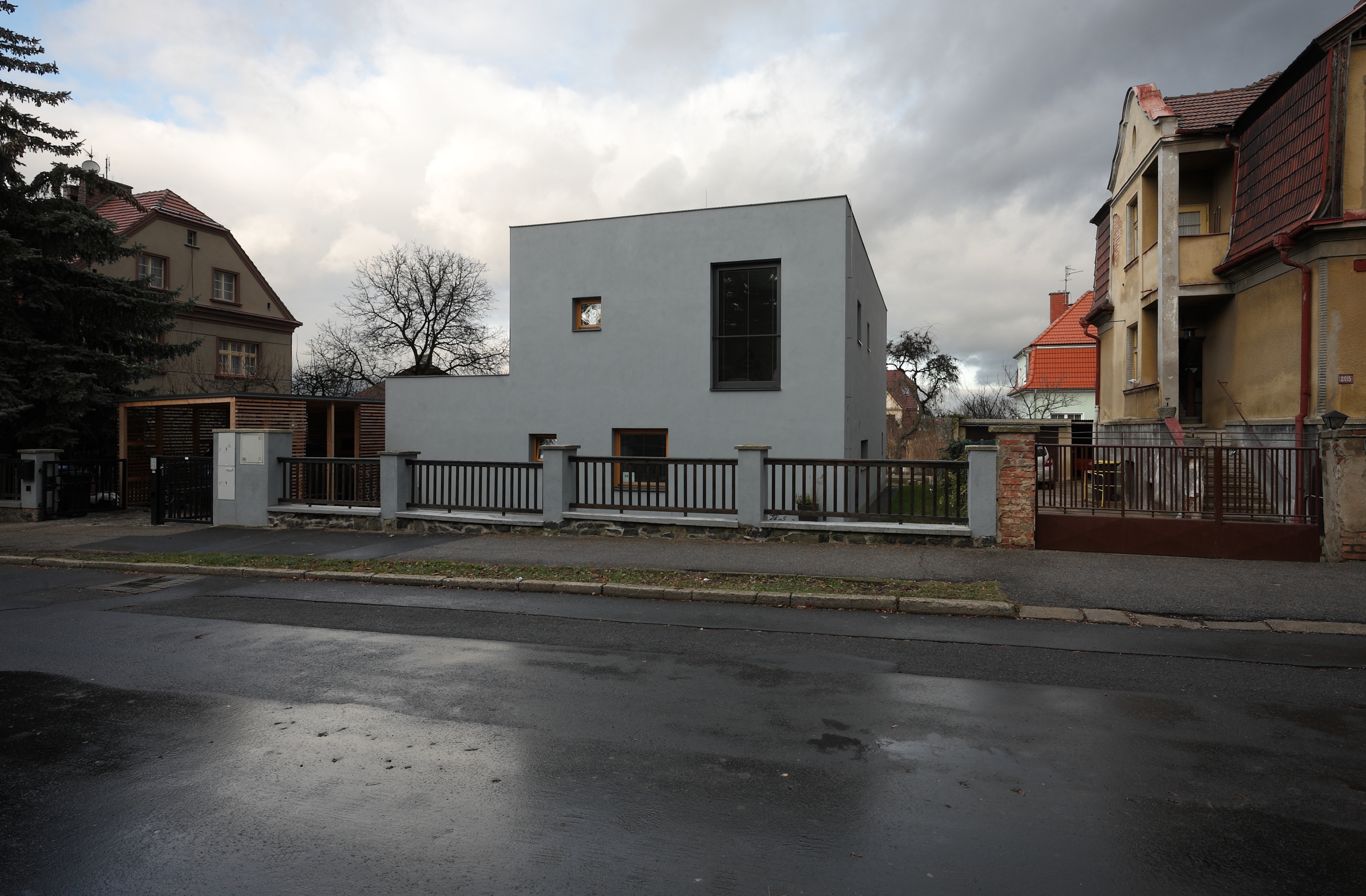 Rodinný dom stojí na pozemku v prieluke, ktorá je súčasťou vilovej štvrte v kúpeľnom meste Teplice na severozápade Čiech. "Drobná stavebníkova parcela tak trochu zbyla v pravoúhlém rastru místní zástavby," objasňujú architekti z ateliéru 3+1. Bezprostredná blízkosť objemovo veľkorysých víl a domov z prvej polovice 20. storočia psychologicky aj fyzicky pevne vymedzuje "manévrovací priestor" návrhu. "Tělo domu je prostorovou artikulací limitů, předpokladů a přání," dodávajú.