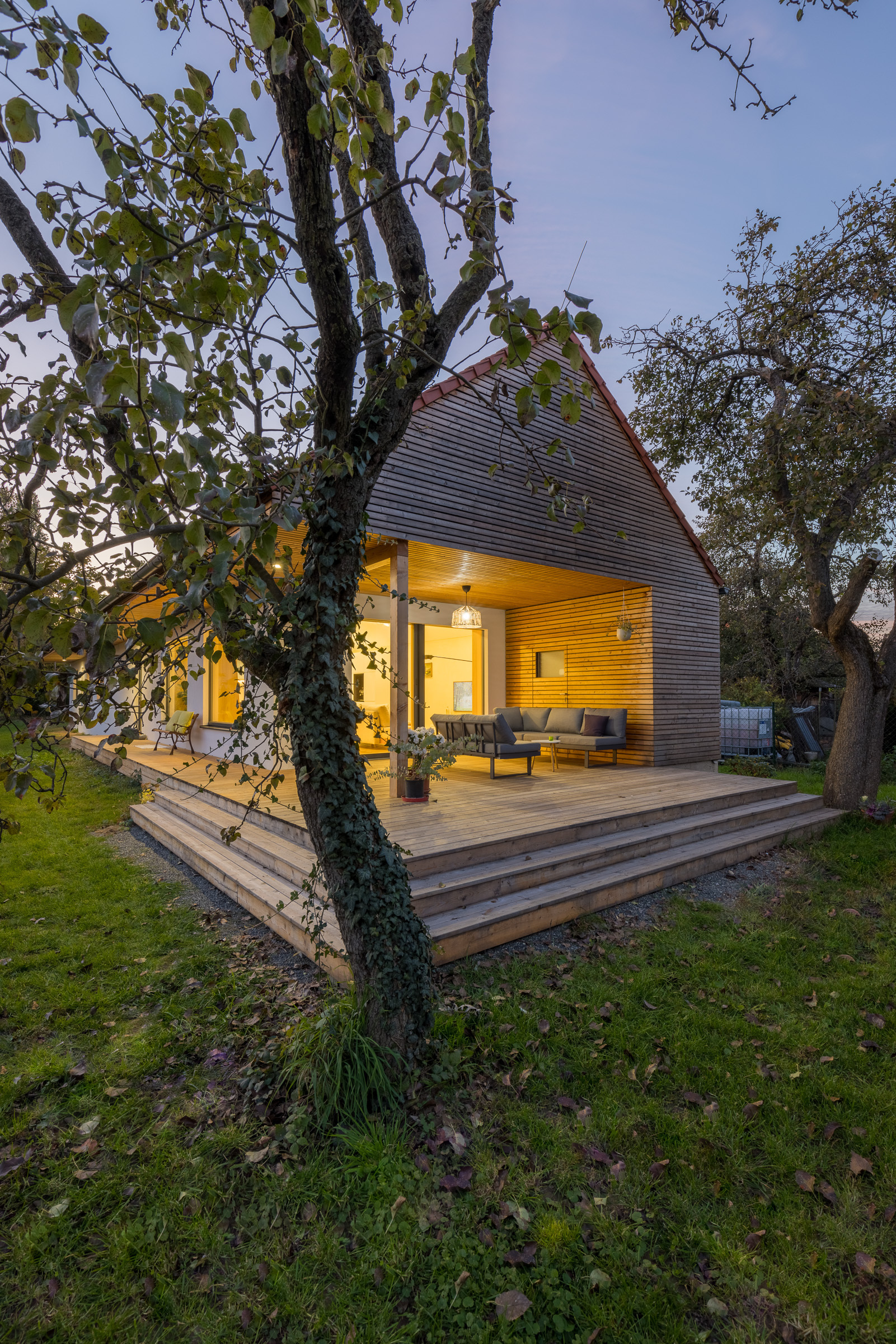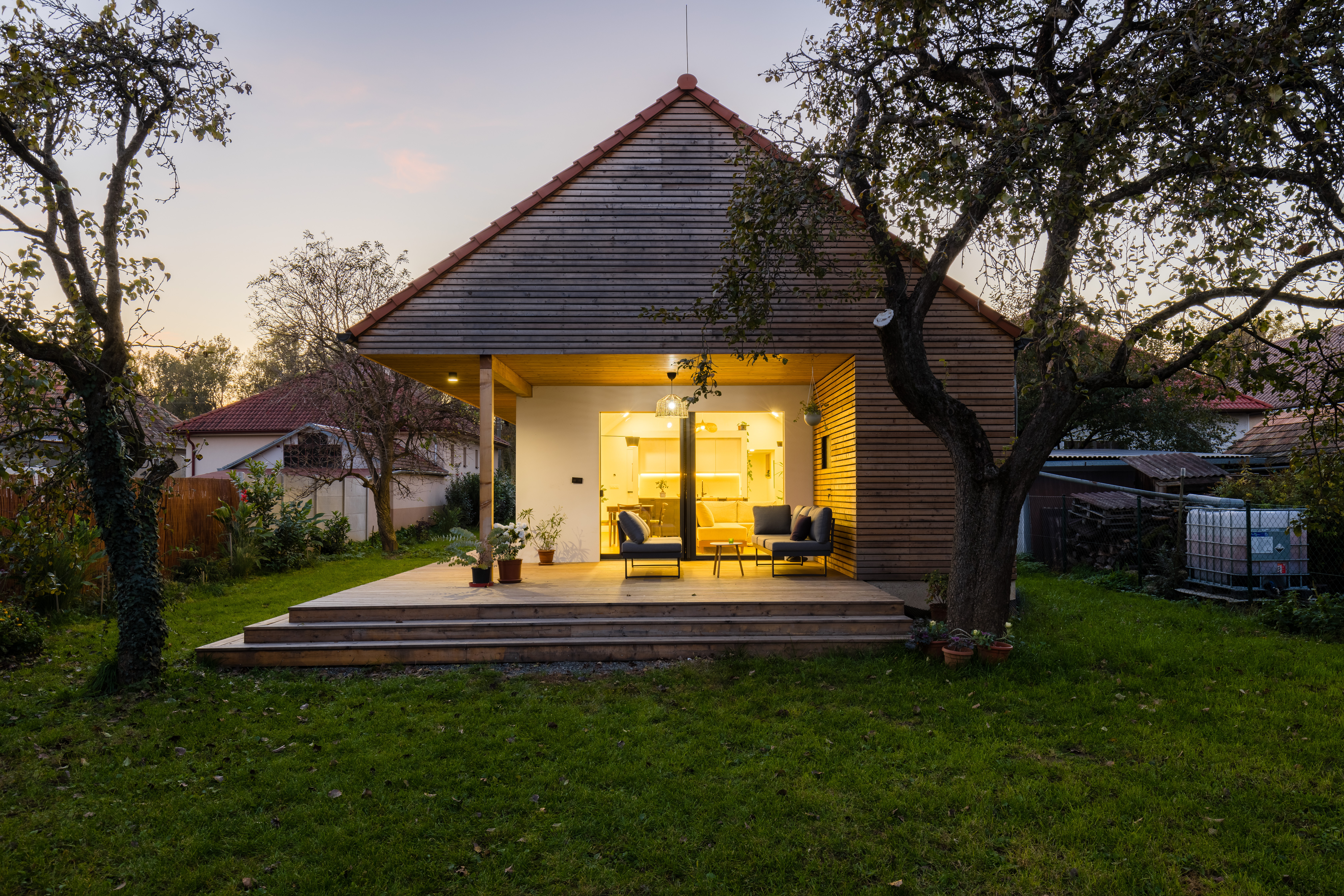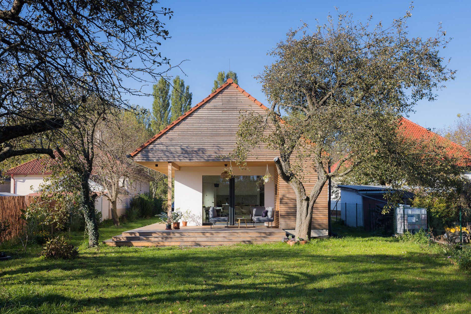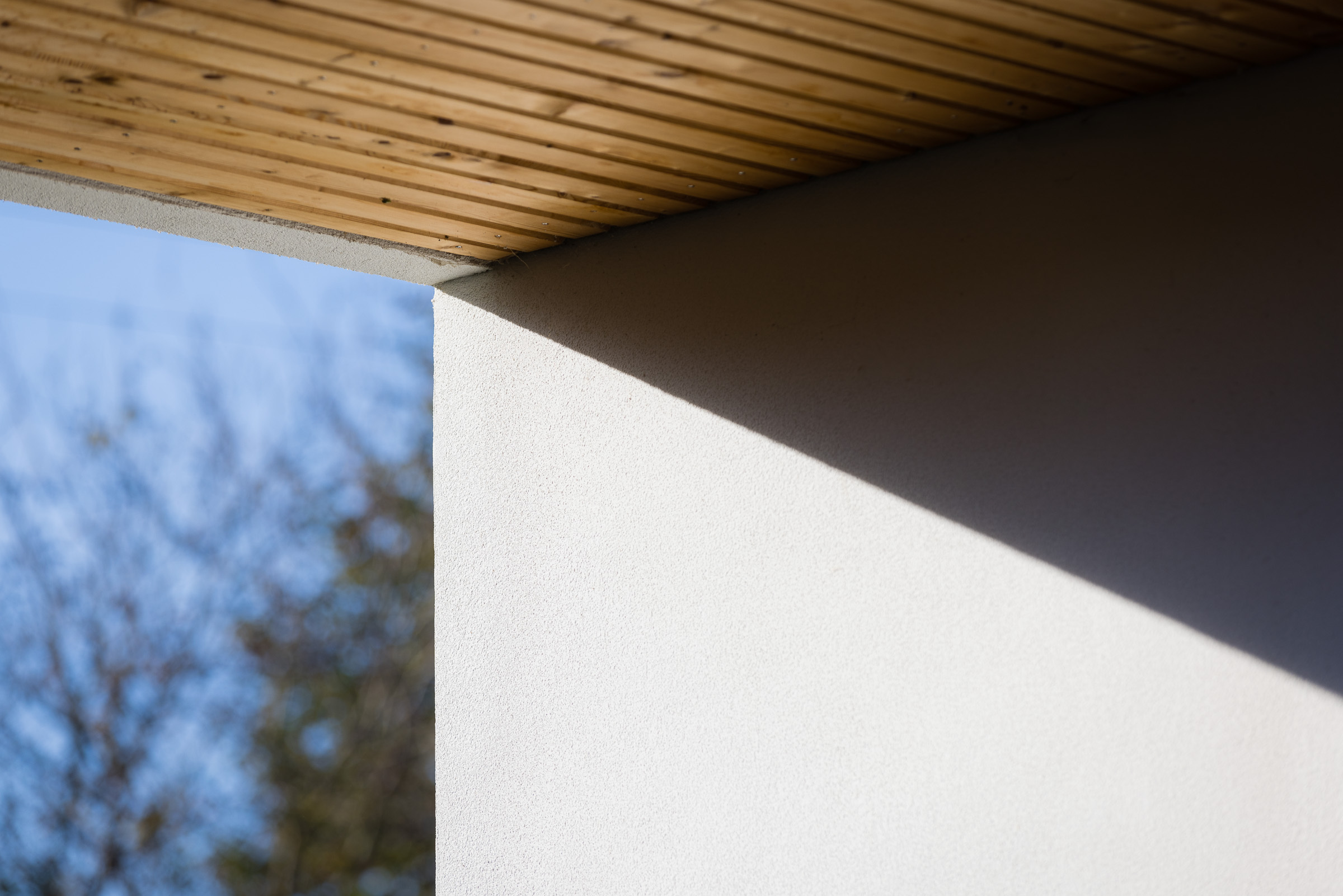 Fasáda domu je omietaná, čo podporuje jeho striedmy, archetypálny výraz. Doplnkový objekt skladu záhradného nábytku na terase je naopak obložený drevom, čím vzniká jemný materiálový kontrast a zároveň prirodzené prepojenie s exteriérom.