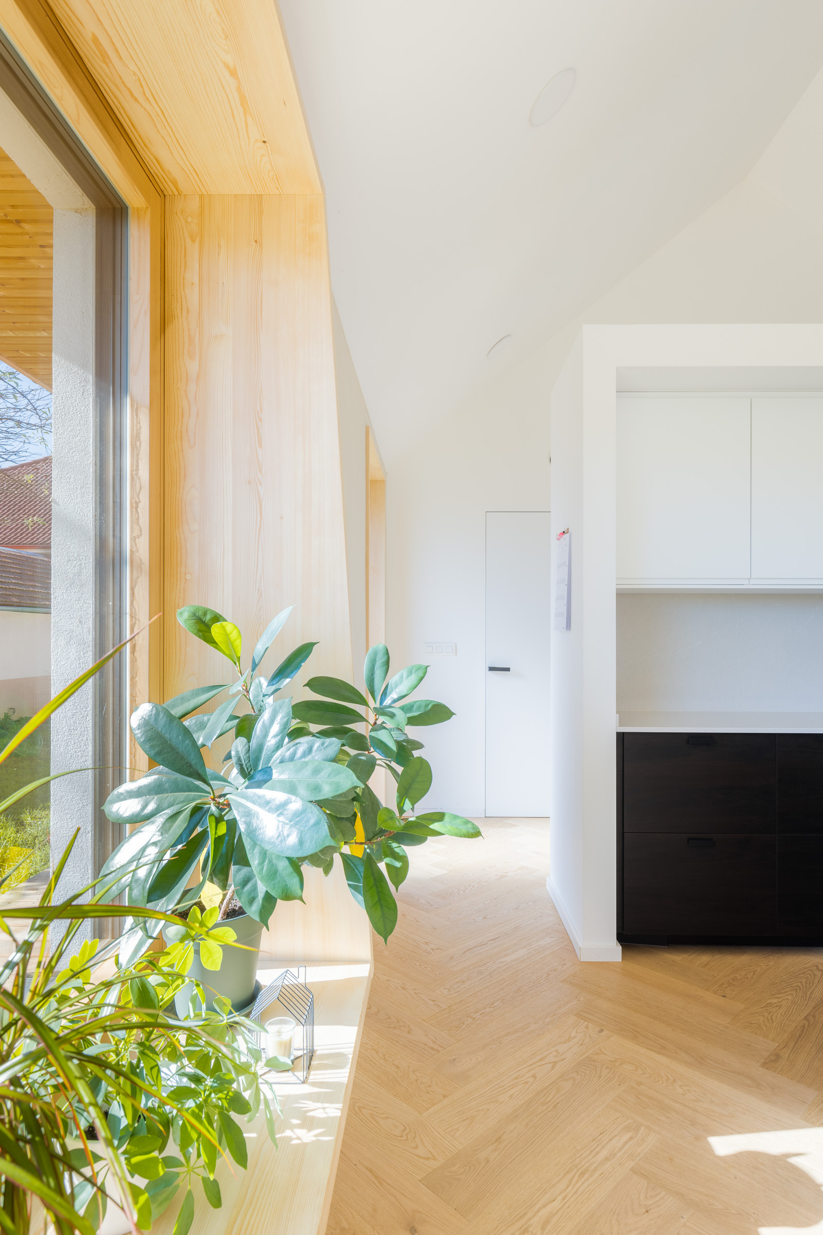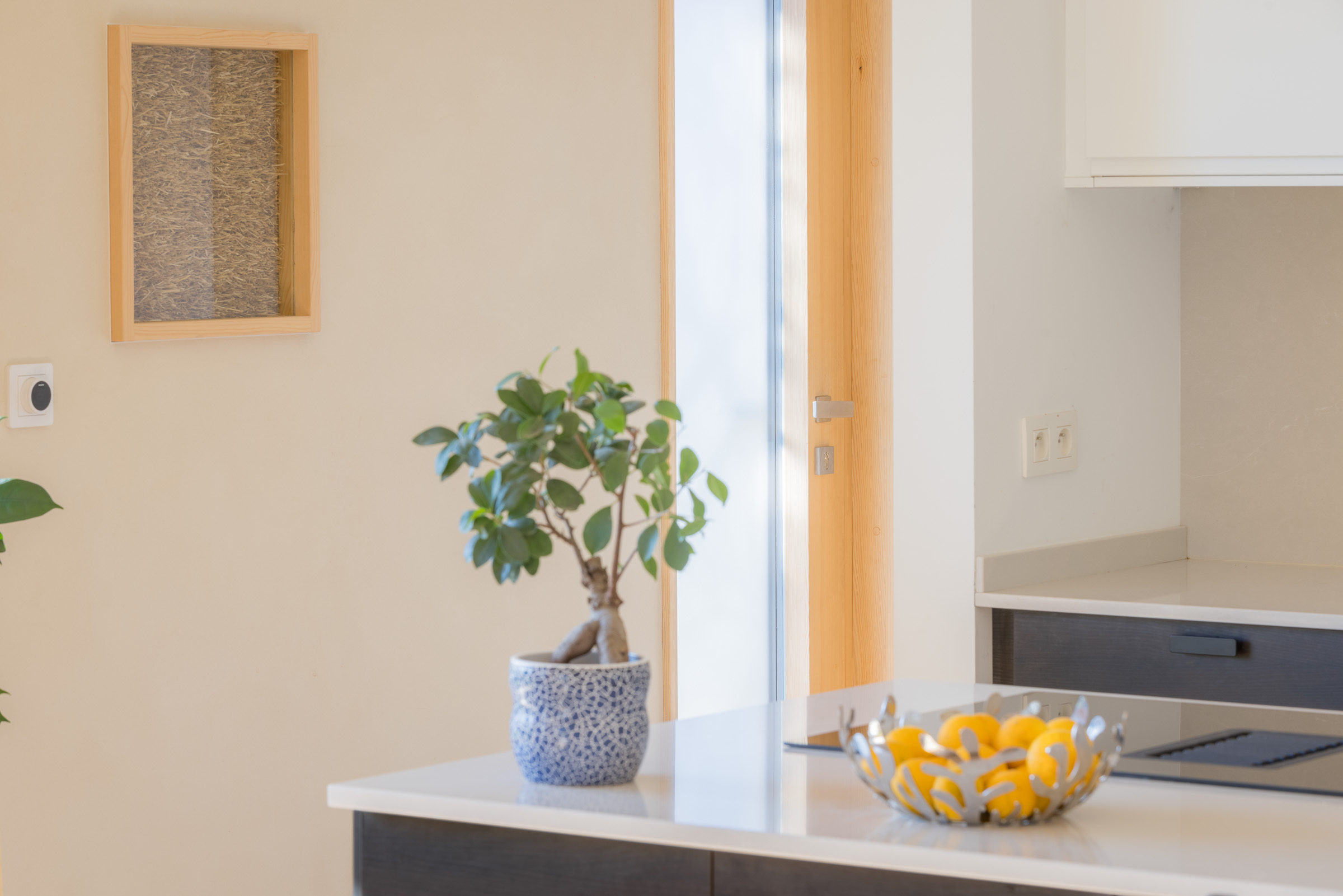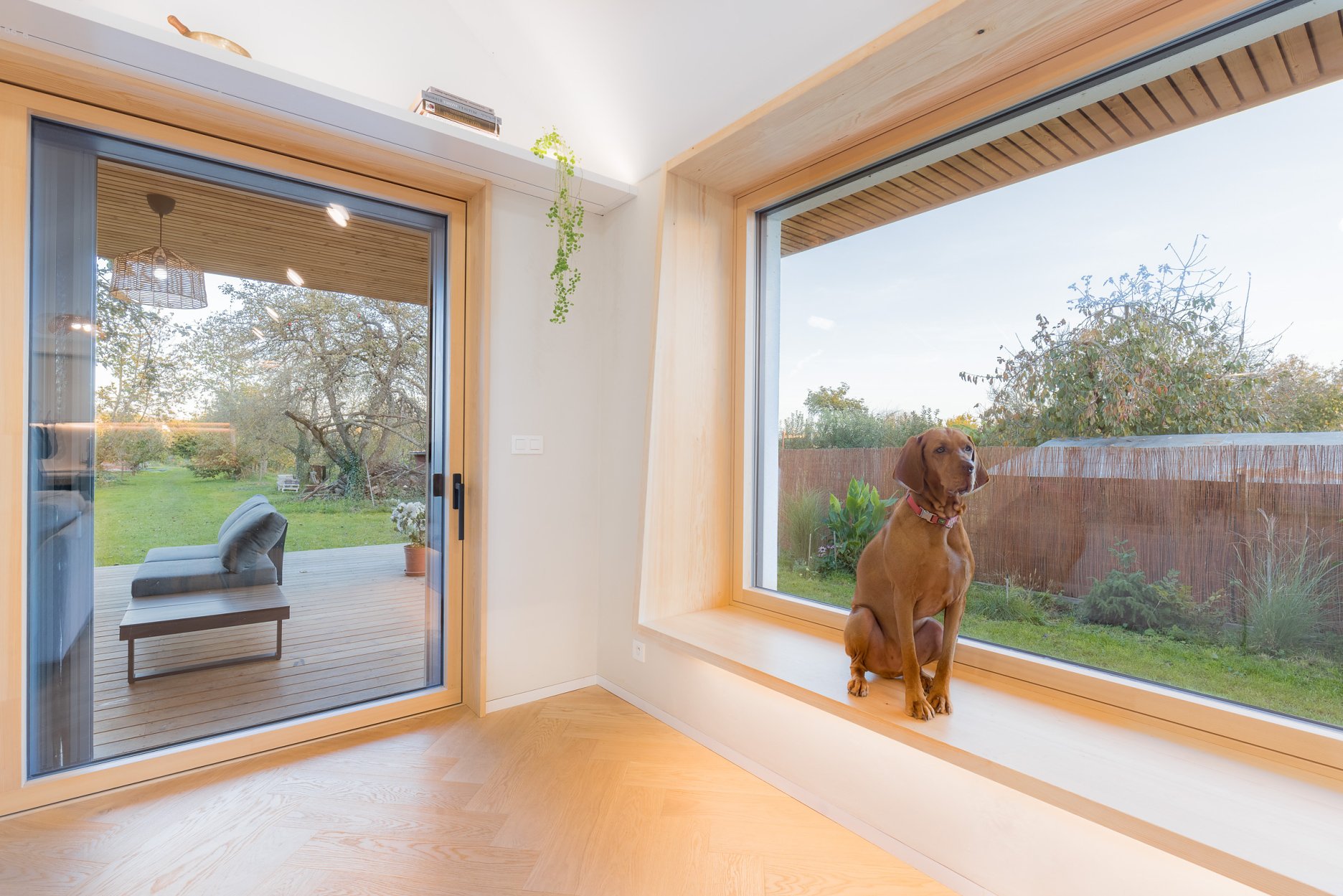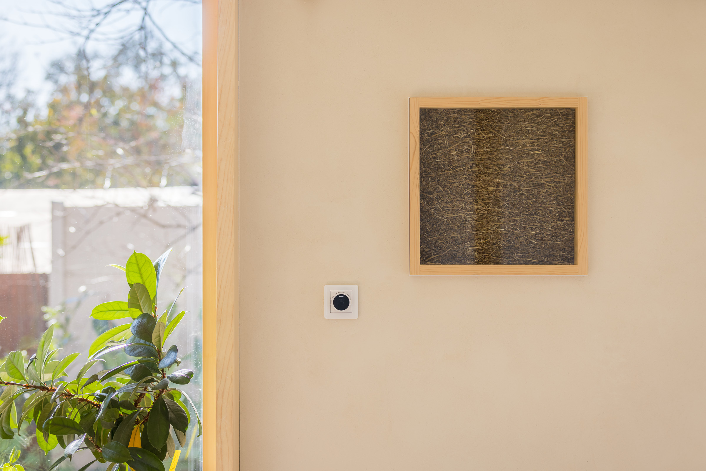 Nosnú konštrukciu tvoria drevo-slamené panely EcoCocon, ktoré sú zároveň tepelnoizolačné, čím spájajú konštrukčnú funkciu s vysokou energetickou účinnosťou obálky. V interiéri sú steny opatrené hlinenou omietkou jemnej vanilkovej farby, ktorá prispieva k zdravej mikroklíme a prirodzenej regulácii vlhkosti. Stavbu dopĺňajú kvalitné drevohliníkové okná.