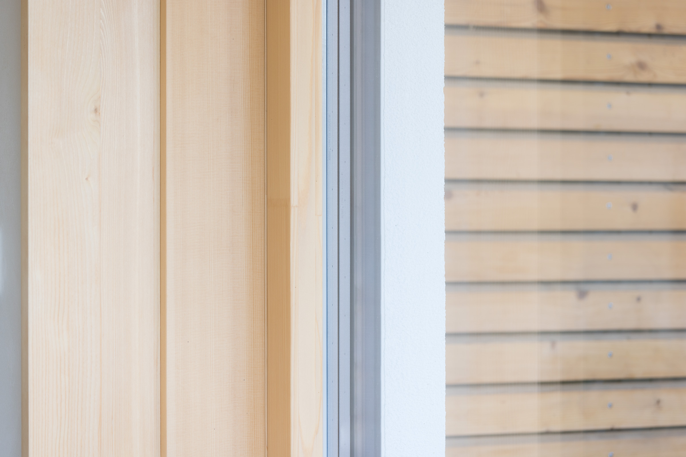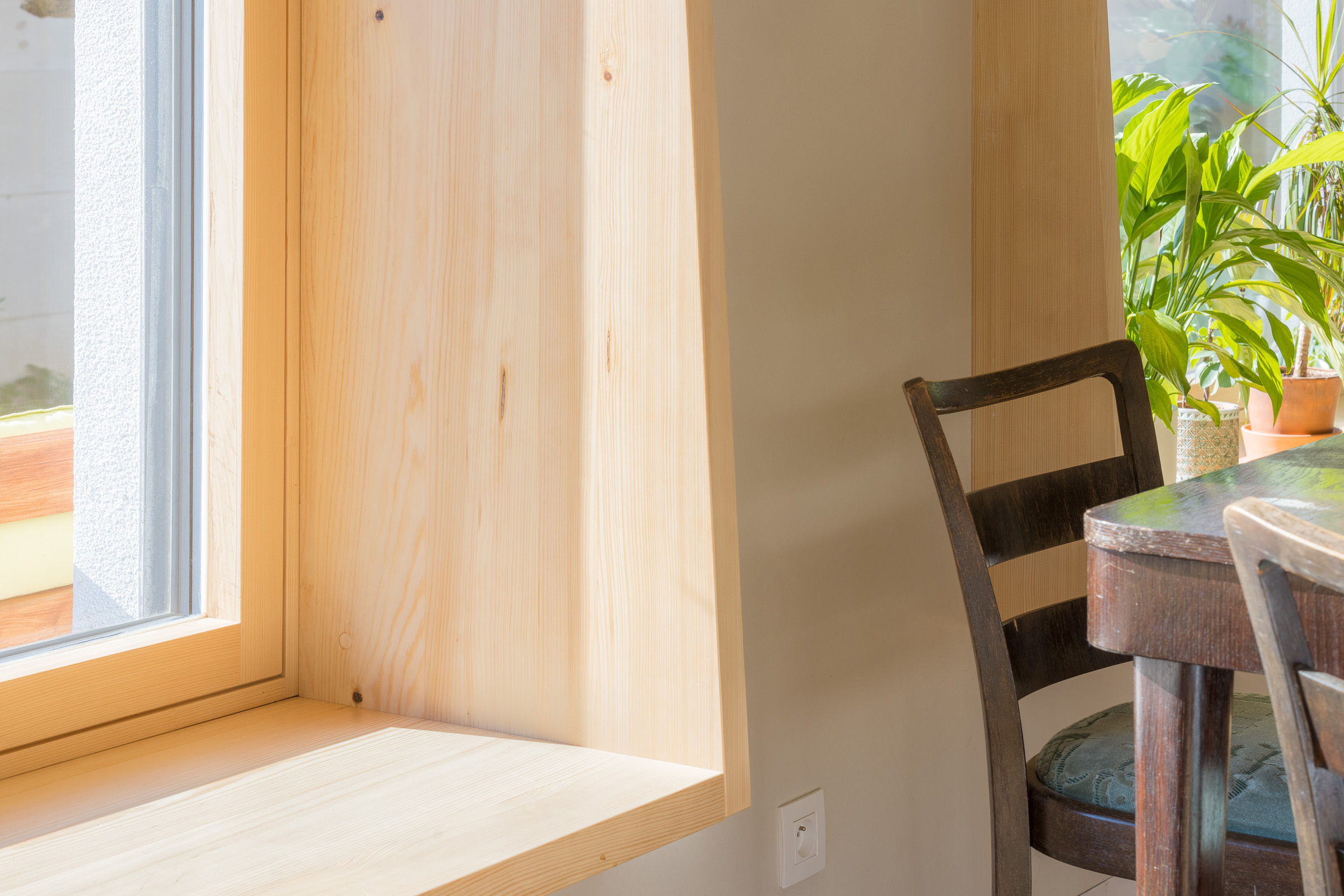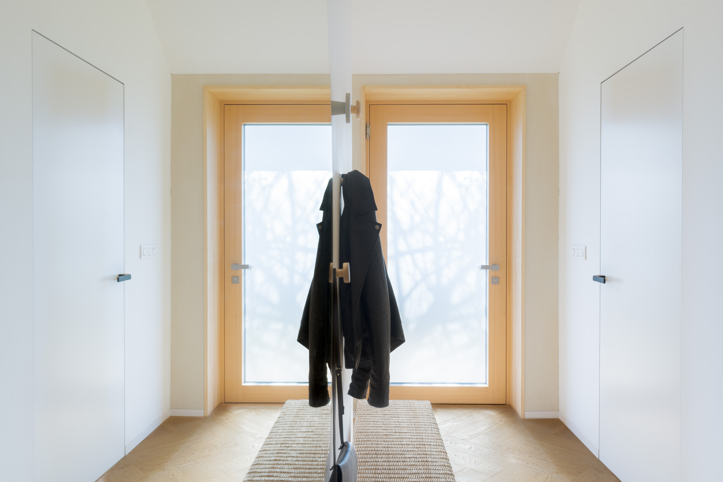 Nosnú konštrukciu tvoria drevo-slamené panely EcoCocon, ktoré sú zároveň tepelnoizolačné, čím spájajú konštrukčnú funkciu s vysokou energetickou účinnosťou obálky. V interiéri sú steny opatrené hlinenou omietkou jemnej vanilkovej farby, ktorá prispieva k zdravej mikroklíme a prirodzenej regulácii vlhkosti. Stavbu dopĺňajú kvalitné drevohliníkové okná.