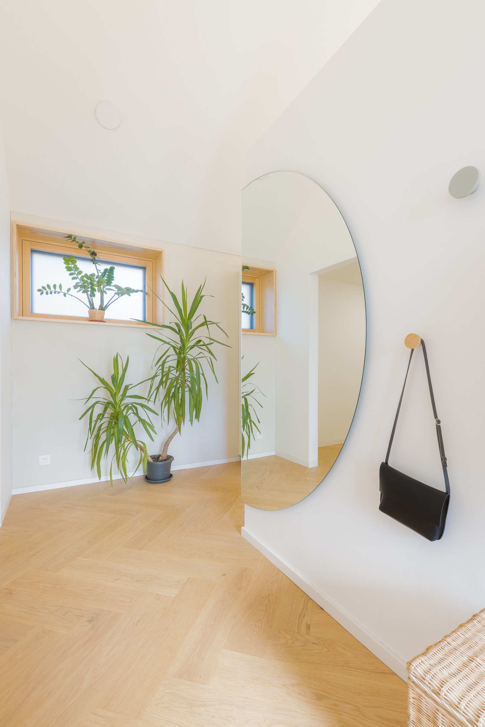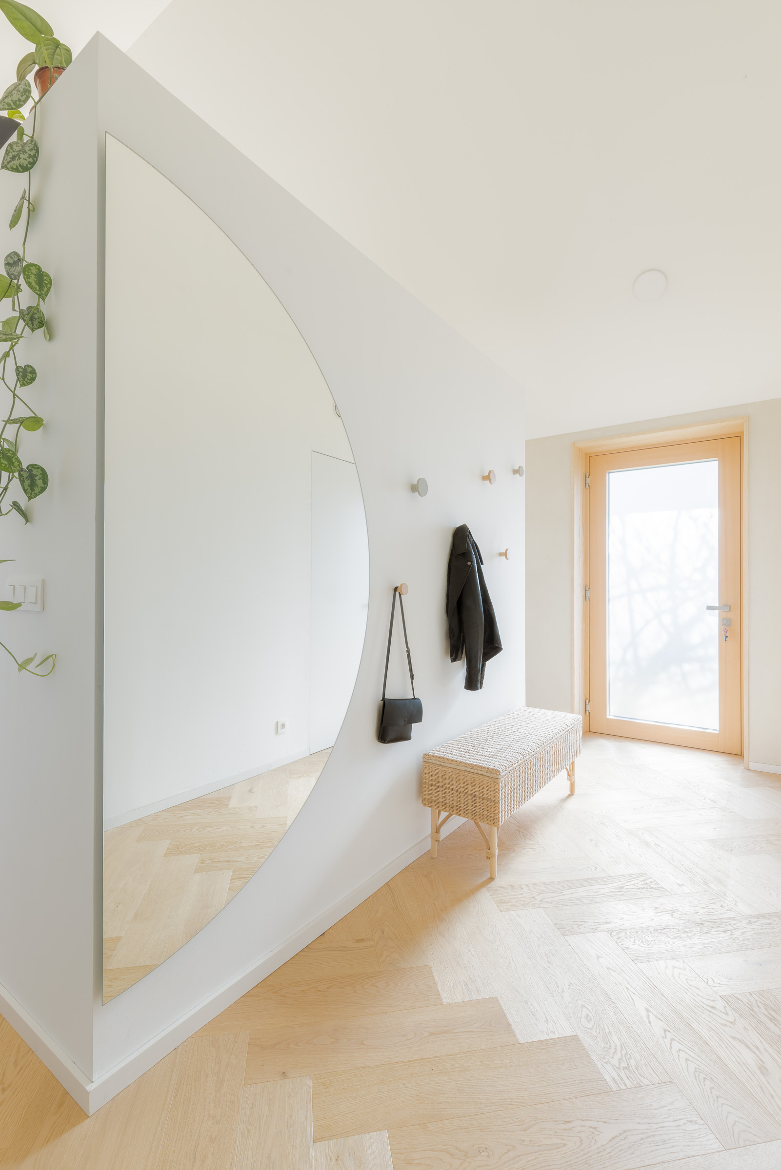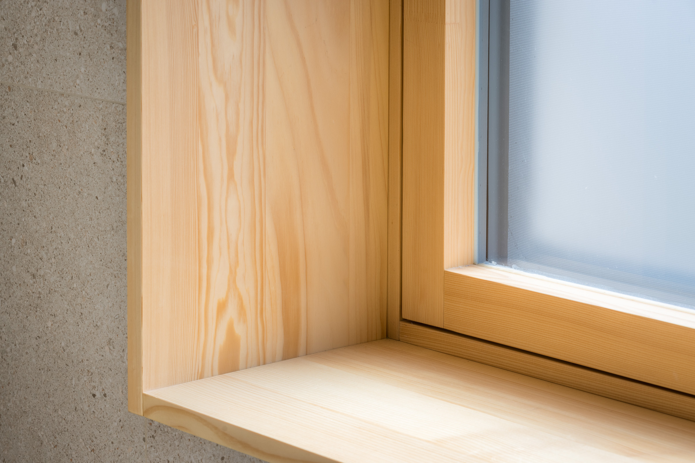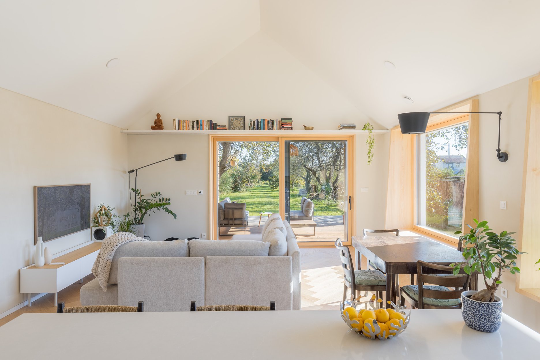 Nosnú konštrukciu tvoria drevo-slamené panely EcoCocon, ktoré sú zároveň tepelnoizolačné, čím spájajú konštrukčnú funkciu s vysokou energetickou účinnosťou obálky. V interiéri sú steny opatrené hlinenou omietkou jemnej vanilkovej farby, ktorá prispieva k zdravej mikroklíme a prirodzenej regulácii vlhkosti. Stavbu dopĺňajú kvalitné drevohliníkové okná.