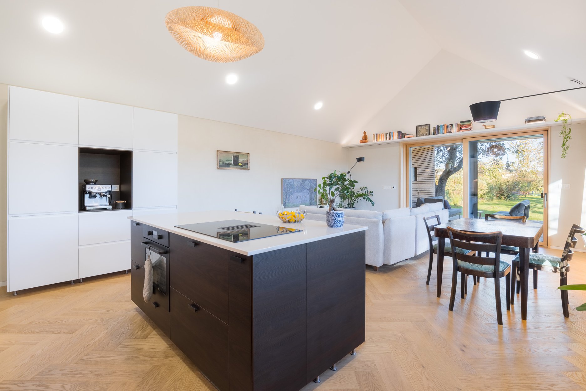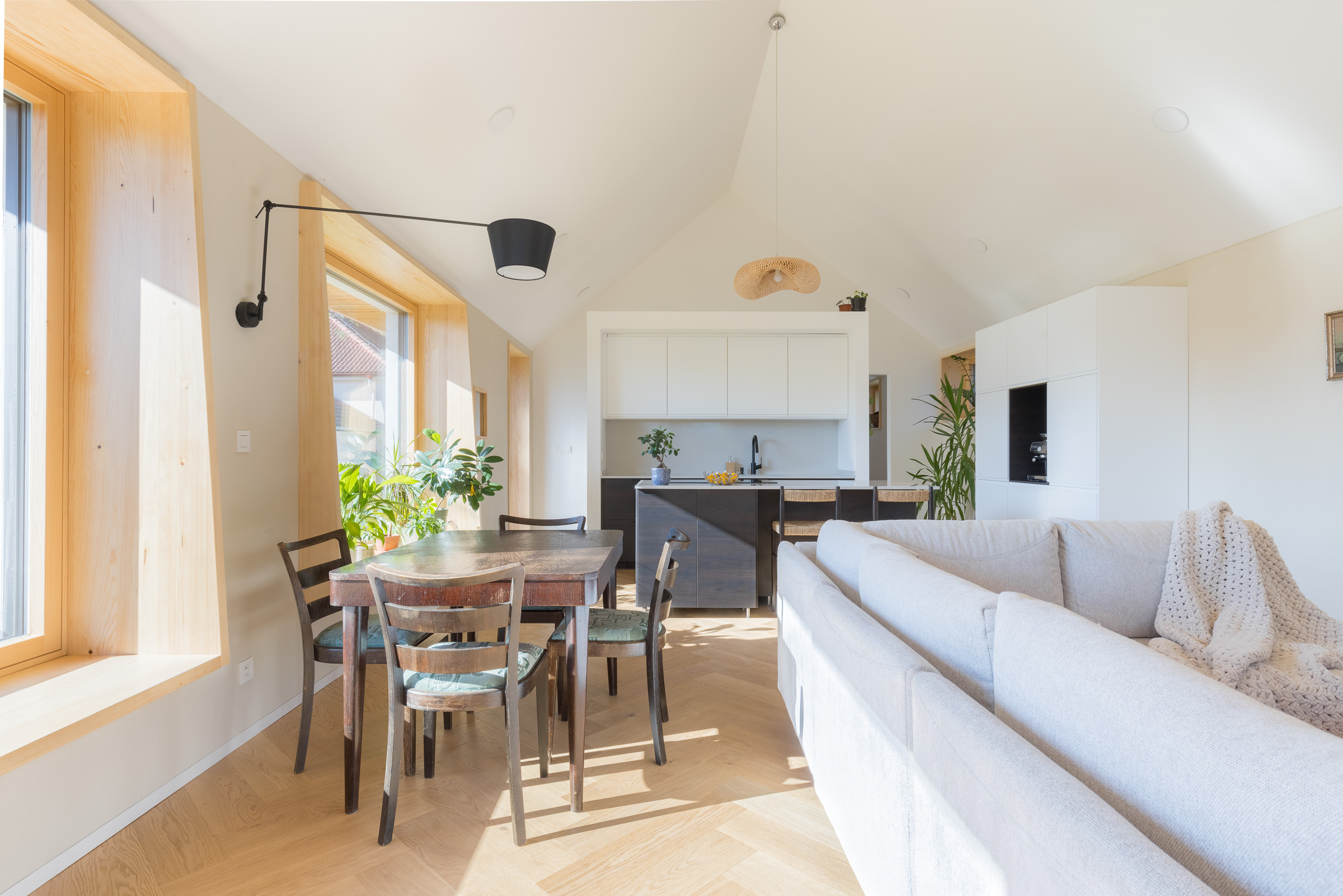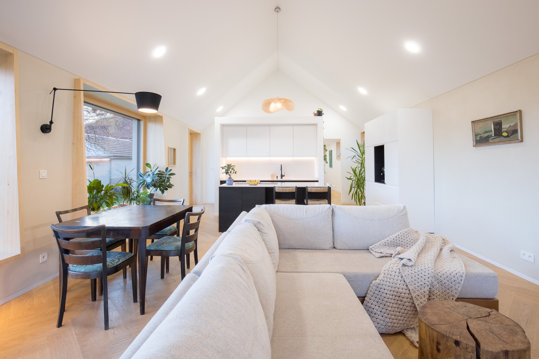 Kuchyňa je prepojená s obývacou izbou, čím vzniká kompaktný denný priestor orientovaný na juh aj na východ veľkým presklením, ktoré napája obývačku na krytú exteriérovú terasu. Väčšina presklení je chránená pred letným prehrievaním vďaka presahu strechy, ktorý zároveň umožňuje využívanie solárnych ziskov v zimnom období.