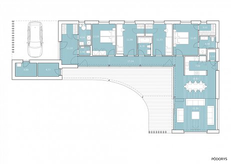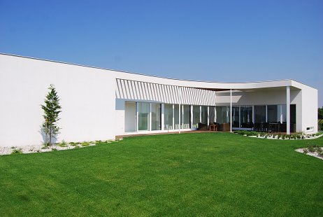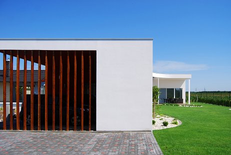 Stavba rodinného domu je riešená ako jednopodlažný nepodpivničený objekt. Do objektu sa vstupuje na jeho južnej strane, popod strechu parkovacieho státia. Vo vstupnej hale sa nachádza samostatný šatník, vchádza sa z nej do práčovne s technickou miestnosťou a samostatného WC. Z chodby, ktorou sa dostaneme až do vzdialenej dennej časti domu, sa vstupuje do všetkých spální domu aj so sociálnym zázemím. Sú to v poradí od vstupu hosťovská izba, detská izba, kúpeľňa, druhá detská izba a spálňa rodičov s vlastným šatníkom a malou kúpeľňou. Hoci je spomínaná denná časť na opačnom konci od vstupu do domu, výhodou tejto koncepčnej schémy je jej južná orientácia dennej časti a vizuálny kontakt so zeleňou na vlastnom pozemku a výhľad na polia na východnej strane parcely. Denná časť je rozdelená na kuchynský kút s komorou, jedáleň a obývaciu izbu. Všetky tieto funkcie sú v jednom priestore bez deliacich priečok, opticky je interiér rozdelený len znížením úrovne podlahy v obývacej časti. Pri spevnenej ploche určenej na parkovanie sa nachádzajú dve miestnosti, z ktorých jednou je záhradný sklad a druhá slúži ako dielňa.