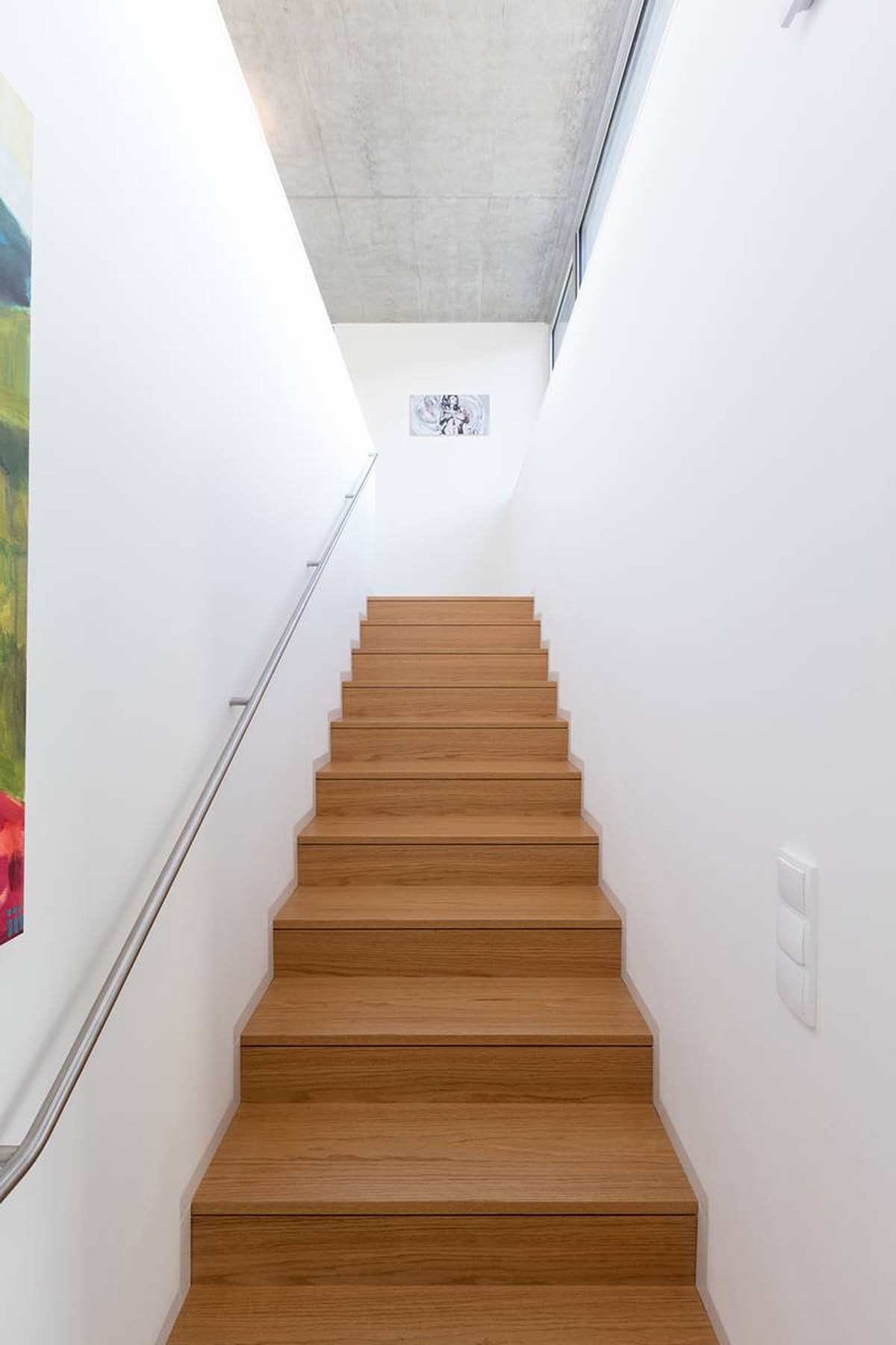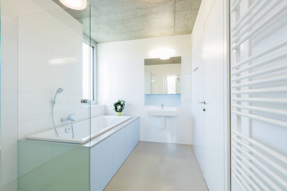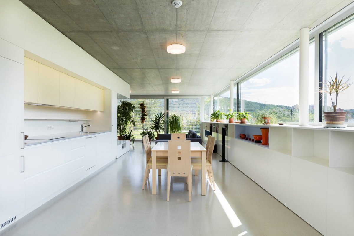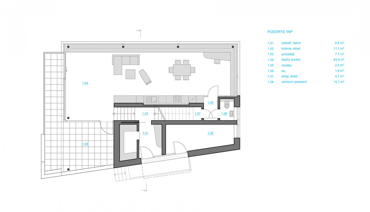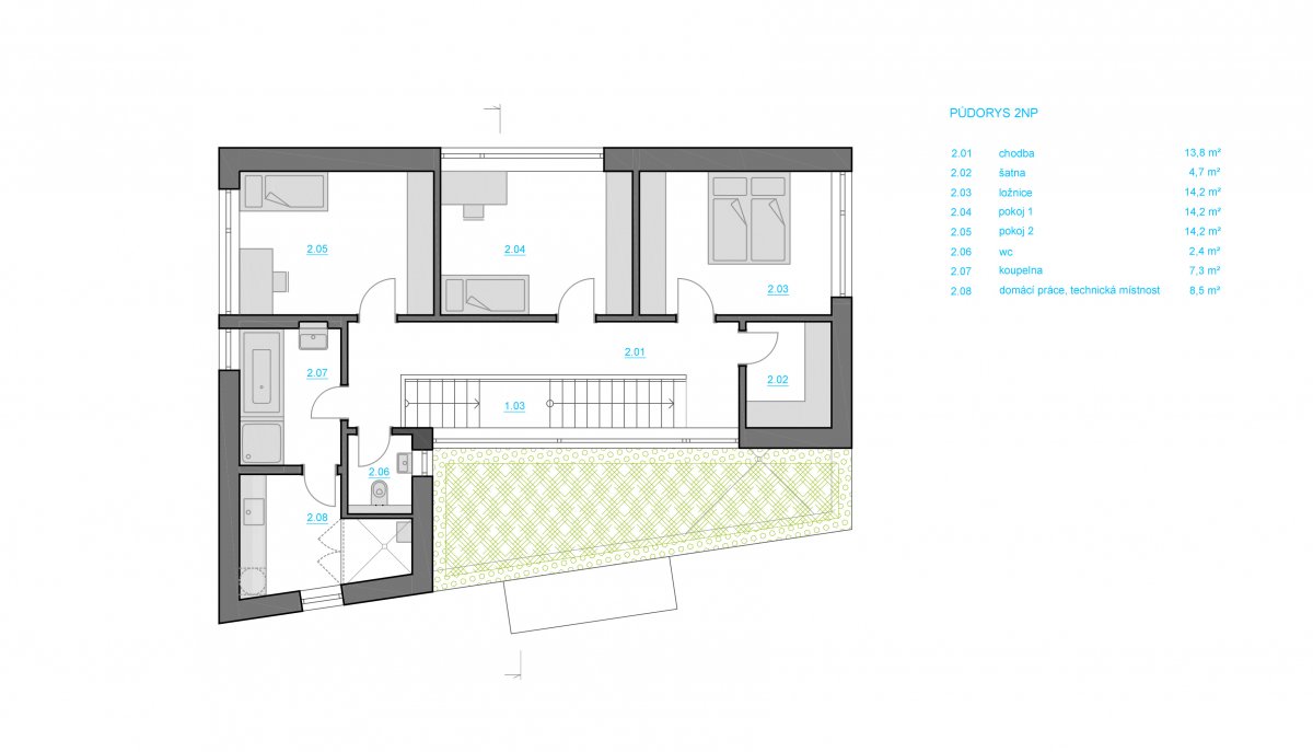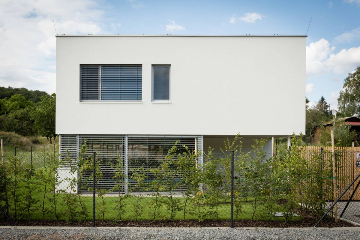 Na zapustenú terasu na prízemí nadväzuje veľkorysé posuvné presklenie a dlhé pásové okno smerujúce na západ, ktoré opticky oddeľuje hmotu druhého podlažia. Ľahkosť celého riešenia podčiarkujú materiály - biela omietka, hliníkové rámy s prírodným eloxom a pohľadové železobetónové steny.