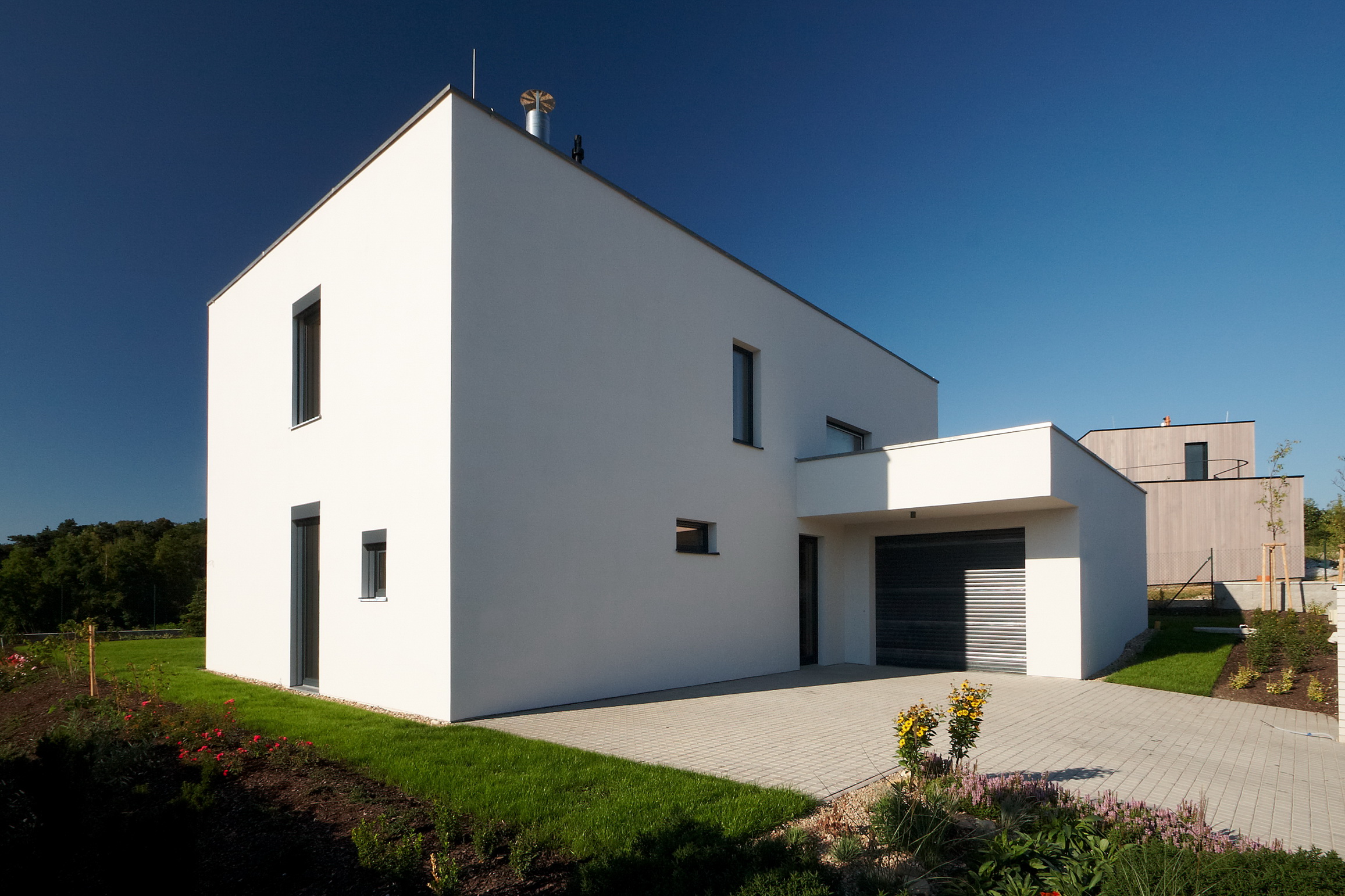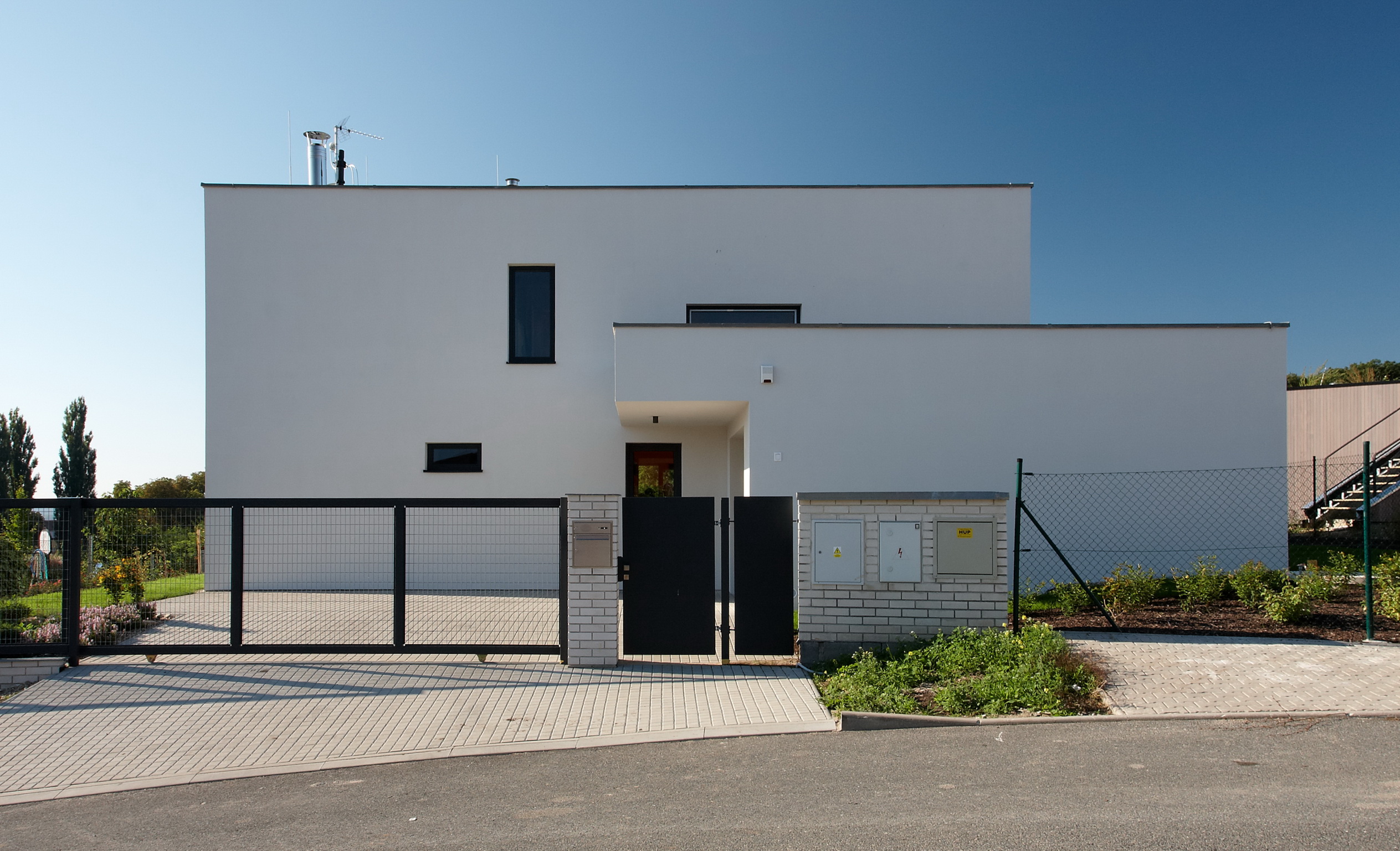 Dom je pomyselne rozdelený na tri časti – kvádre. Dominuje mu obytná časť, ku ktorej je prisadená hmota garáže a drevená konštrukcia pergoly nad terasou. Jednoduché konštrukčné riešenie ako aj detaily stavby sú realizované tradičnými spôsobmi. Dispozícia je plne účelná a ponúka vzhľadom na veľkosť domu komfortné vnútorné priestory. Expresívne členenie južnej fasády odráža vnútorné usporiadanie domu.