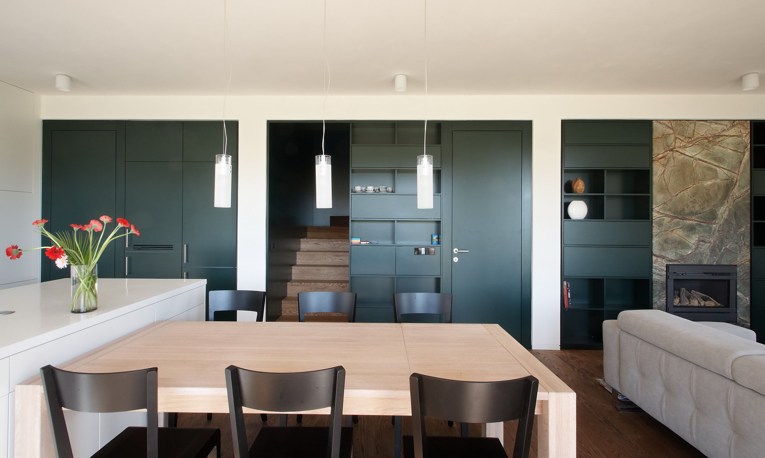 Majitelia domu, ktorí žili nejakú dobu v Londýne si so sebou priniesli anglické štandardy. Ich požiadavkou bol napríklad plynový krb, ktorý sa ale po diskusii s architektami nerealizoval. Jediný „úlet“ predstavuje miestnosť od začiatku koncipovaná ako telocvičňa, ktorú si majitelia vyslovene priali.