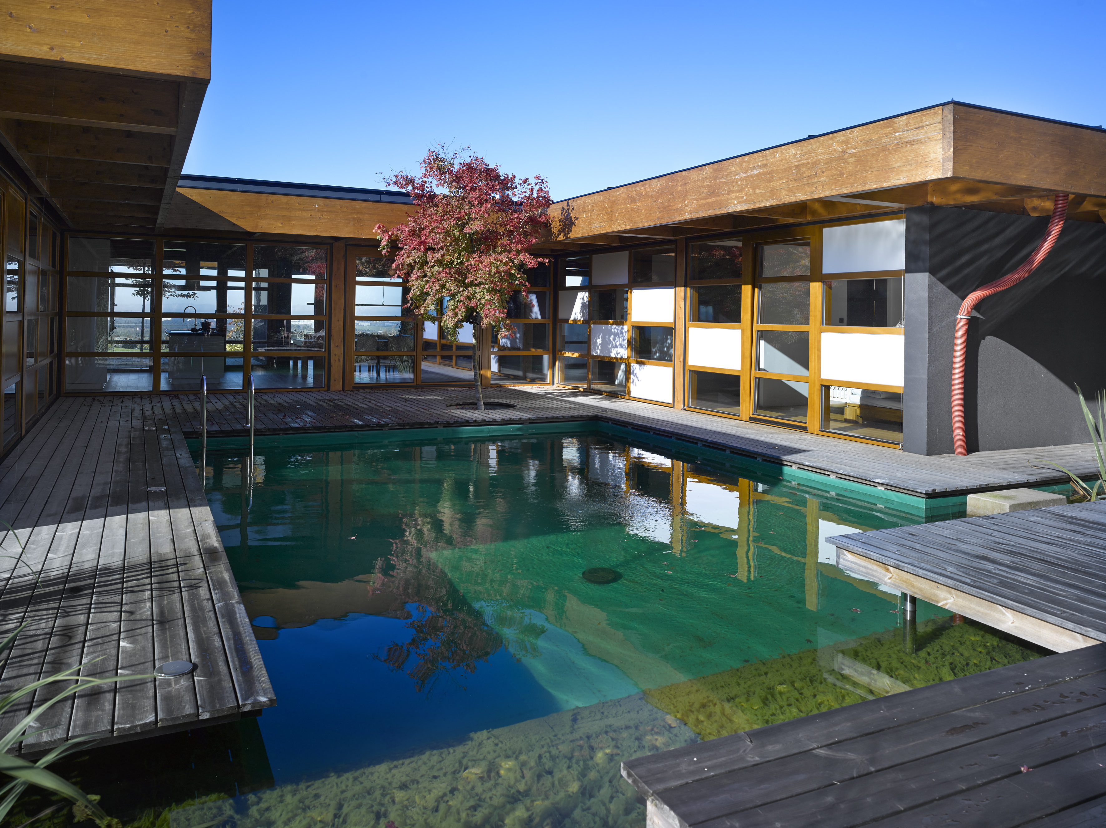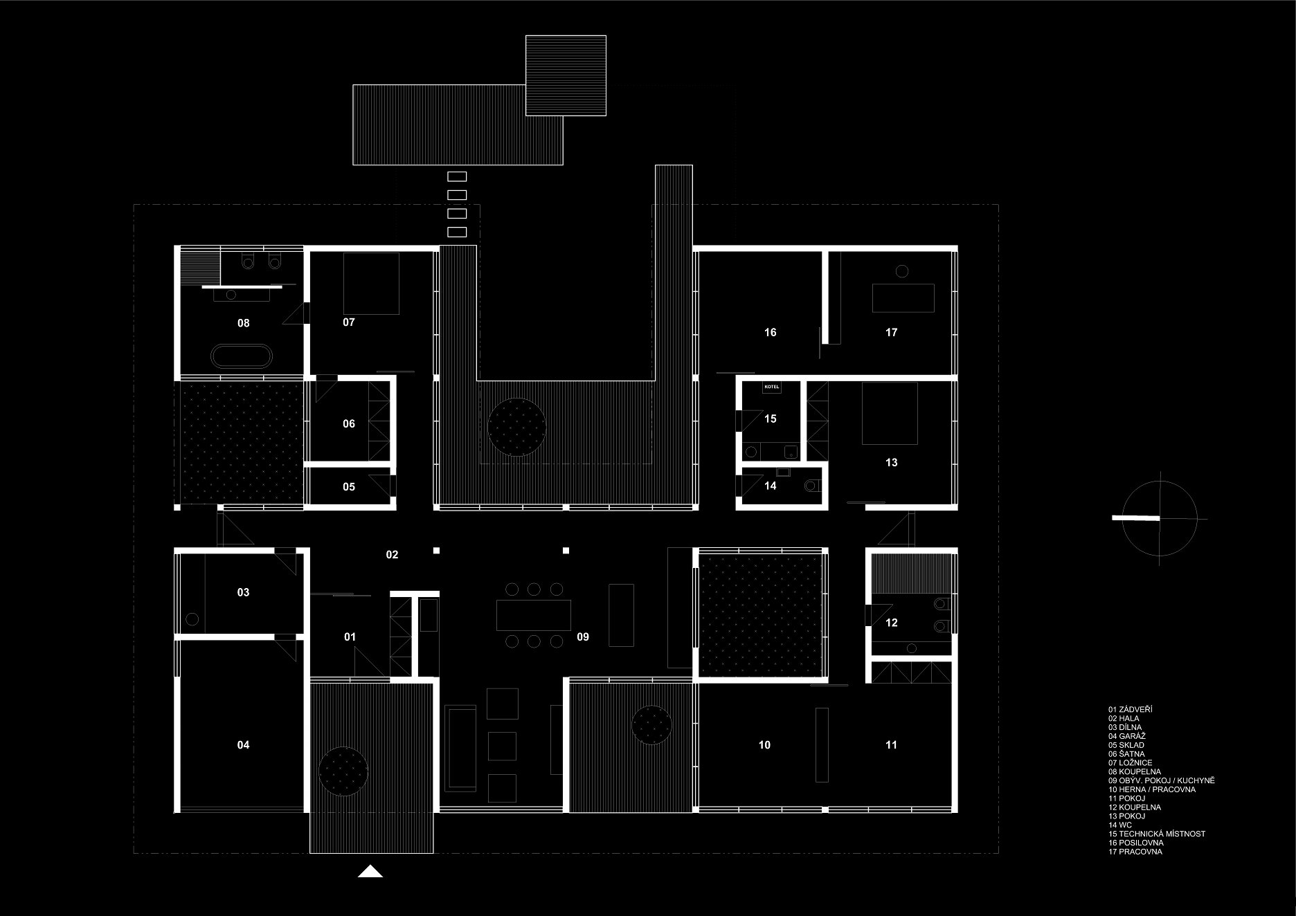 Vzhledem k charakteru a orientaci pozemku jsme od počátku koncepci domu směřovali k jednopodlažní hmotě s plochou střechou. Dispozici domu jsme rozdělili na dvě základní hmoty které propojuje hlavní obytný prostor s kuchyní a jídelnou. Toto řešení nám umožnilo dopřát jeho uživatelům naprosto přirozený pohyb mezi interiérem a exteriérem domu ze všech jeho stran. Vodní hladina umístěná v nejintimější zóně uzavřeného atria vyplynula přirozěně během práci na projektu, obvzláště když jsme zjistili že oba budoucí uživatelé kromě velmi kladnému vztahu k přírodě vodu zbožňují. Vodní hladina v hlavním vnitřním atriu se díky její orientaci v letních měsících chová jako přirozený chladič dodávající do domu příjemné klima. Ze strany investora přišel nápad využít plochou střechu pro umístění fotovoltaické elektrárny.