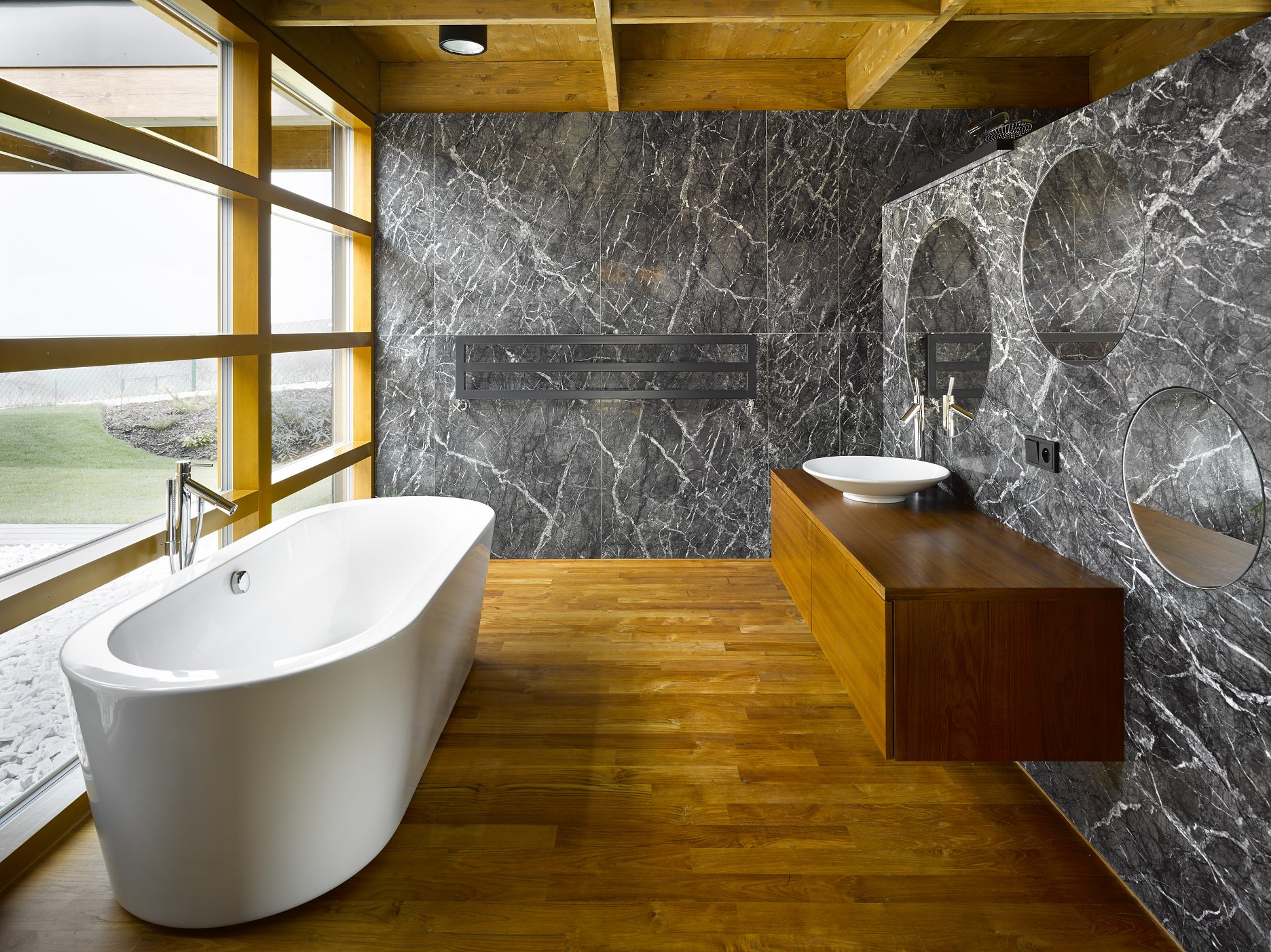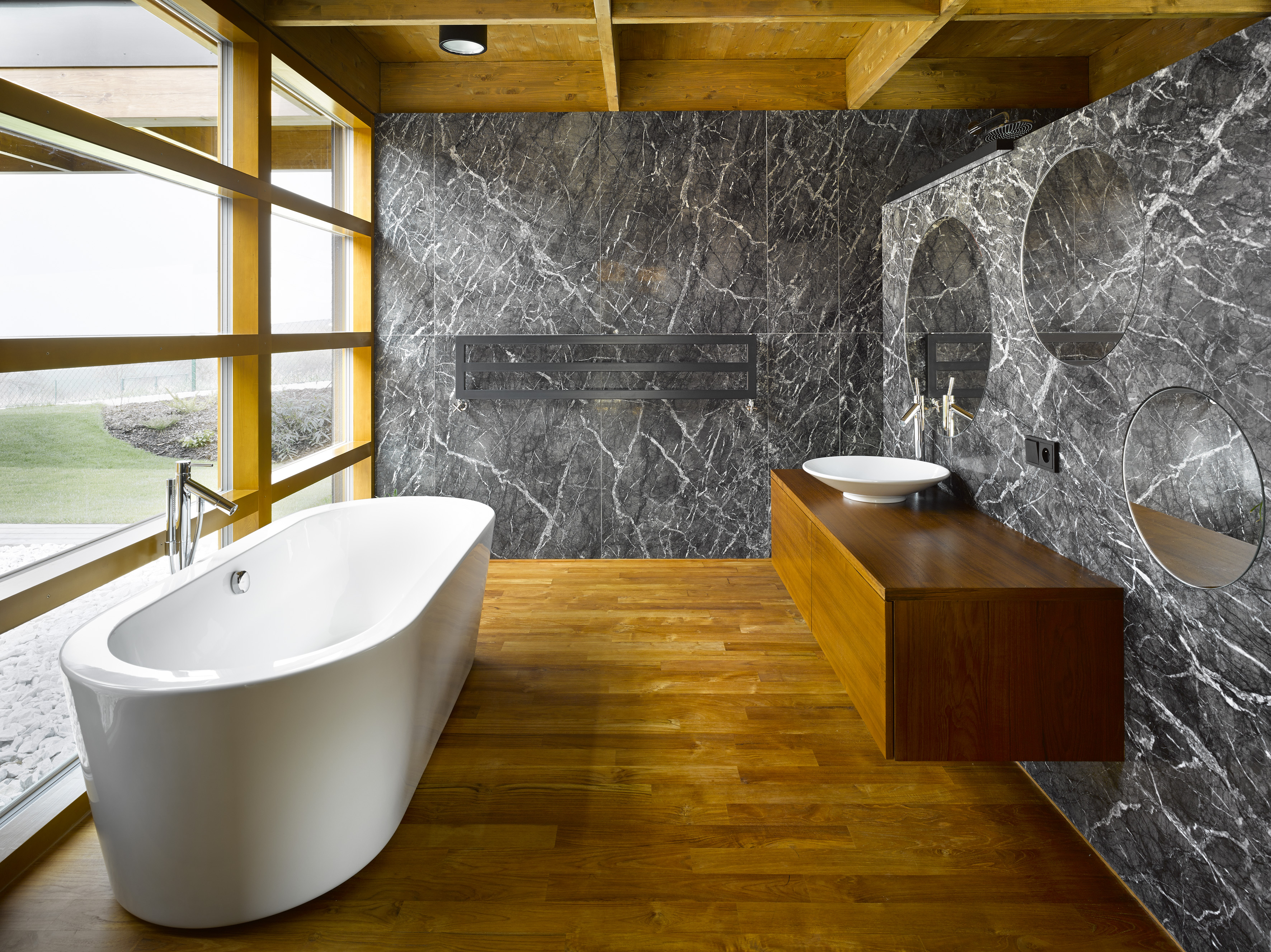 Ačkoliv první vize architektů měli v pravdě o něco skromnější parametry, nadšení investora a jeho osobní interest dodal projektu poněkud velkorysejší charakter. V žádném případě se však nejednalo o nějakou bezmyšlenkovou okázalost – v hlavní roli tohoto projektu totiž nebyly drahé materiály, nýbrž poctivě a čistě zpracované detaily. “Neuvažovali jsme nad tím, že by v koupelně mohl být přírodní kámen, protože to není levná záležitost. Navrhovali jsme dům pro dva mladé lidi, kteří se chystají založit rodinu. Investor ale sám přišel s tím, že by něco takového chtěl a že má možnost sehnat pěkný kámen za dobrou cenu a také se tak stalo,” vysvětlují architekti.