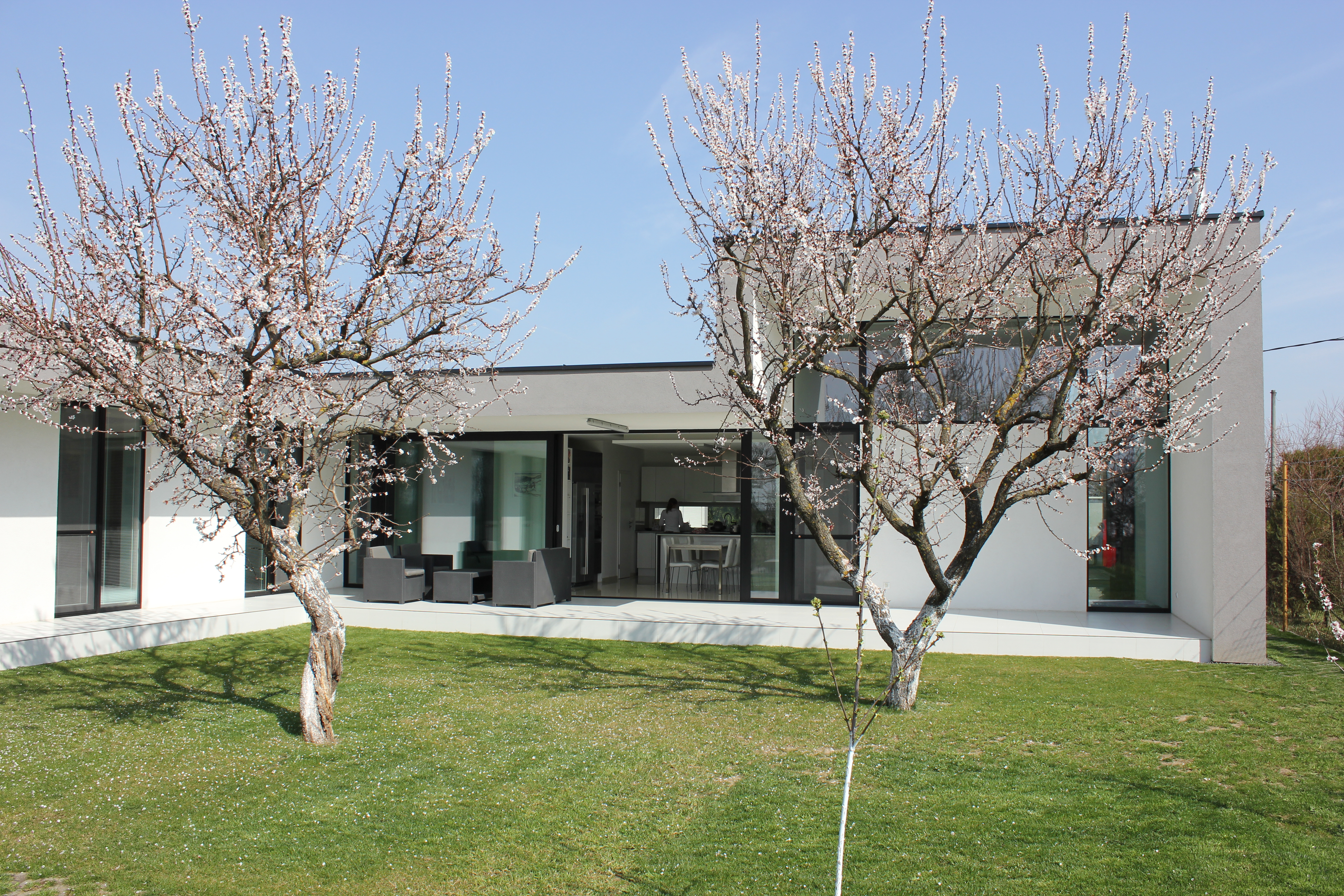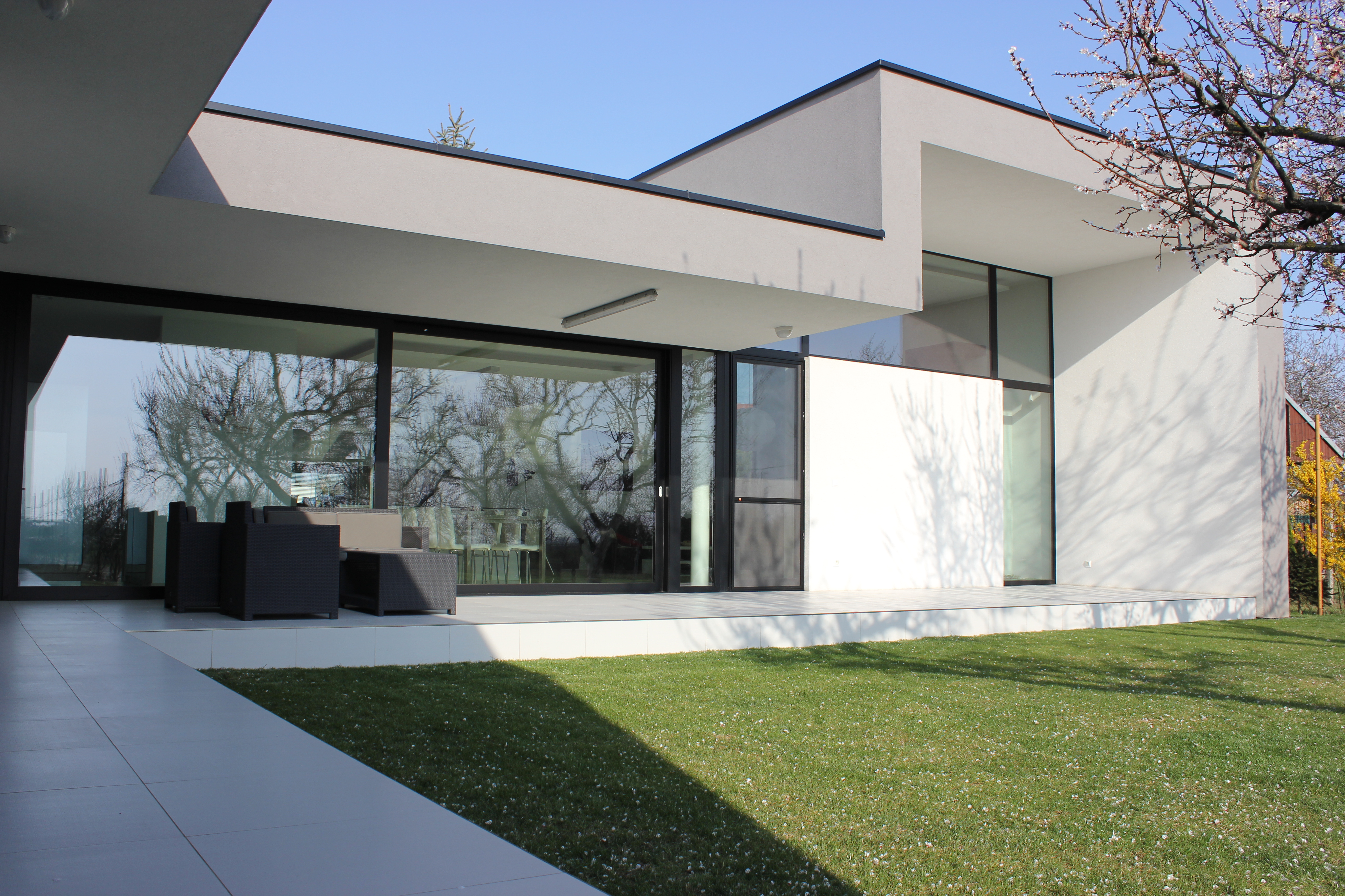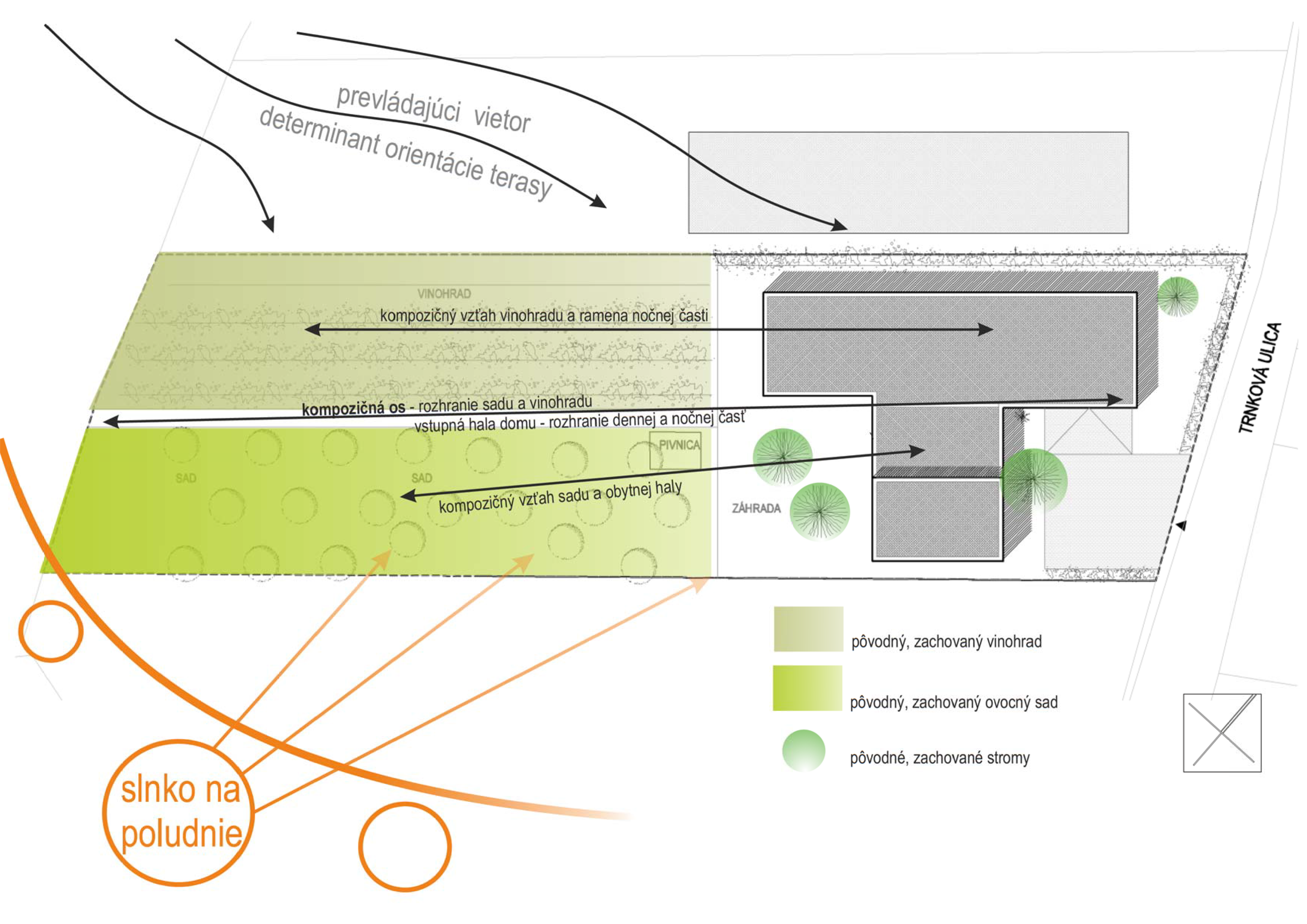 Architektonické riešenie domu bolo výrazne determinované existujúcou záhradou, tvarom a orientáciou parcely. Prízemný dom v pôdorysnom tvare T vytvára 3 funkčné zóny: dennú časť v hlavnom, objemovo dominantnom krídle, nočnú časť orientovanú do záhrady a časť s technickým a skladovým zázemím. Hmotovo priestorové riešenie korešponduje so záhradou v zadnej časti parcely, ktorá pozostáva z vinohradu, sadu a rekreačnej zatrávnenej plochy. Všetky tri časti záhrady sú reflektované v hmote domu, ktorá zároveň citlivo ustupuje pôvodným stromom. Dom pôsobí zo strany ulice skôr ako introvert s priestranným predpolím, avšak z juhozápadnej strany sa maximálne otvára do atraktívnej záhrady so sadom. Akcentom celkovej hmotovej kompozície domu je prevýšený objem obytnej haly tvoriaci kontinuálny priestor s obytnou kuchyňou.