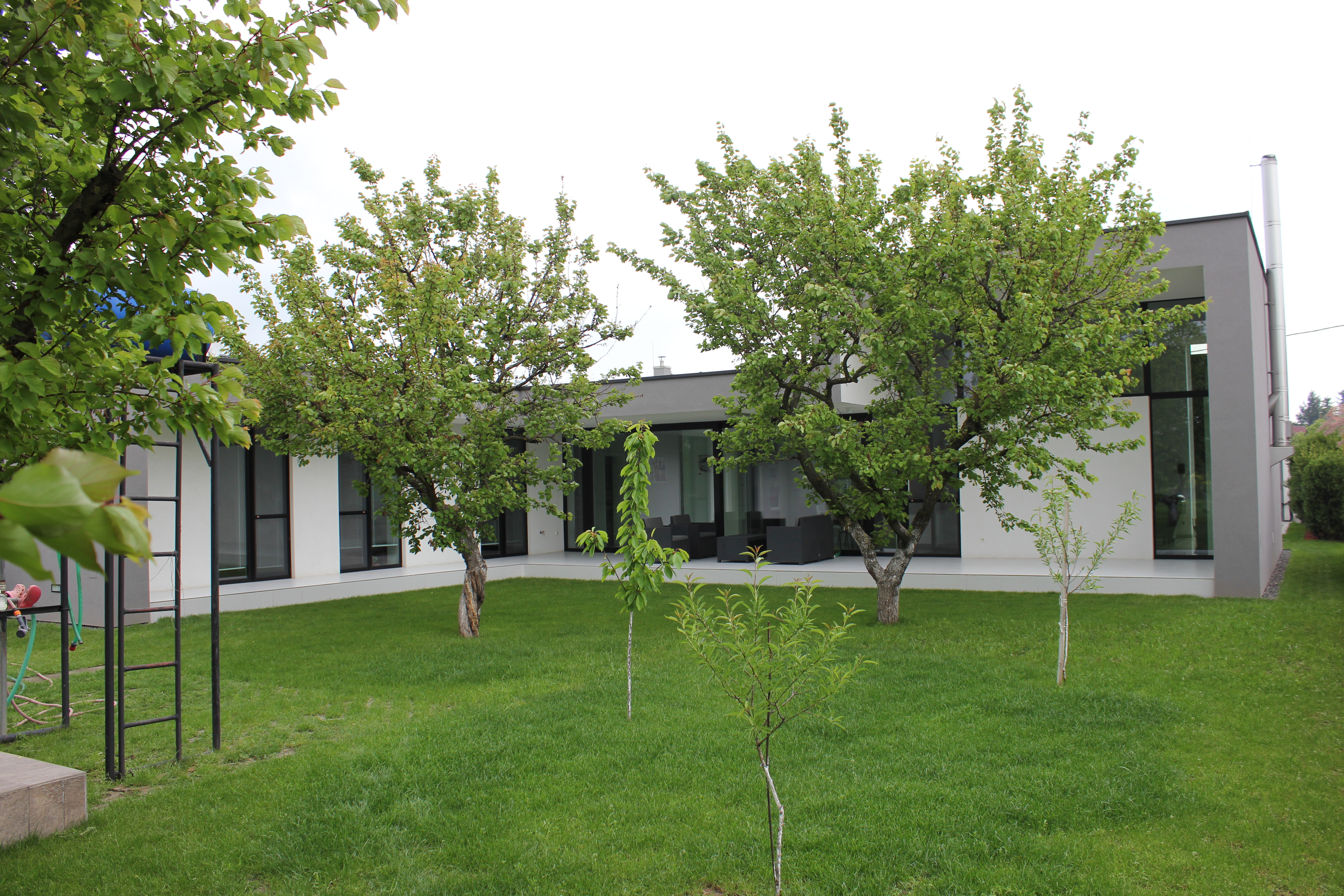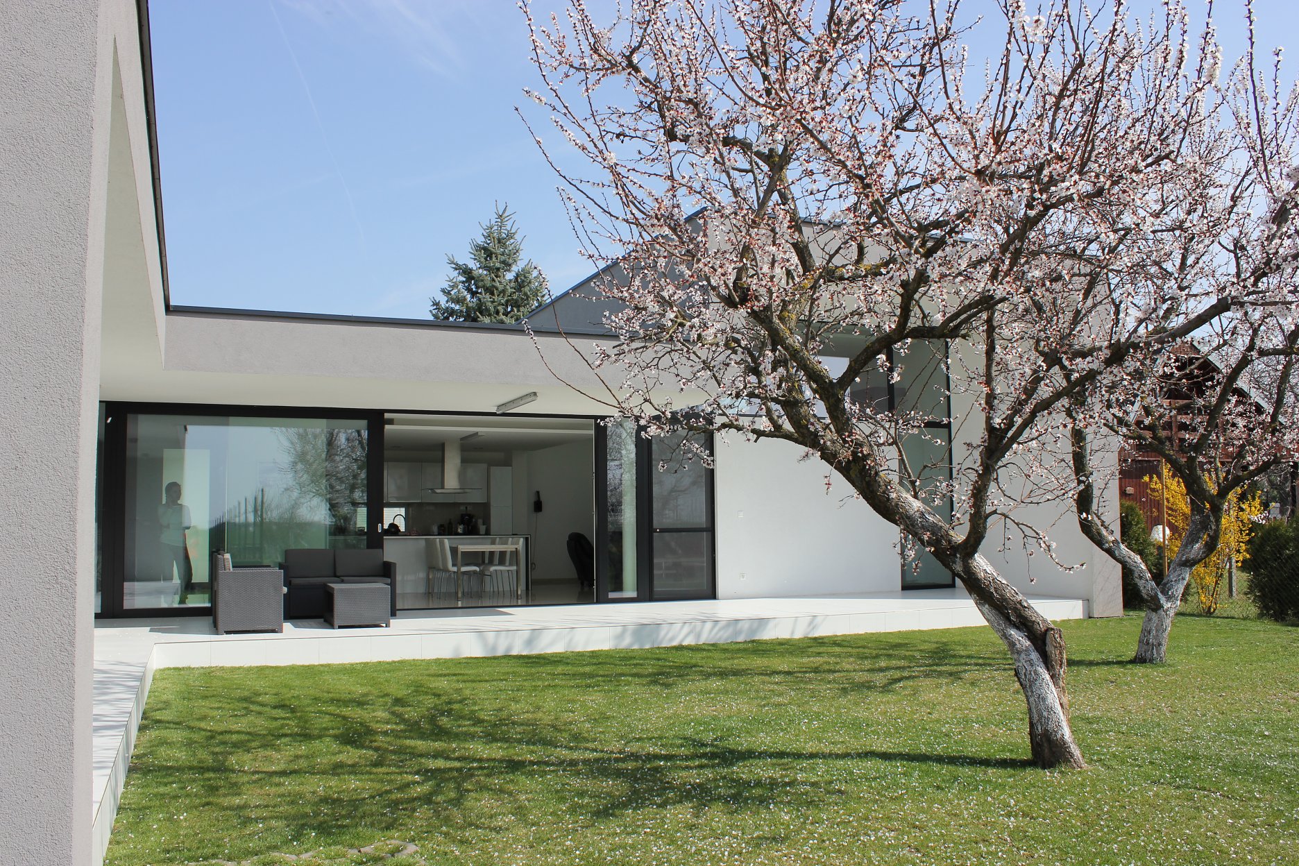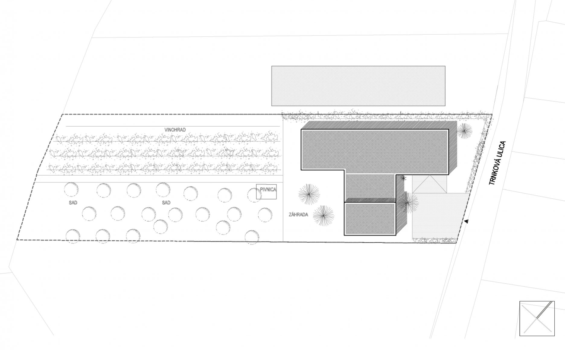 Architektonické riešenie domu bolo výrazne determinované existujúcou záhradou, tvarom a orientáciou parcely. Prízemný dom v pôdorysnom tvare T vytvára 3 funkčné zóny: dennú časť v hlavnom, objemovo dominantnom krídle, nočnú časť orientovanú do záhrady a časť s technickým a skladovým zázemím. Hmotovo priestorové riešenie korešponduje so záhradou v zadnej časti parcely, ktorá pozostáva z vinohradu, sadu a rekreačnej zatrávnenej plochy. Všetky tri časti záhrady sú reflektované v hmote domu, ktorá zároveň citlivo ustupuje pôvodným stromom. Dom pôsobí zo strany ulice skôr ako introvert s priestranným predpolím, avšak z juhozápadnej strany sa maximálne otvára do atraktívnej záhrady so sadom. Akcentom celkovej hmotovej kompozície domu je prevýšený objem obytnej haly tvoriaci kontinuálny priestor s obytnou kuchyňou.