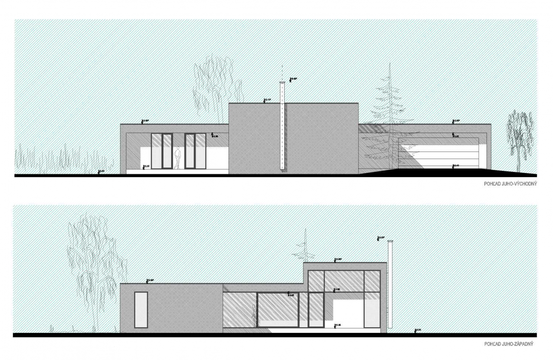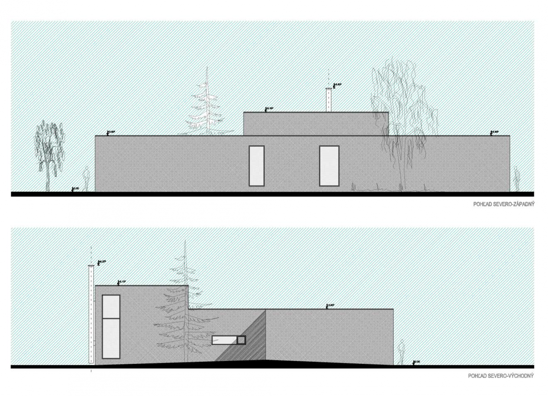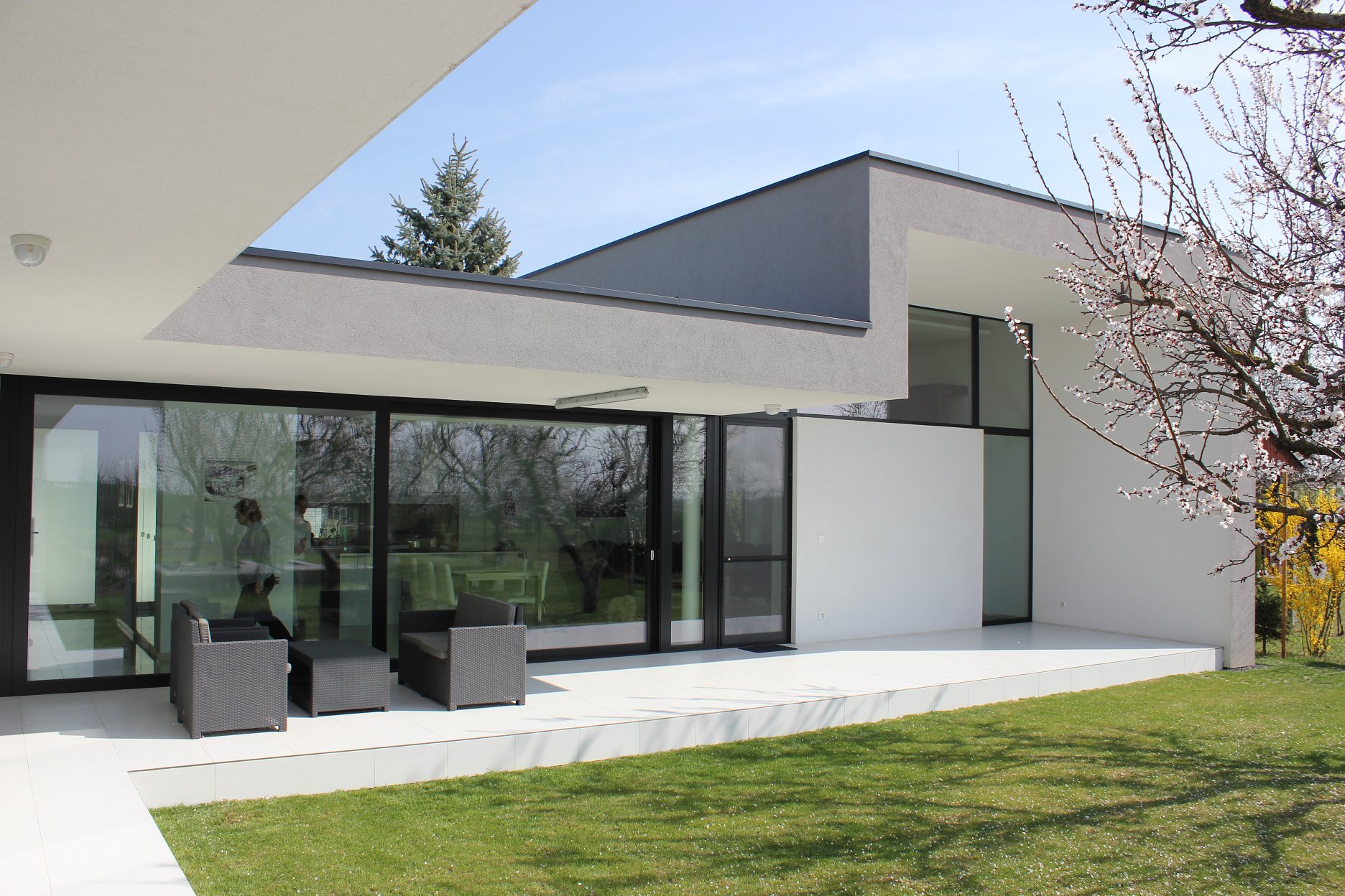 Architektonické stvárnenie korešponduje s jednoduchou a prehľadnou dispozíciou domu. Architektonický výraz domu je postavený na racionálnom striedaní plných a transparentných plôch, ktoré sú podporené výraznými konzolami strechy. Prekrytie terás nie je svojvoľné, ale vďaka vhodnej orientácií terás a stropných konzol dostatočne kompenzuje potrebu vonkajšieho tienenia. Jednoduchá a jednoznačná kombinácia šedej a bielej omietky podporuje jednoduchosť riešenia celkového konceptu.