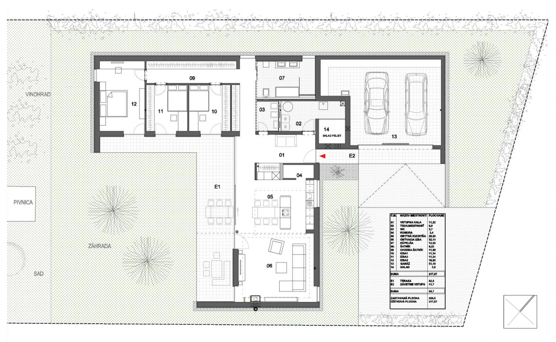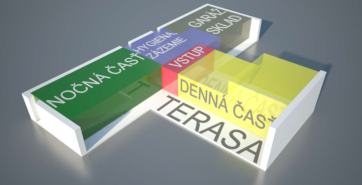 Prevádzkovo dispozičné riešenie rodinného domu je rozvrhnuté do 3 funkčných zón v rámci jedného nadzemného podlažia. Na rozhraní dennej a nočnej časti sa logicky nachádza vstupná hala. Denná zóna obsahuje obývaciu izbu, obytnú kuchyňu s jedálňou a krytú priestrannú terasu. Nočná časť obsahuje 3 izby, prechodný šatník, pohotovostné WC a kúpeľňu. Skladové zázemie sa skladá z dvojgaráže, skladu peliet a technickej miestnosti. Vstupné a technické priestory sú orientované do uličnej časti. Obytné priestory sú orientované do súkromnej časti záhrady.