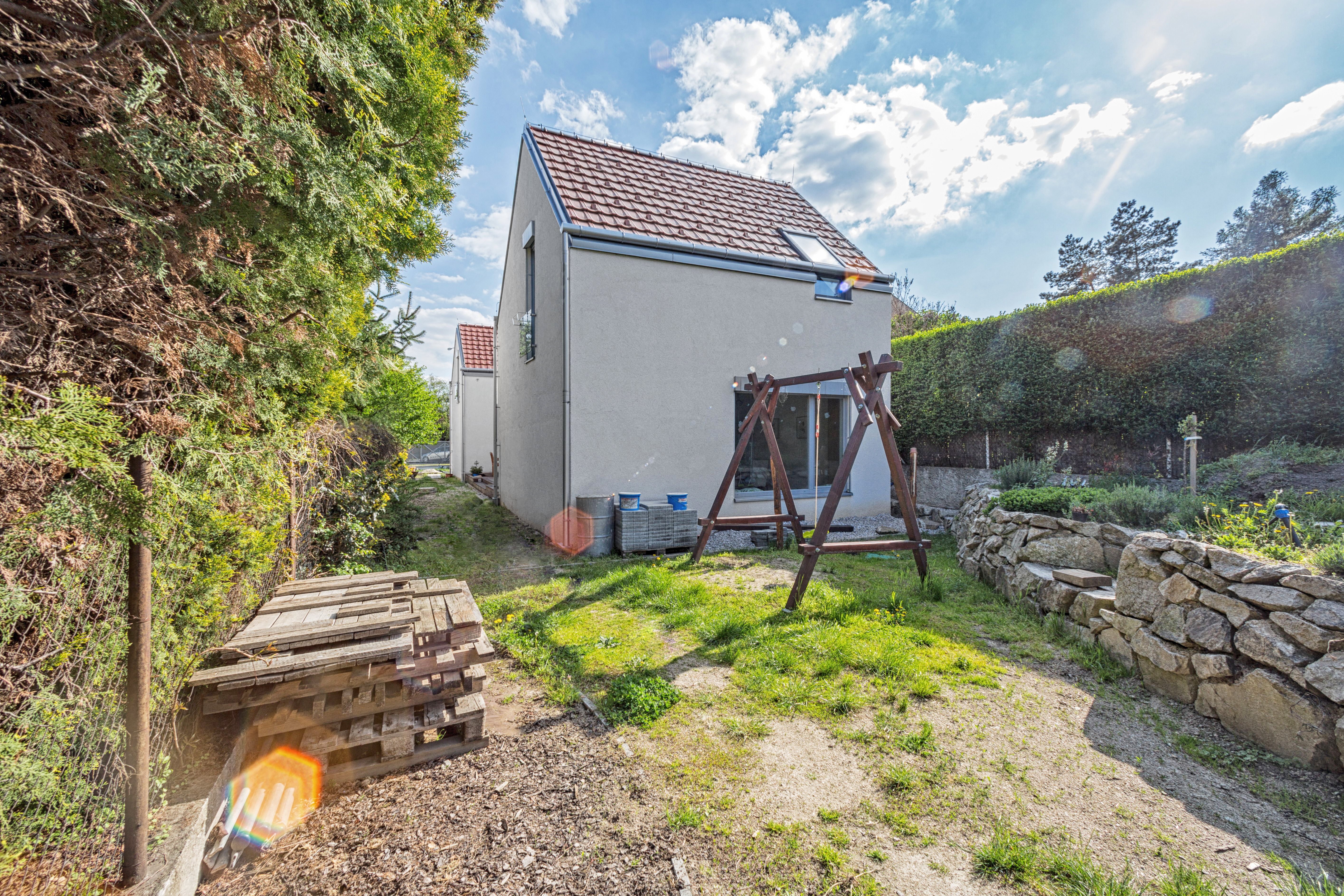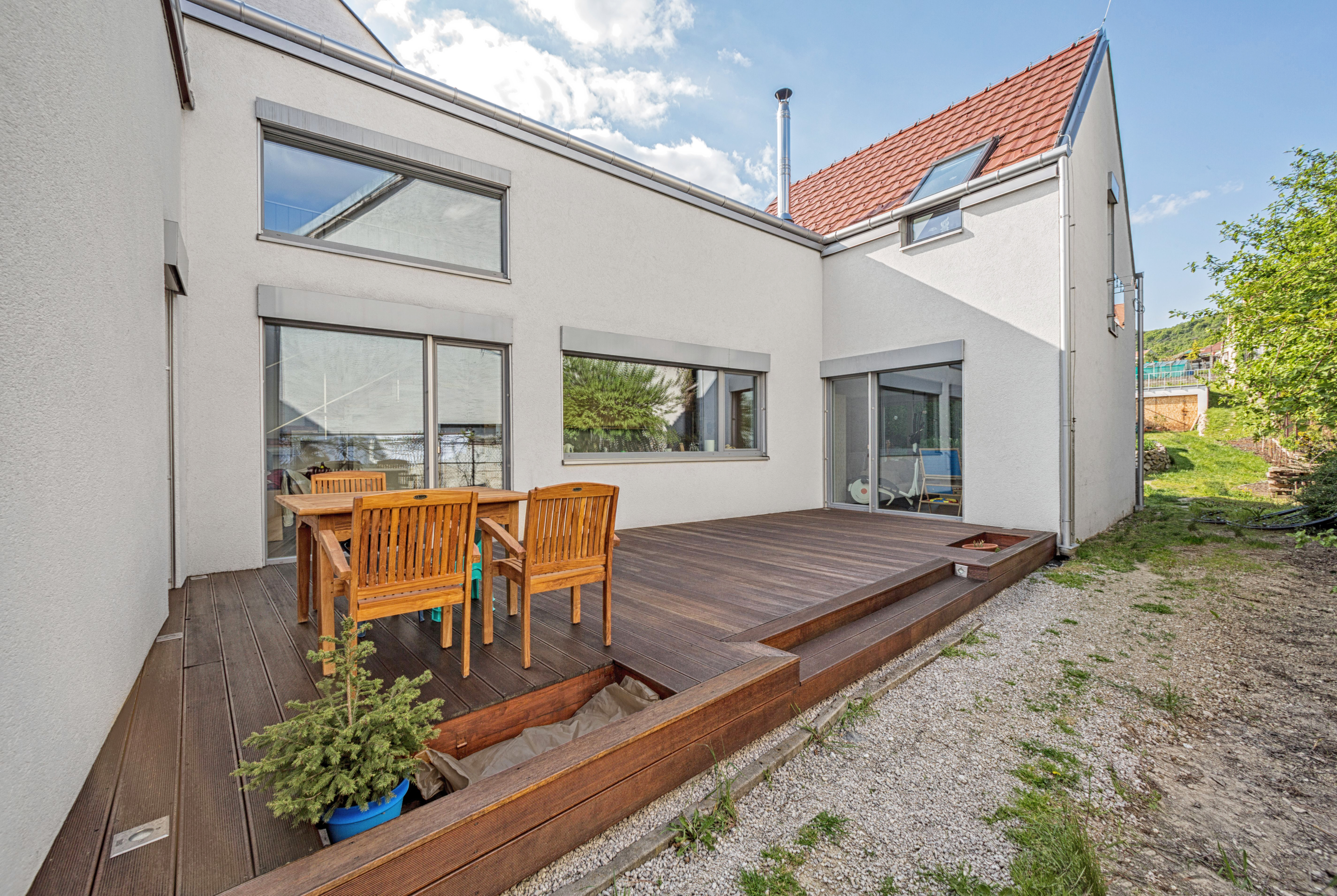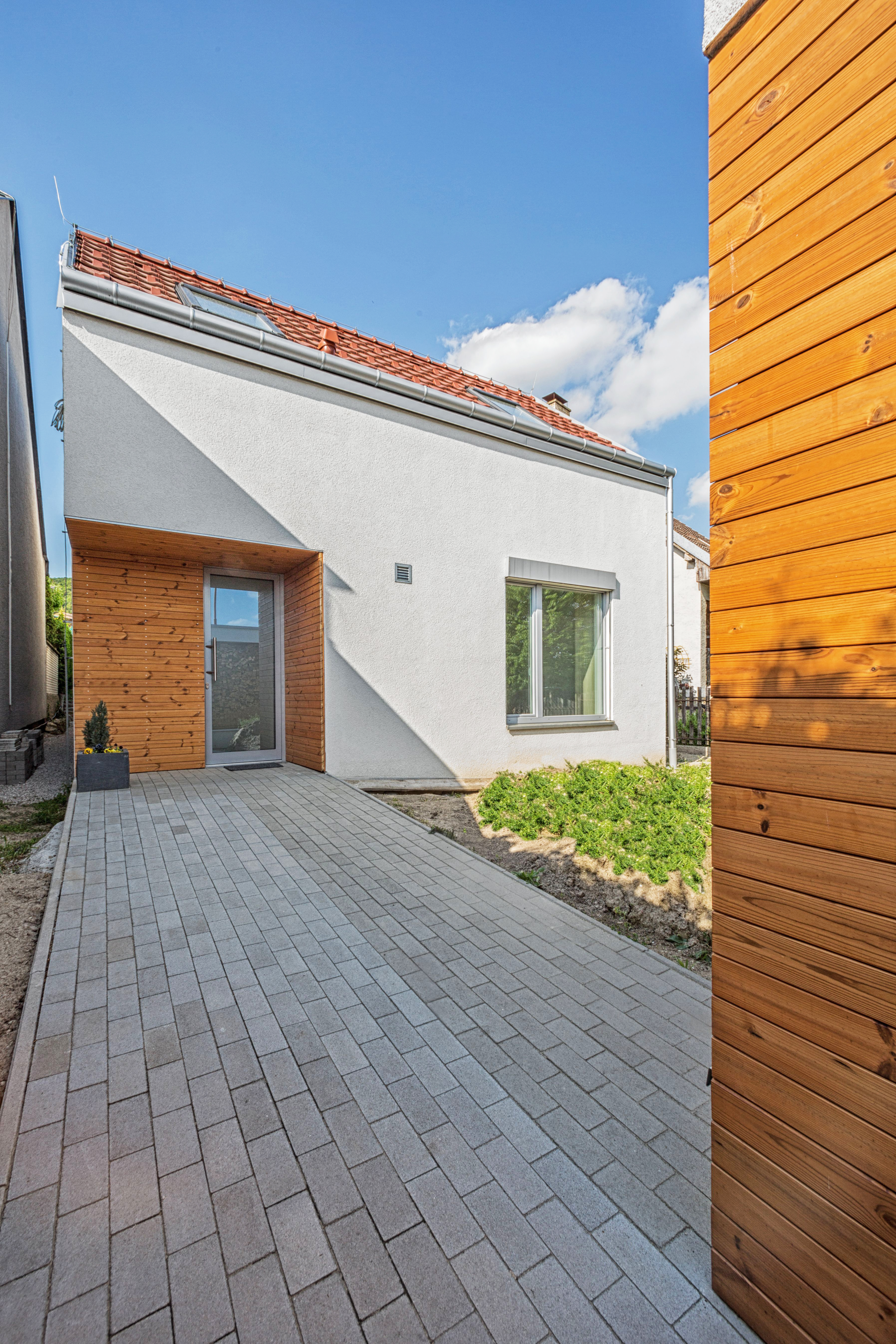 Keďže dom sa nachádza v ochrannom pásme PZ boli použité jednoduché materiály charakteristické pre centrálnu zónu: omietka a pálená škridla. Výraz a detail fasáde dodávajú klampiarske prvky. Ďalšiu vrstvu bude v budúcnosti tvoriť porast štítových stien a garáže z paviniča, ktorý odkazuje na vinohradnícku tradíciu v obci.