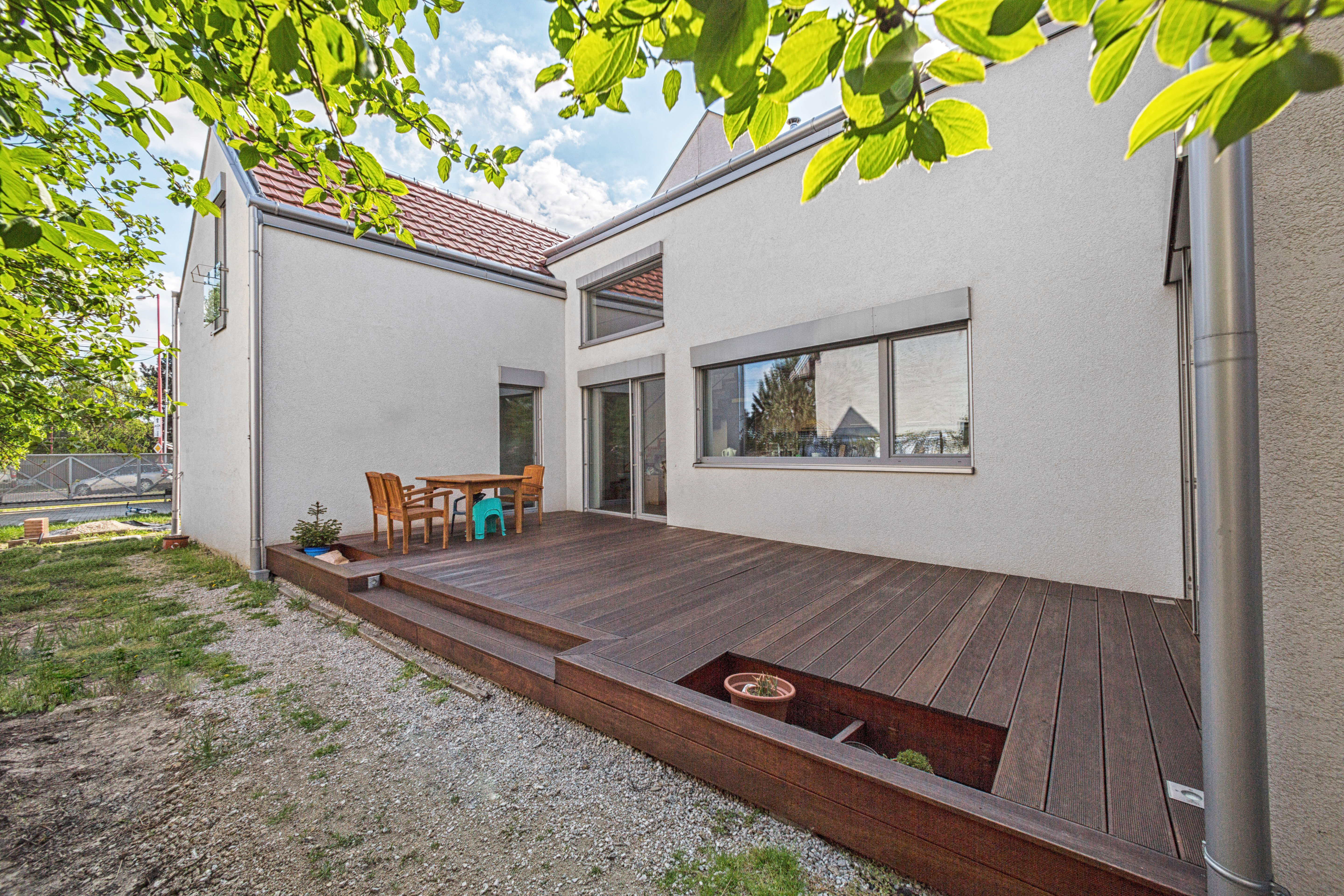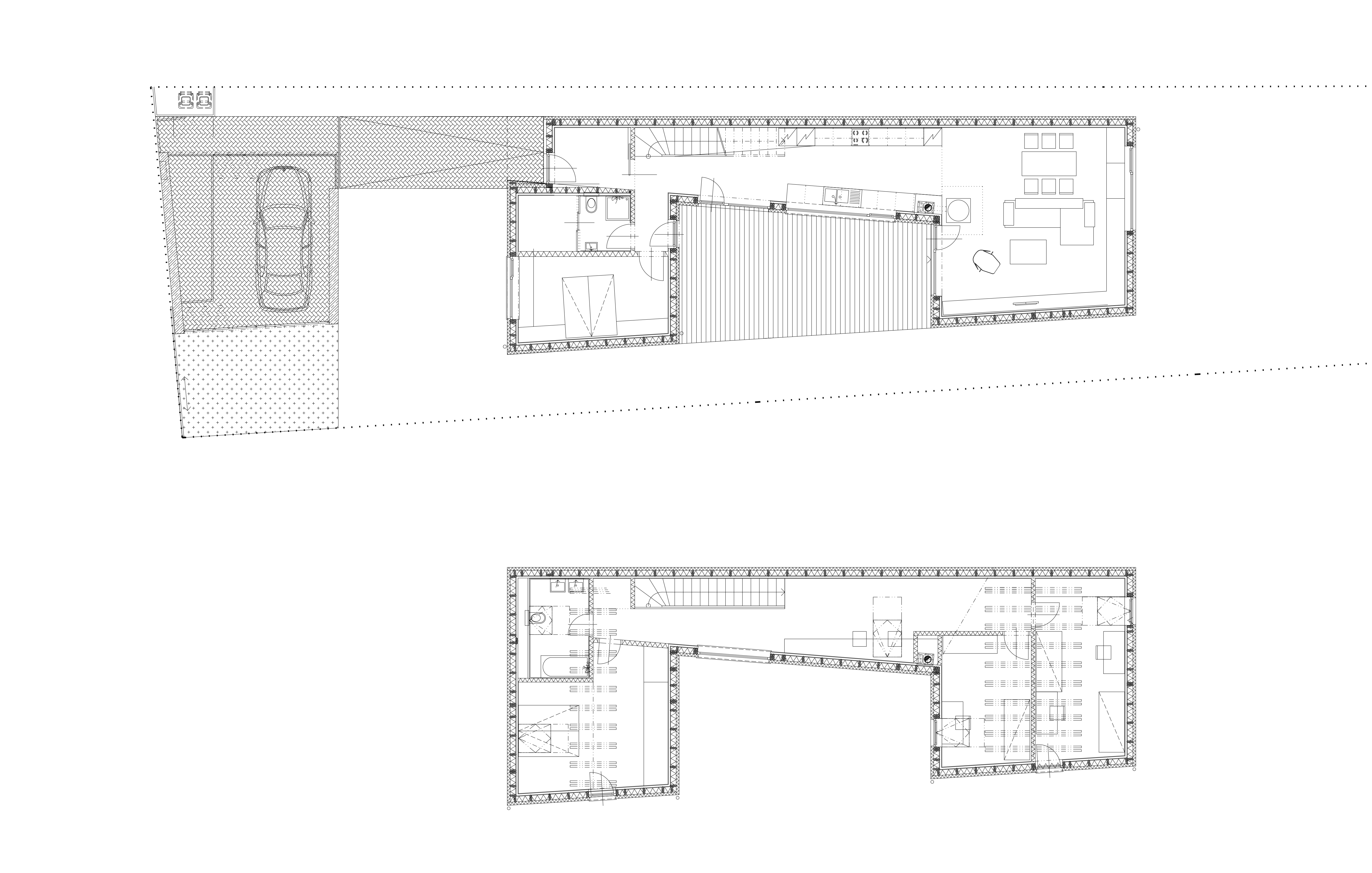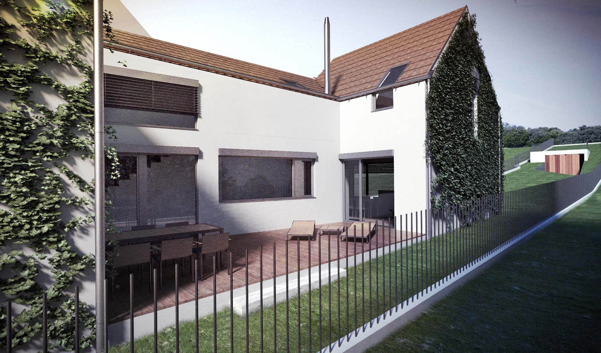 Na úzkej parcele tienenej okolitými budovami, navyše s problematickou orientáciou, bolo hlavnou úlohou dostať do domu svetlo a odhlučniť dom od frekventovaného dopravného ťahu Bratislava - Modra. To viedlo k osadeniu samostatnej garáže na začiatok pozemku a vytvoreniu vnútorného pátia, ktoré rozdeľuje objem domu na dennú a nočnú časť. Obe časti spája postupne sa rozširujúci krčok, kde sa nachádza priechodná kuchyňa, so schodiskom. Na poschodí je v spojovacej časti pracovný kút, ktorý spája detské izby. Do pátia smerujú okná takmer zo všetkých priestorov s cieľom zachytiť čo najviac priameho svetla a stalo sa „nekorunovanou“ najdôležitejšou izbou.