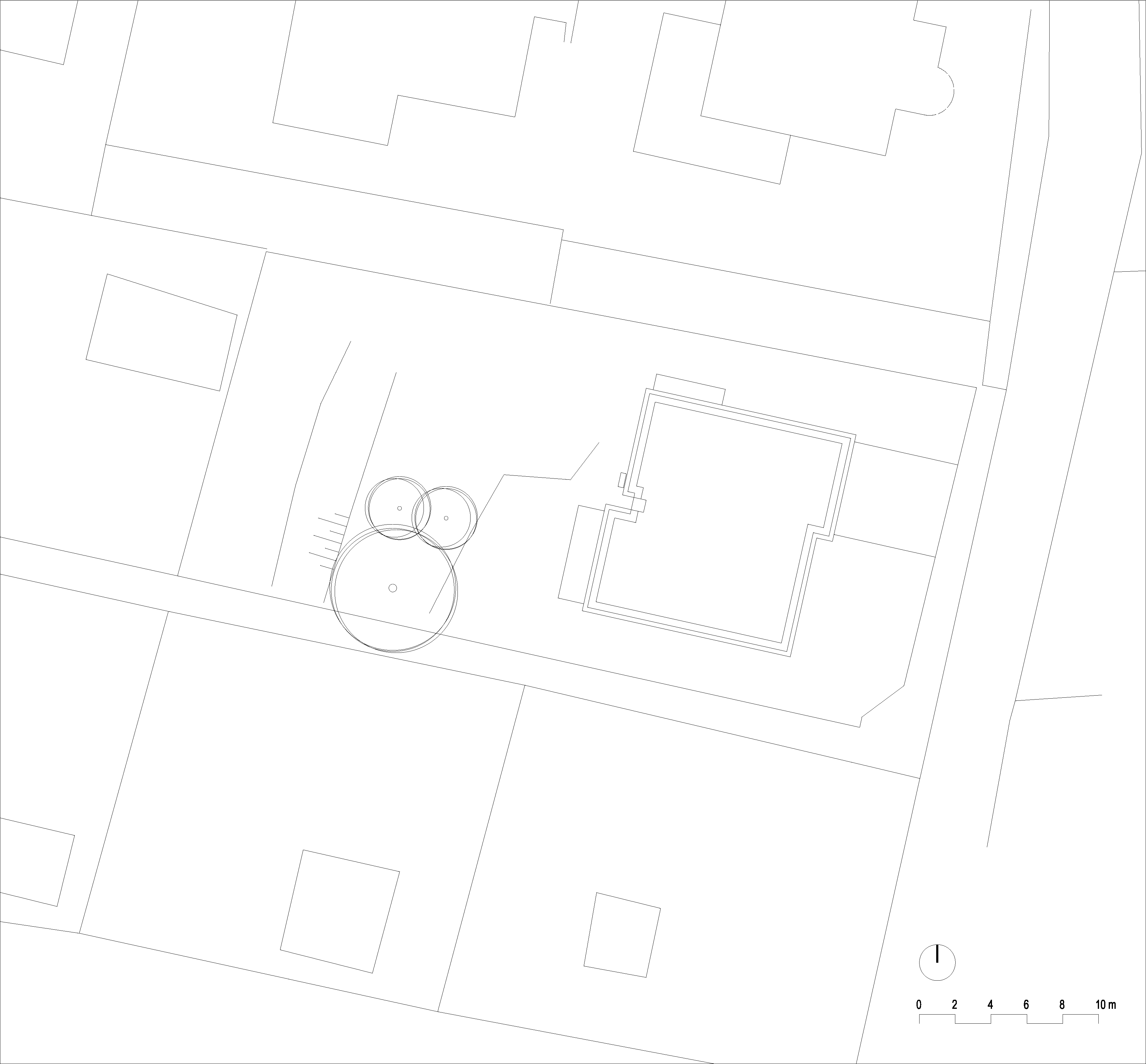 Protáhlá parcela situována na rozhraní zahrádkářské kolonie a původní zástavby rodinnými domy se svažuje k severozápadu a nabízí výhled na protější zalesněný horizont a východní okraj města. Osazení domu využívá přirozený průběh terénu a rozděluje jeho provoz do tří samostatných celků.
